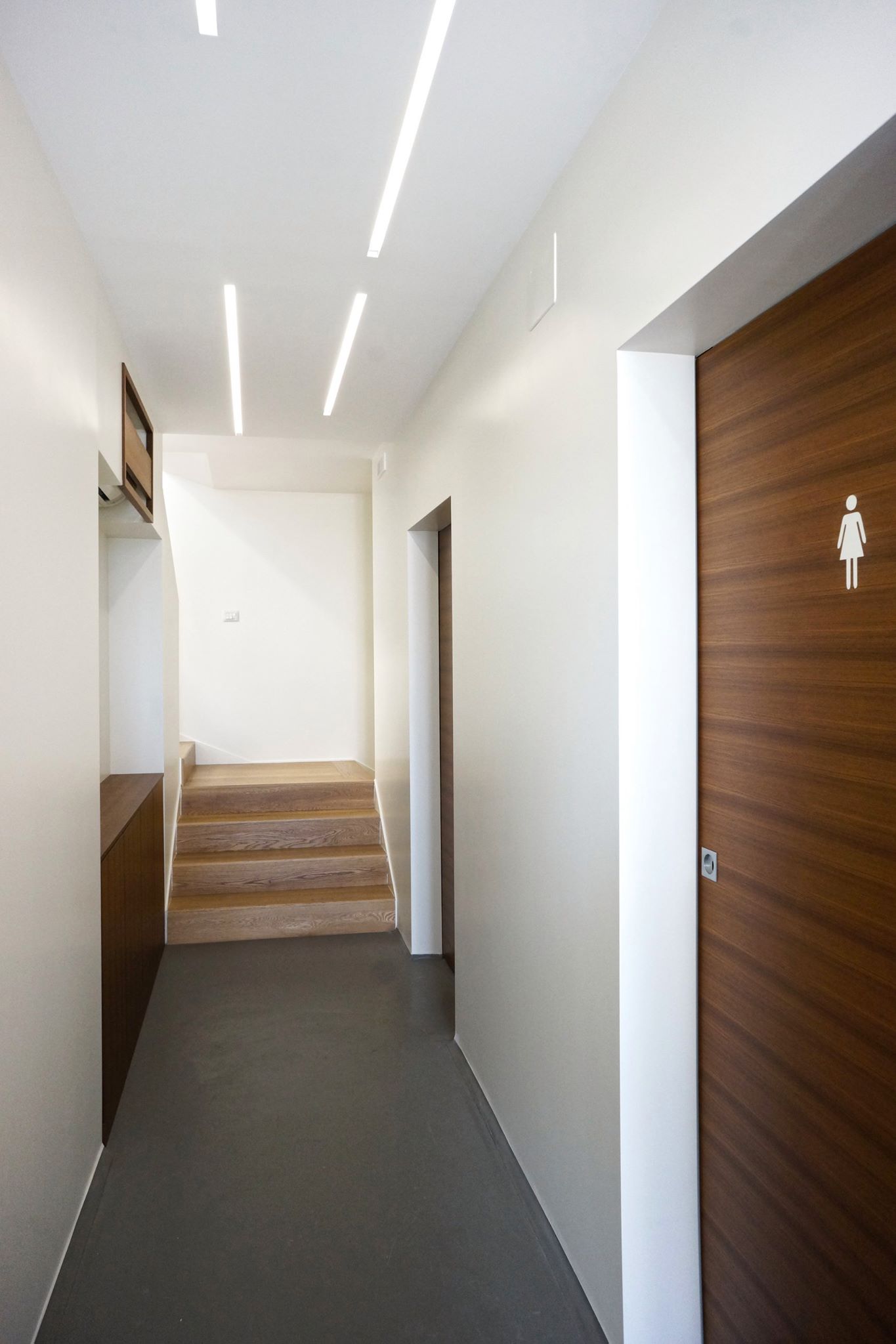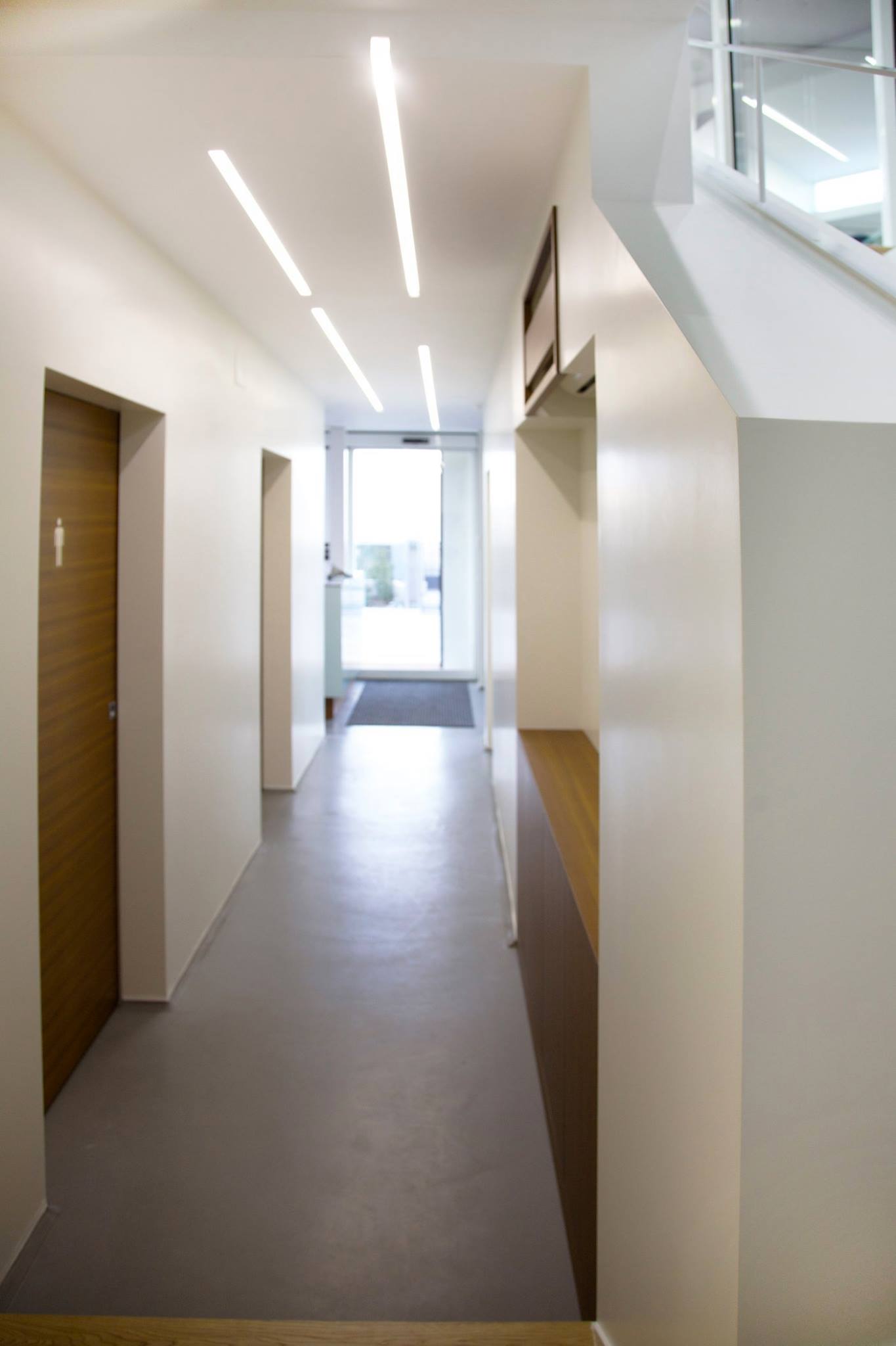 Alla scatola di vetro si accede attraverso il livello zero dello stabile, tramite un ingresso che funge da front office. Sullo stesso livello si trovano anche i servizi igienici e gli spogliatoi per il personale. Un pavimento in resina si contrappone alle pareti bianche ed ai rivestimenti in teak delle boiseries.