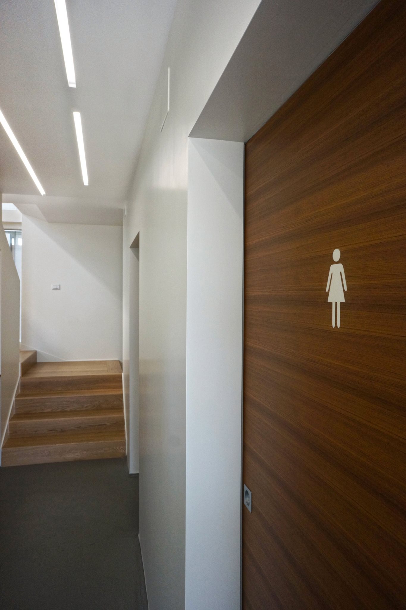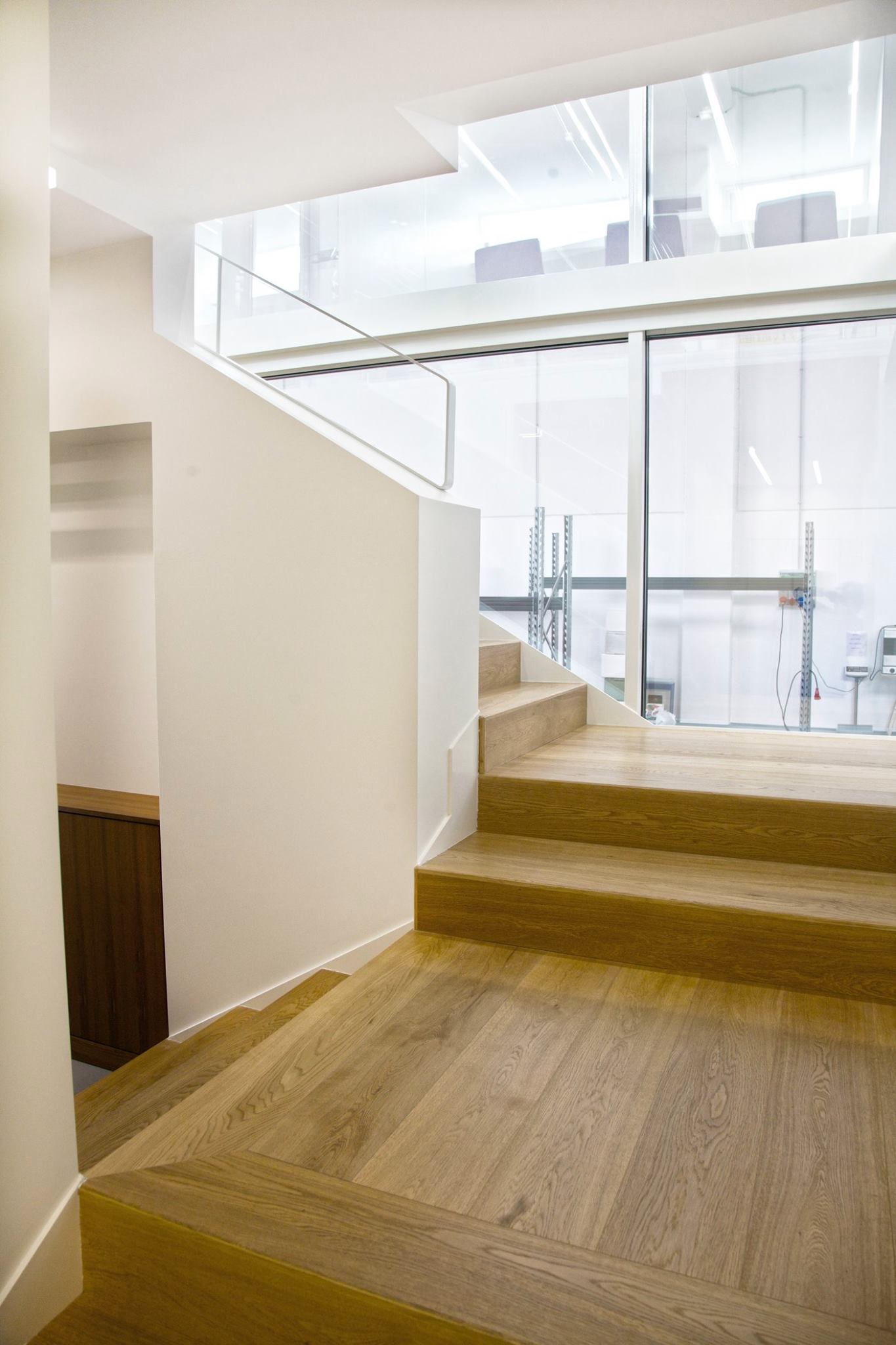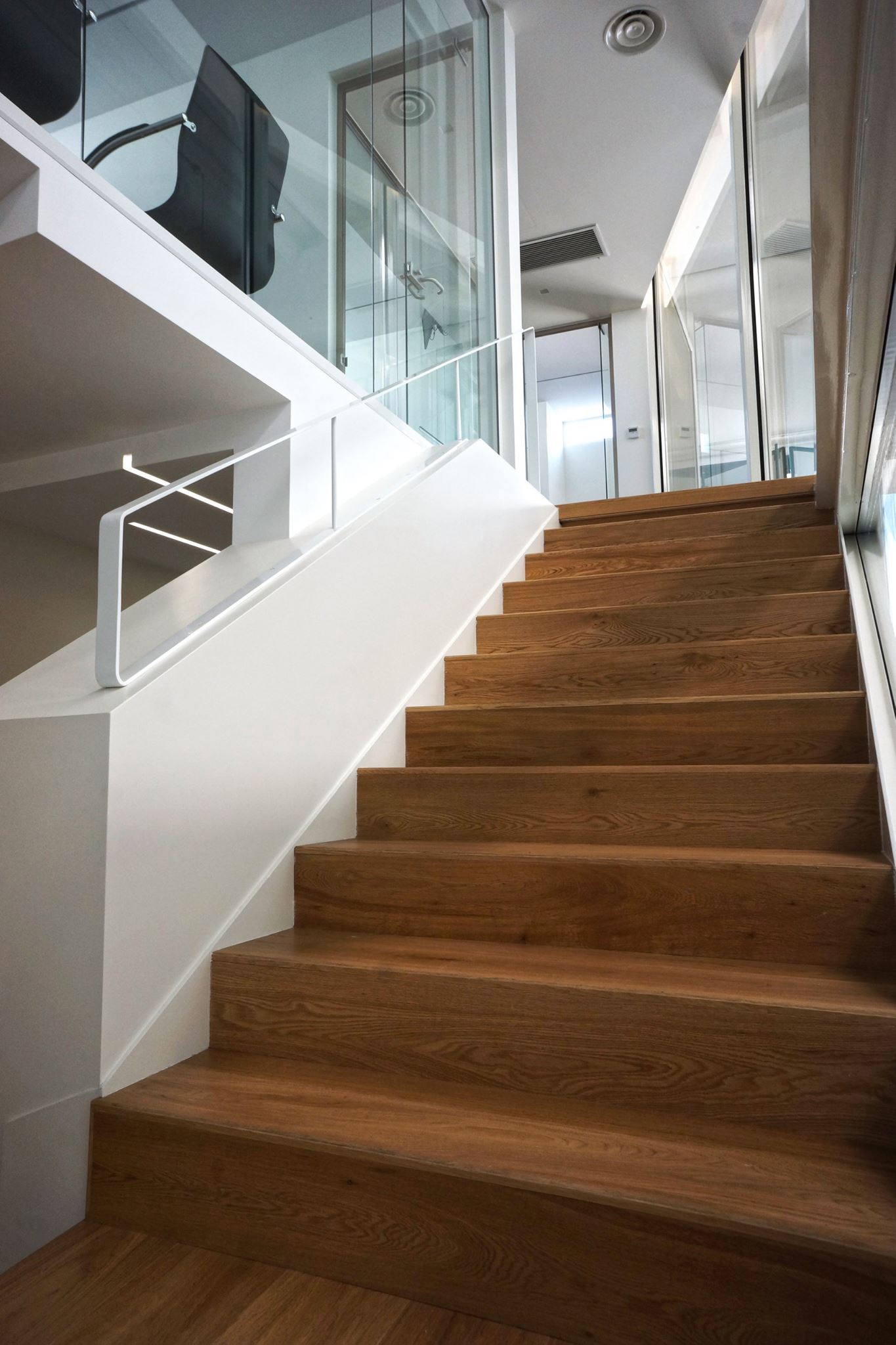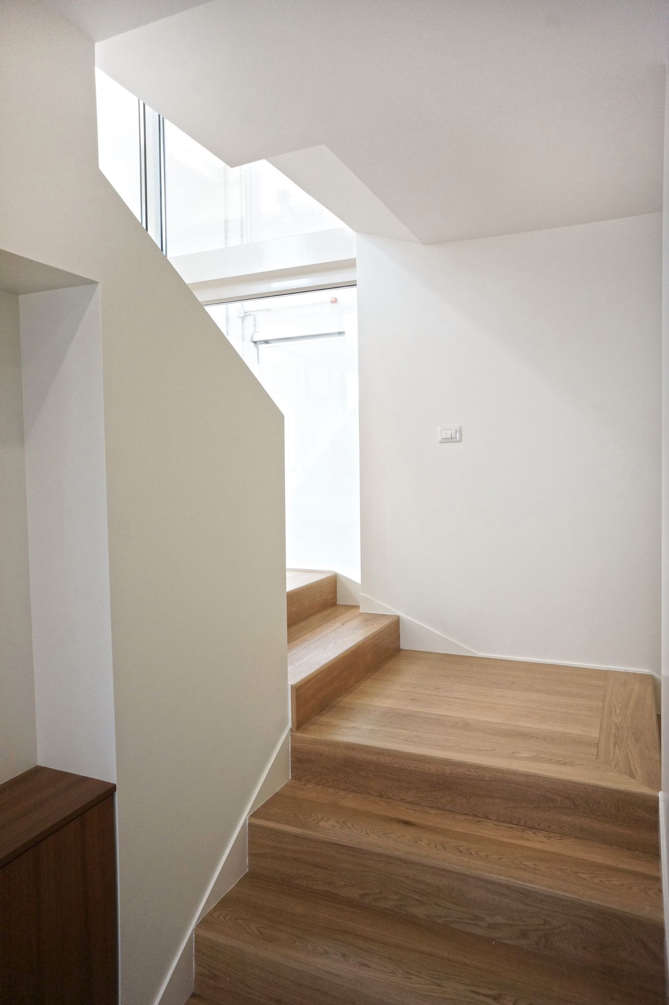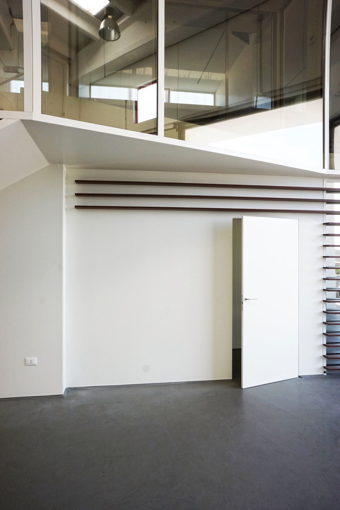 la scala a sbalzo, in lamiera presso-piegata e successivamente rivestita in rovere, mette in relazione i due livelli della struttura, e funge da elemento di collegamento con la pavimentazione.
