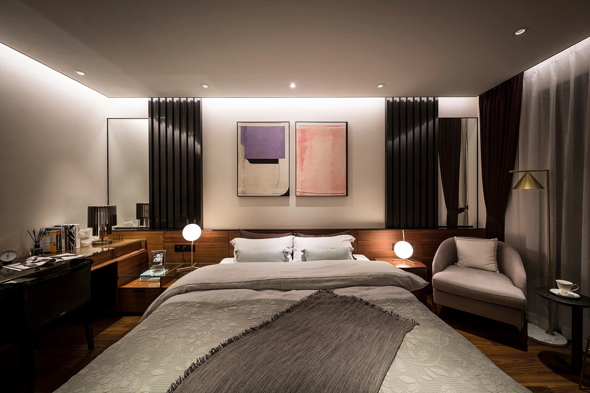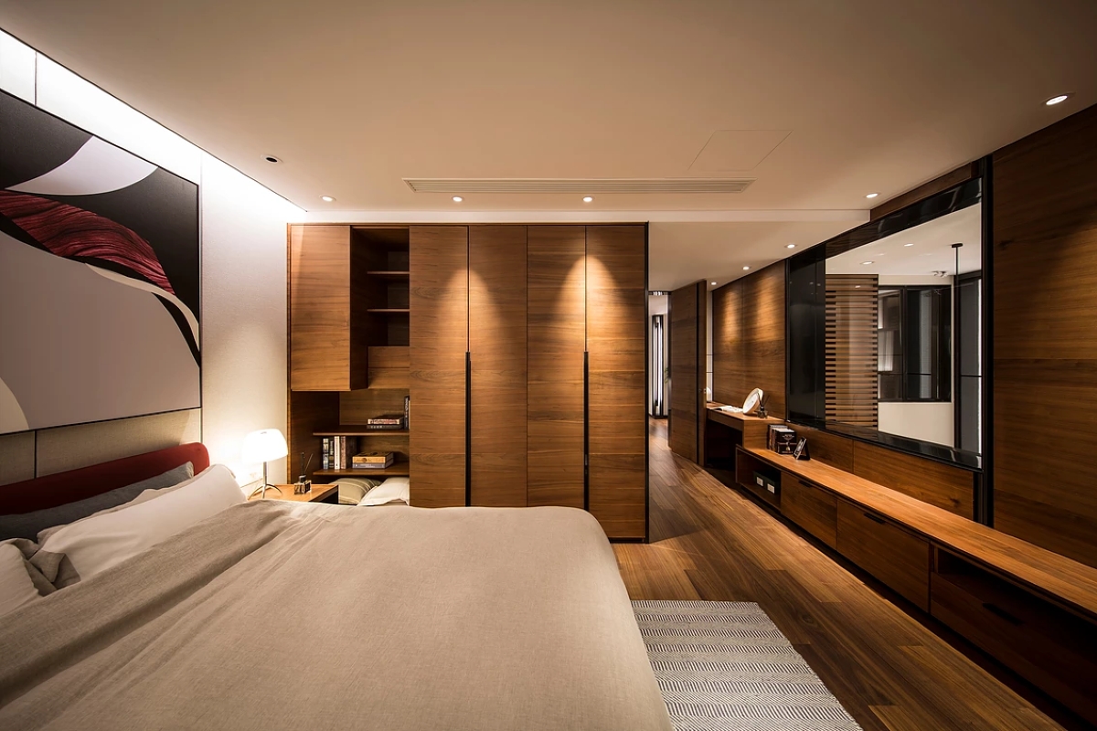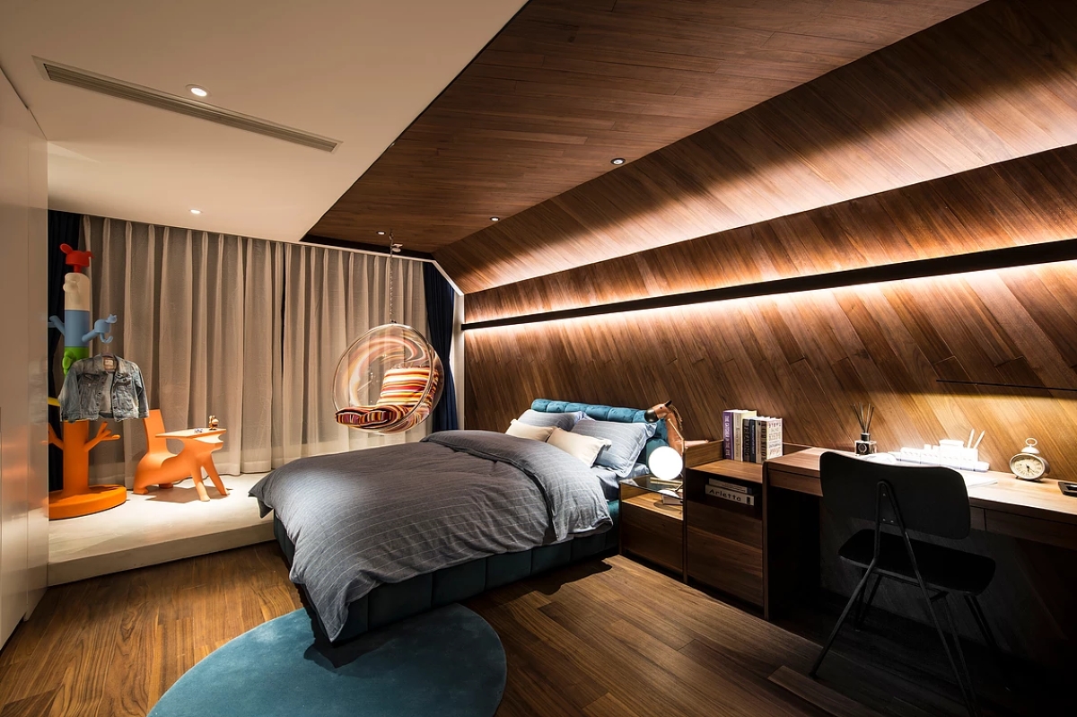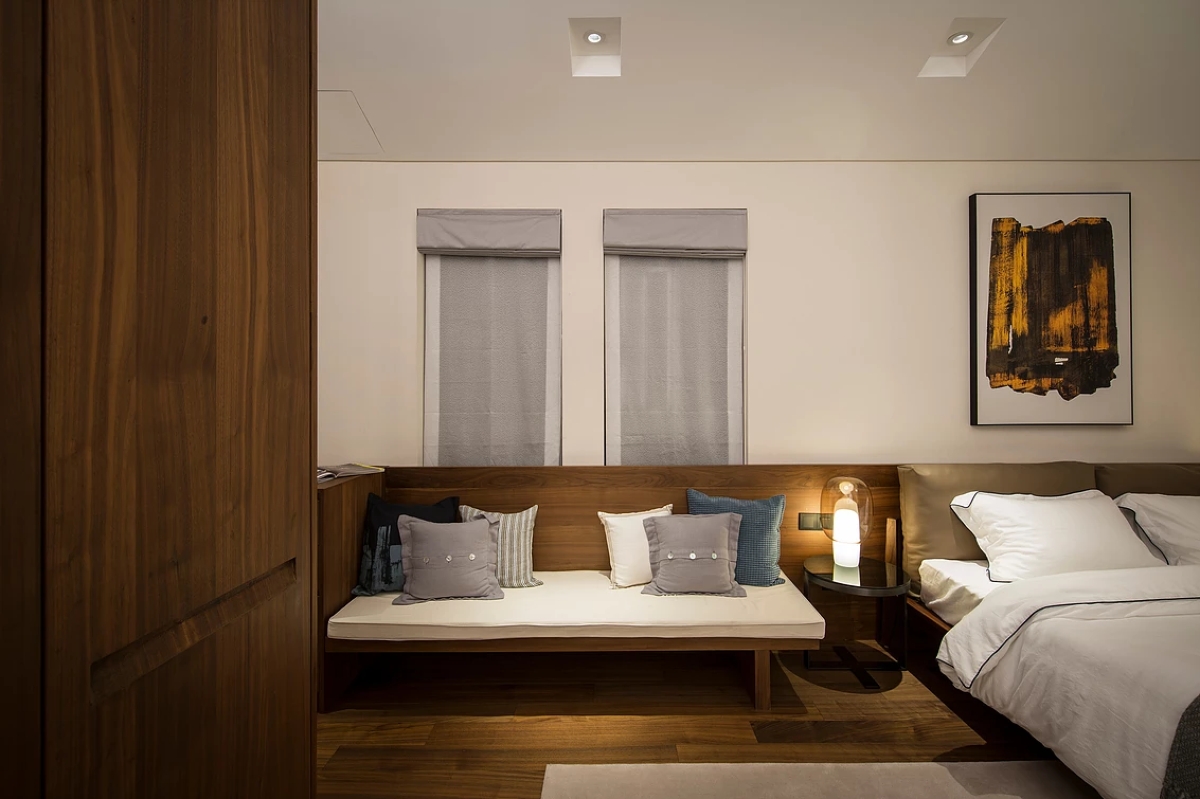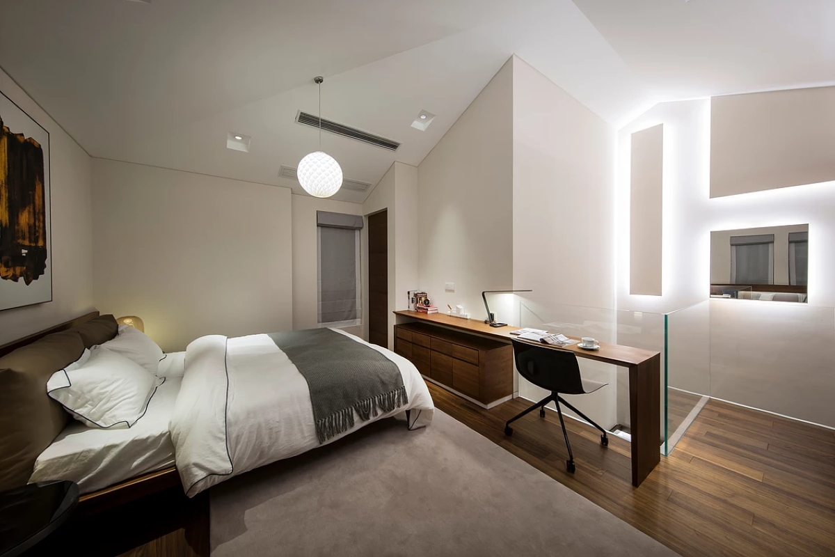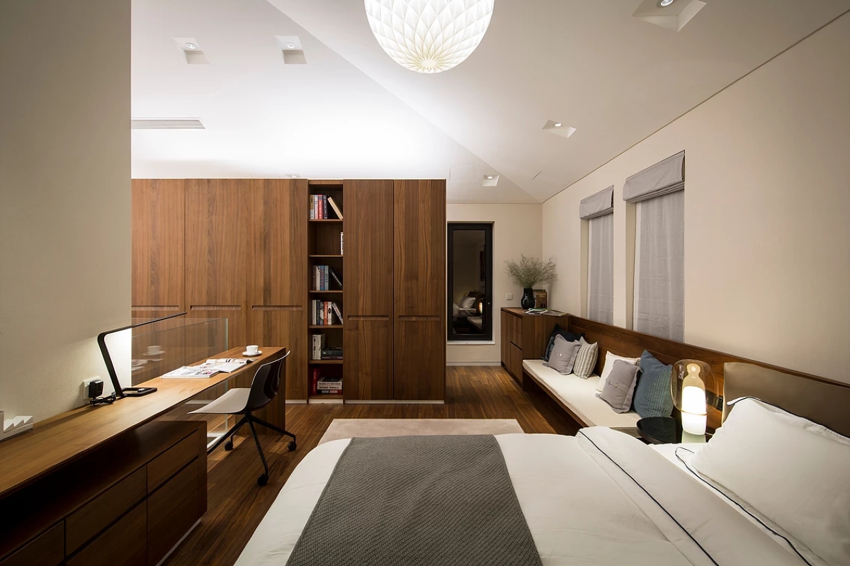 Il piano interrato ospita la palestra ed un family theater, mentre al secondo piano ci sono due camere, tra cui la più colorata ed energetica è quella dei bambini. Al terzo piano la camera patronale, dominata dalle tonalità crema della carta da parati e dai rivestimenti in noce. Al quarto piano lo studio privato, anch’esso utilizzabile come camera da letto.