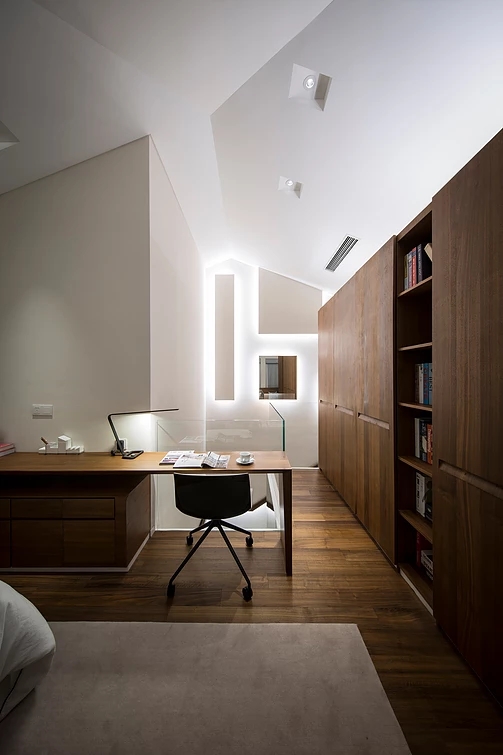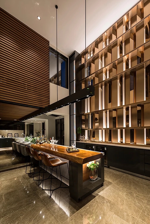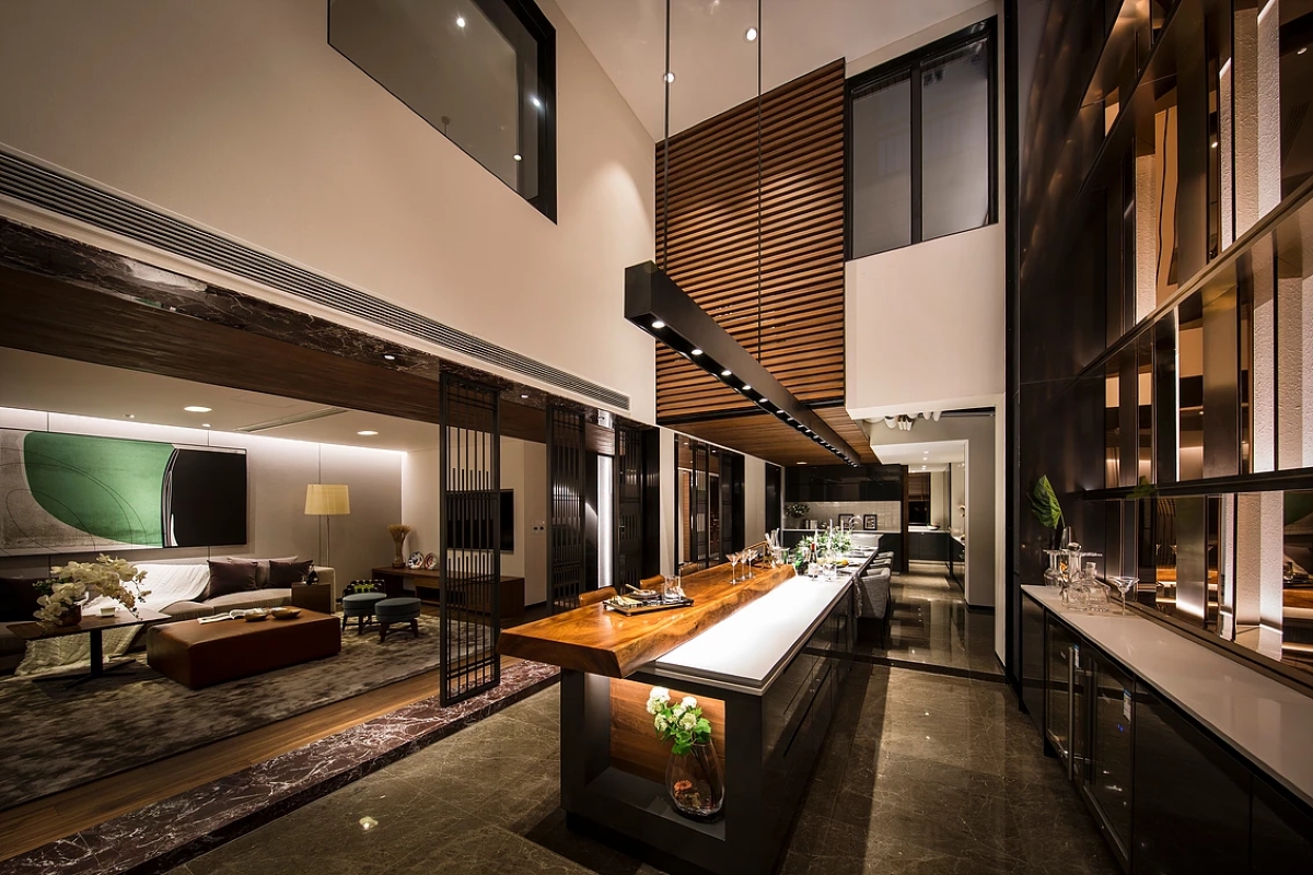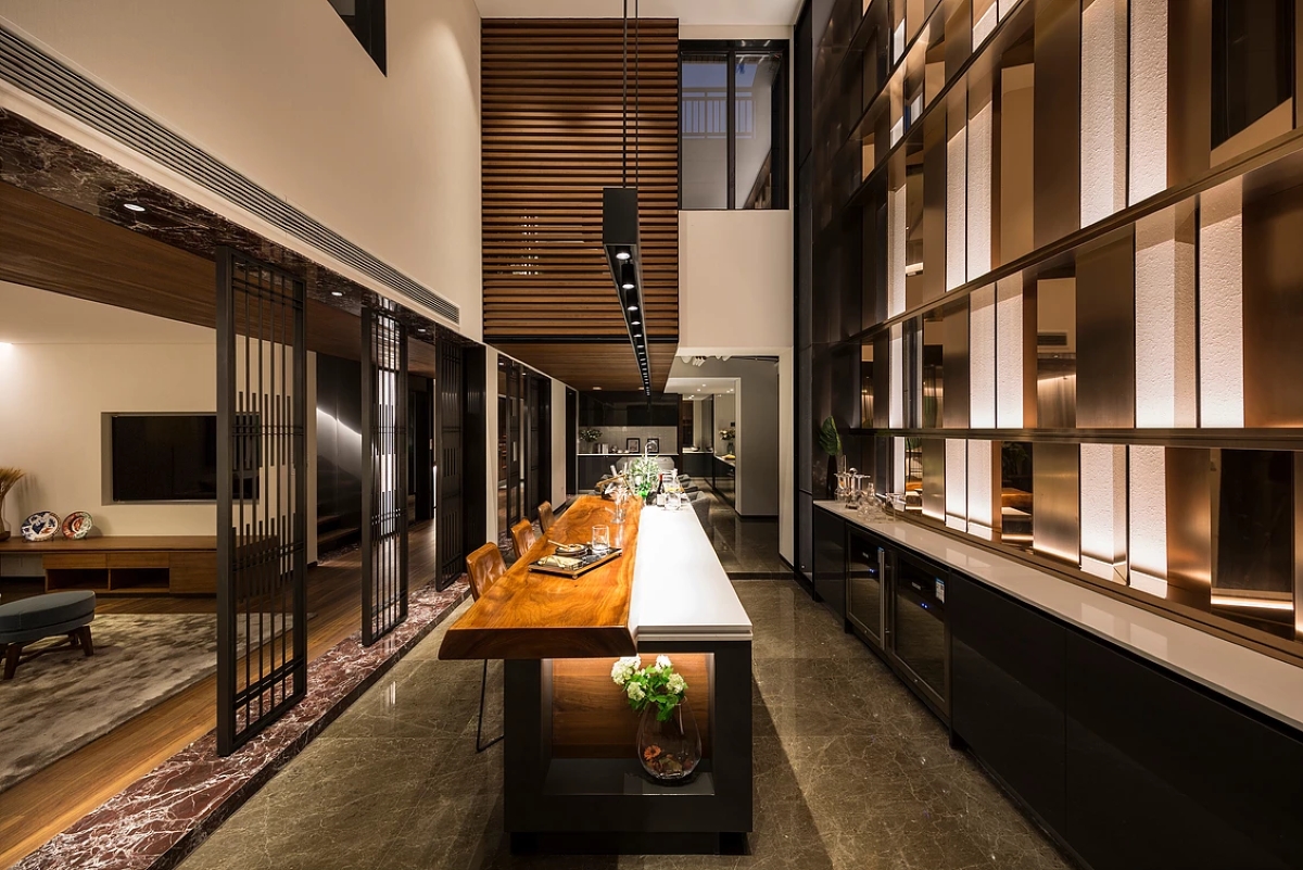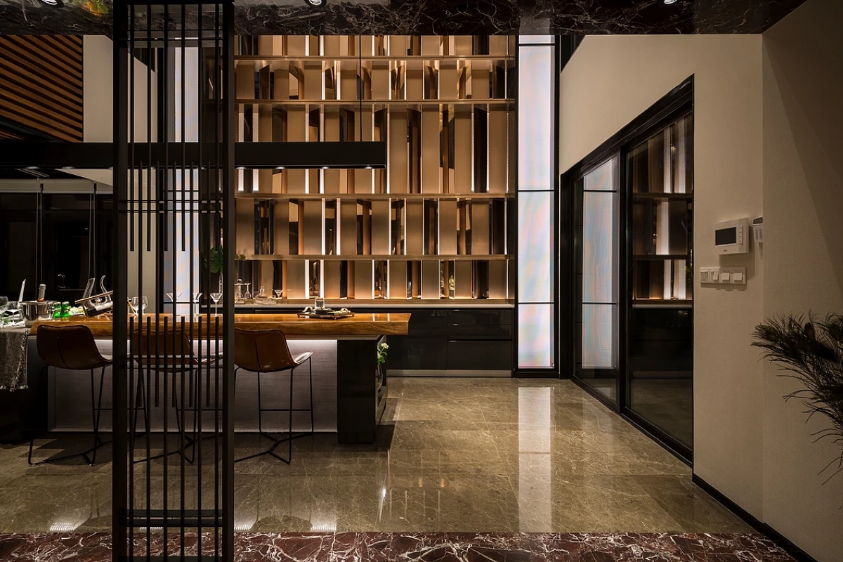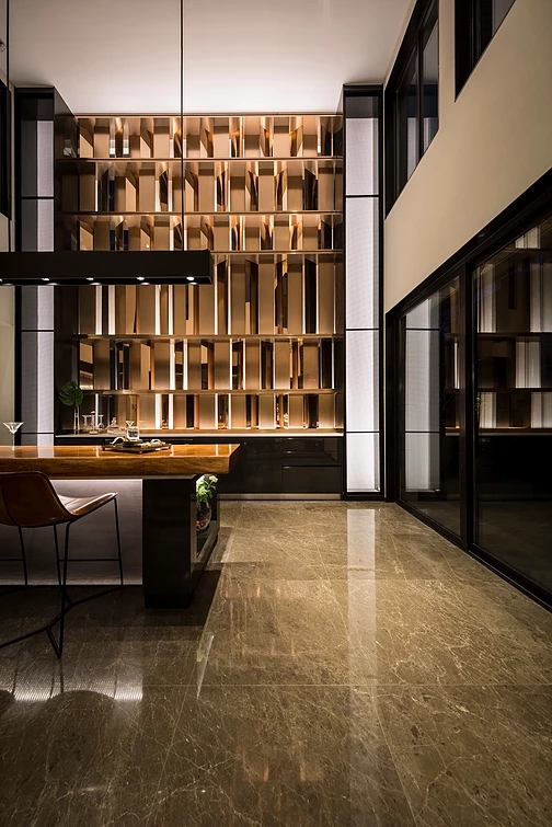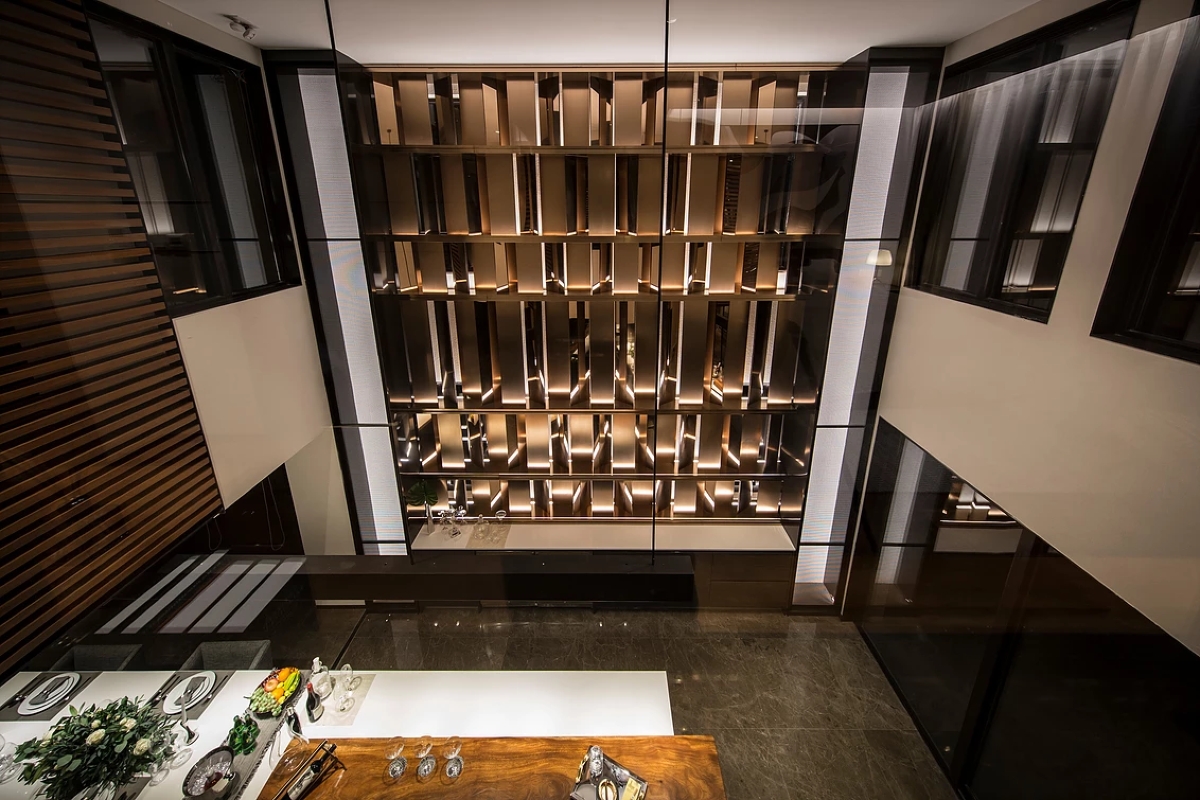 La progettazione del primo piano è basata sul tema della trasparenza. Lo spazio loft sopra il grande tavolo è stato combinato con il living, il soffitto diventa persiana del loft senza soluzione di continuità, dando vita a spazi semplici e lineari. Il muro con la schermatura tridimensionale in rame dietro al bancone rende il soggiorno elegante e maestoso.