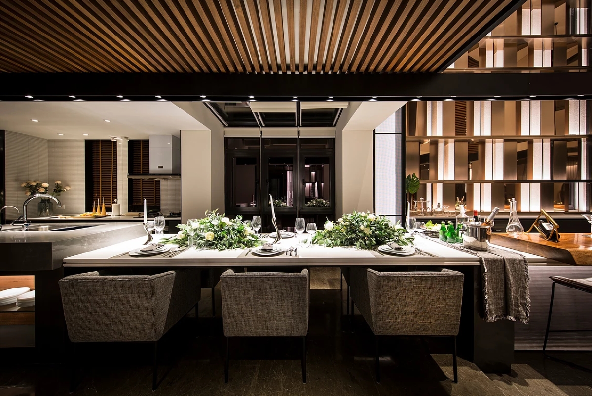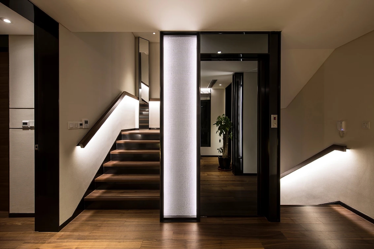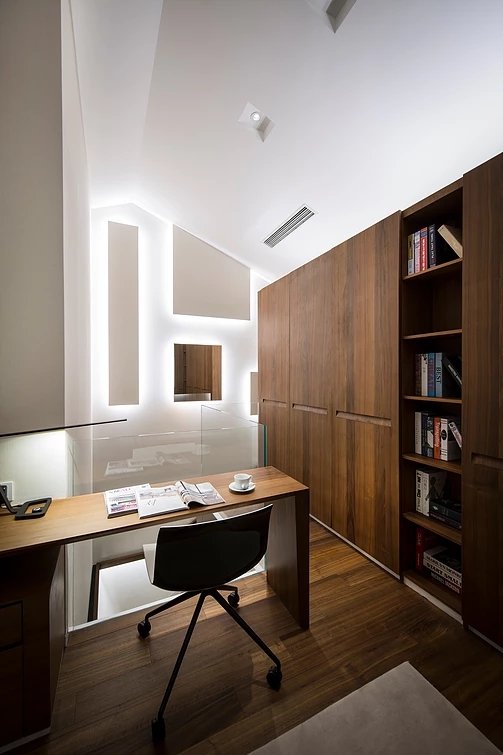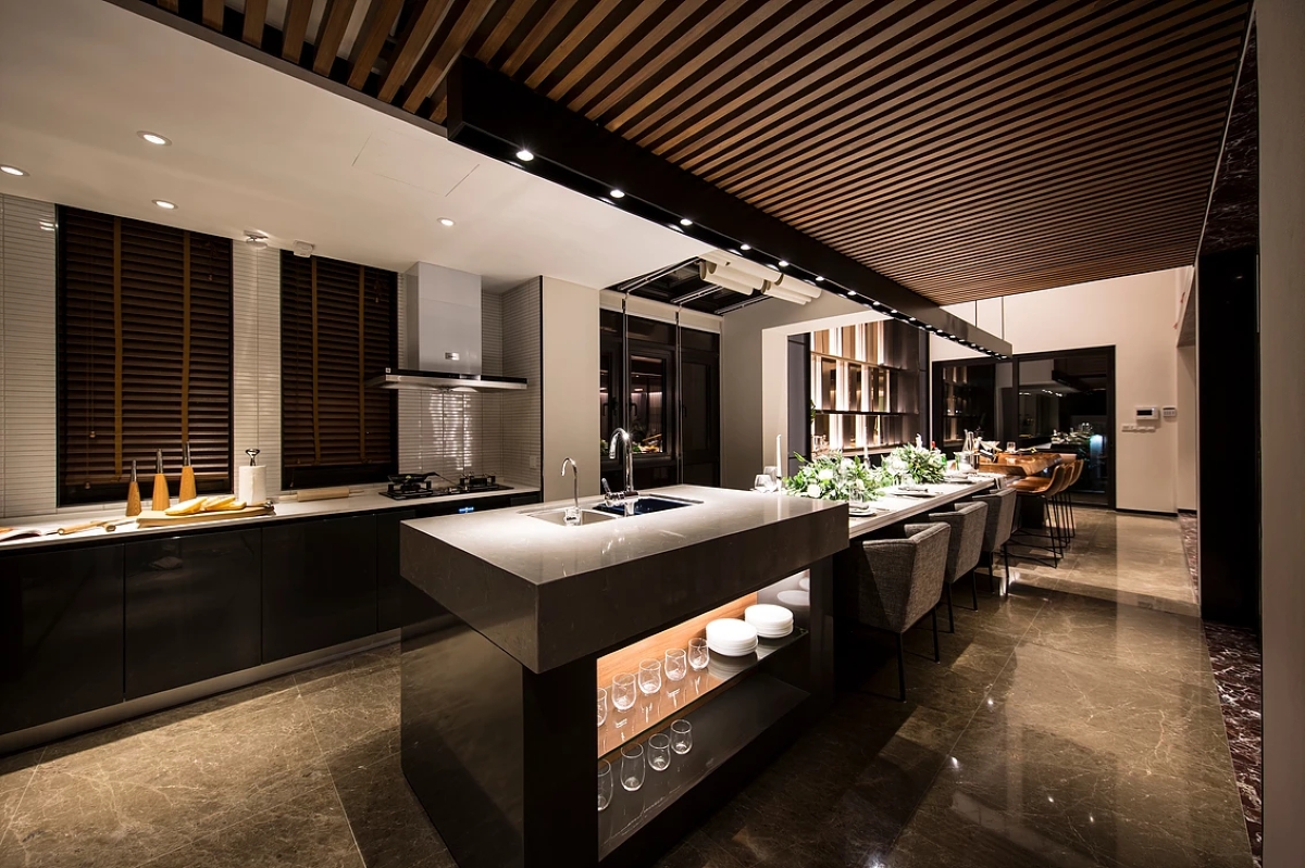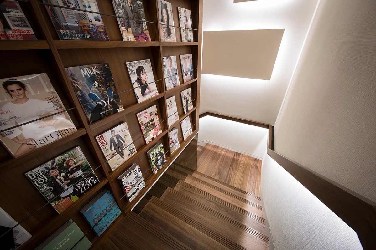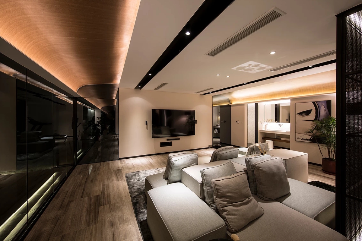 La progettazione del primo piano è basata sul tema della trasparenza. Lo spazio loft sopra il grande tavolo è stato combinato con il living, il soffitto diventa persiana del loft senza soluzione di continuità, dando vita a spazi semplici e lineari. Il muro con la schermatura tridimensionale in rame dietro al bancone rende il soggiorno elegante e maestoso.