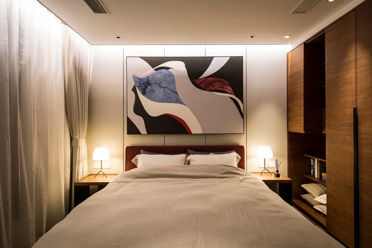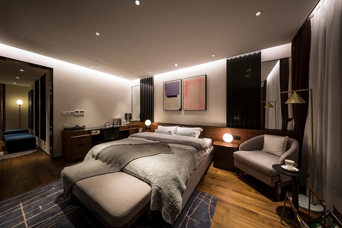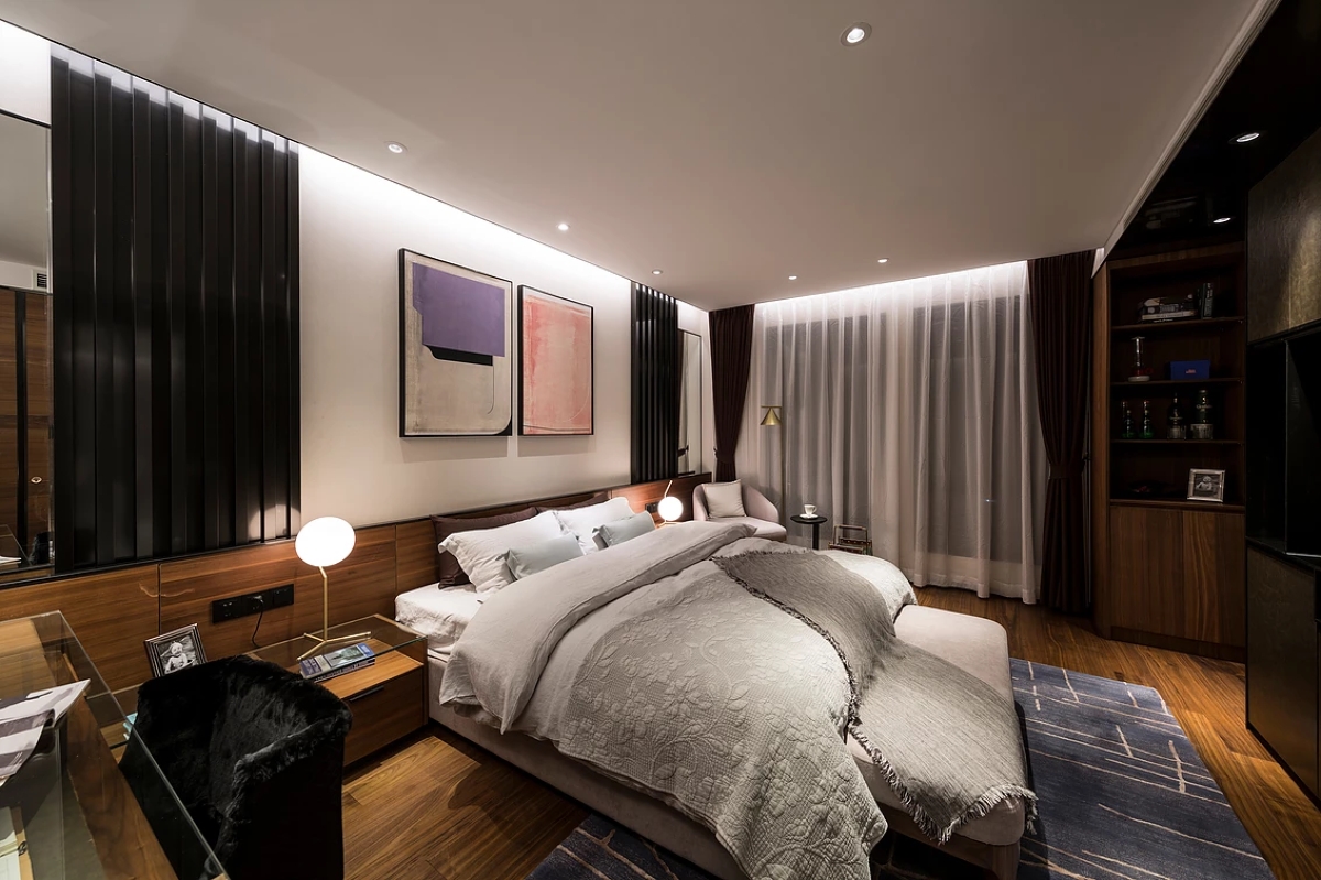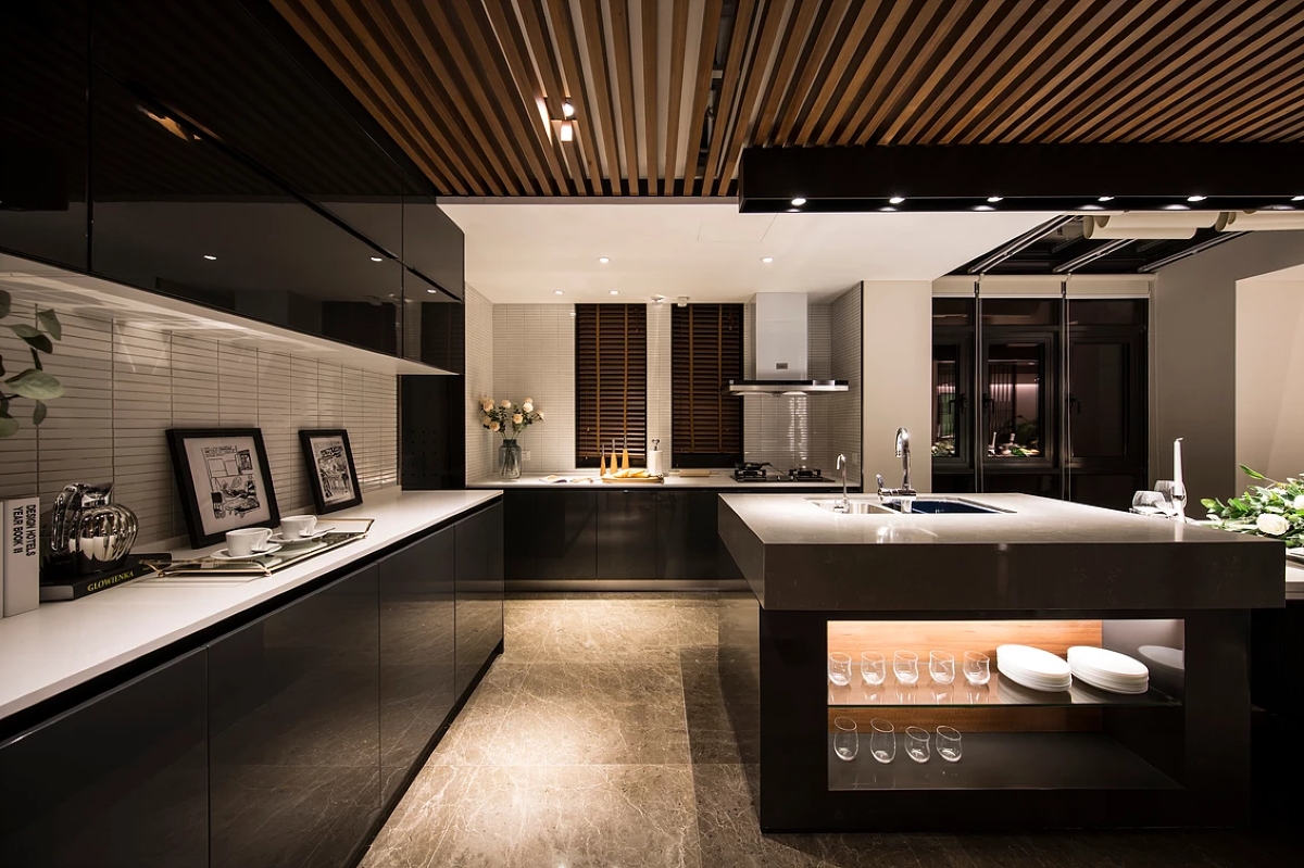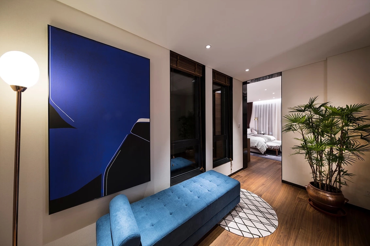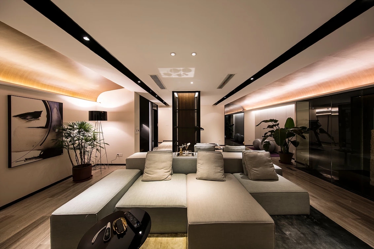 La progettazione del primo piano è basata sul tema della trasparenza. Lo spazio loft sopra il grande tavolo è stato combinato con il living, il soffitto diventa persiana del loft senza soluzione di continuità, dando vita a spazi semplici e lineari. Il muro con la schermatura tridimensionale in rame dietro al bancone rende il soggiorno elegante e maestoso.
