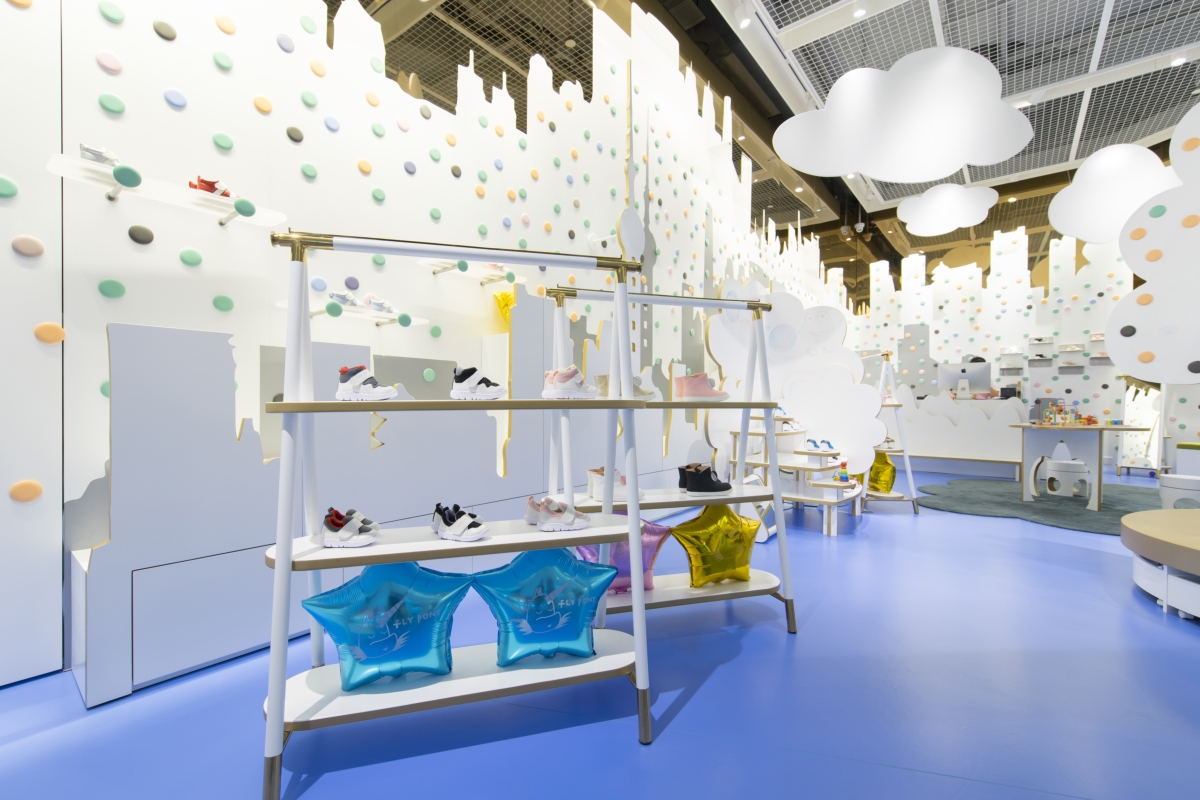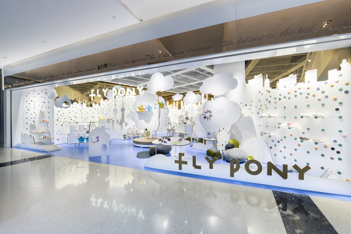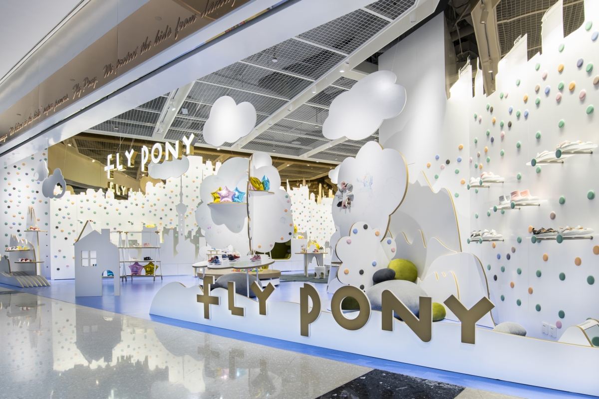 Per progettare il negozio di scarpe per bambini Fly Pony Prism Design si è ispirato al mondo dei sogni creando un concept dove non tutto è definito, negli spazi bianchi i bambini possono disegnare in modo da poter coltivare la loro creatività.
