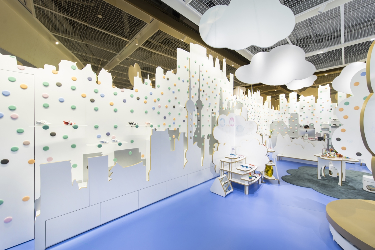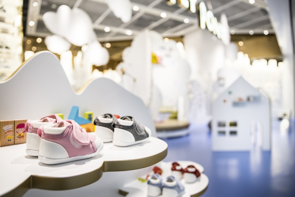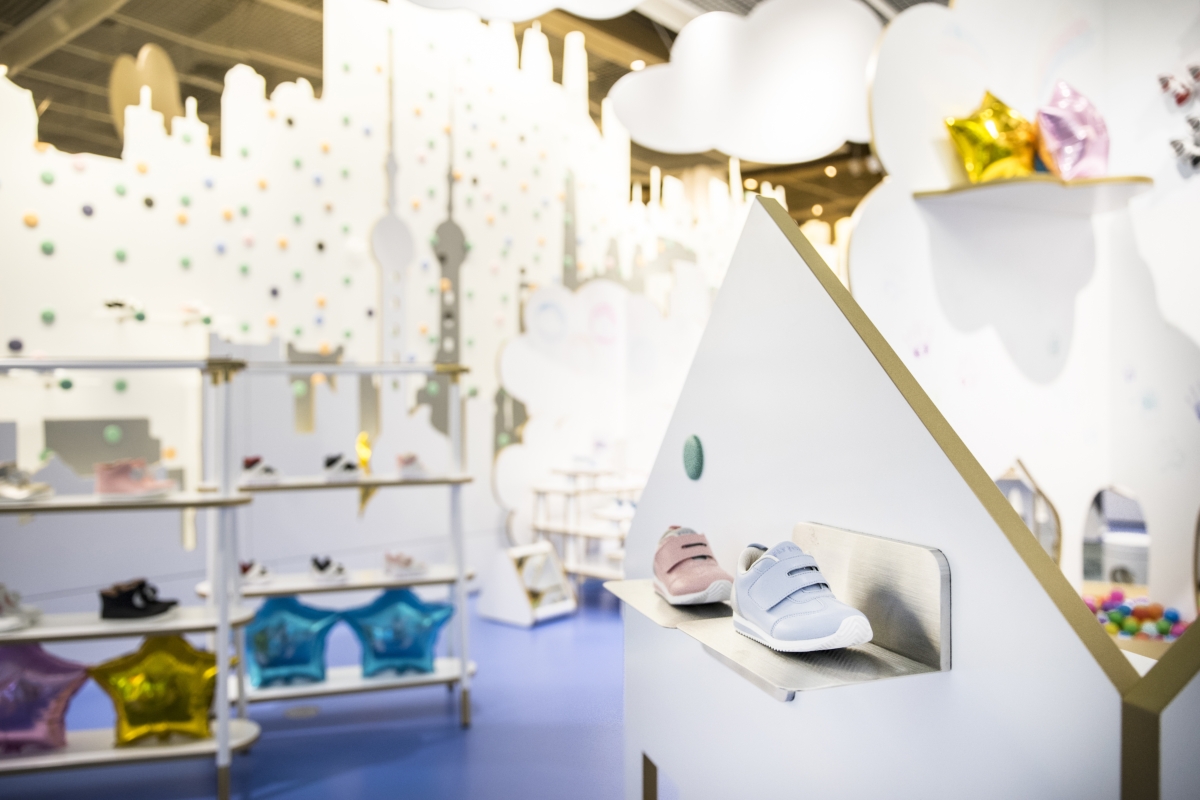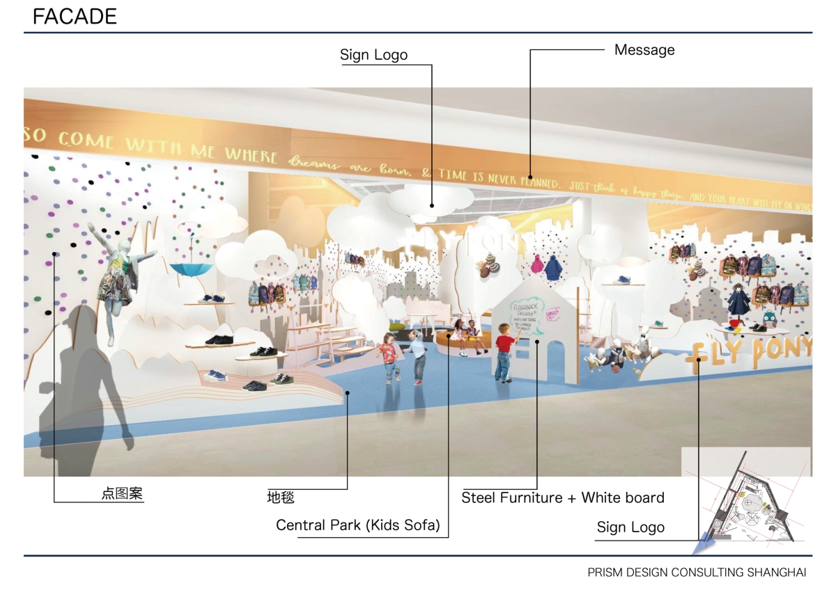 Per progettare il negozio di scarpe per bambini Fly Pony Prism Design si è ispirato al mondo dei sogni creando un concept dove non tutto è definito, negli spazi bianchi i bambini possono disegnare in modo da poter coltivare la loro creatività.