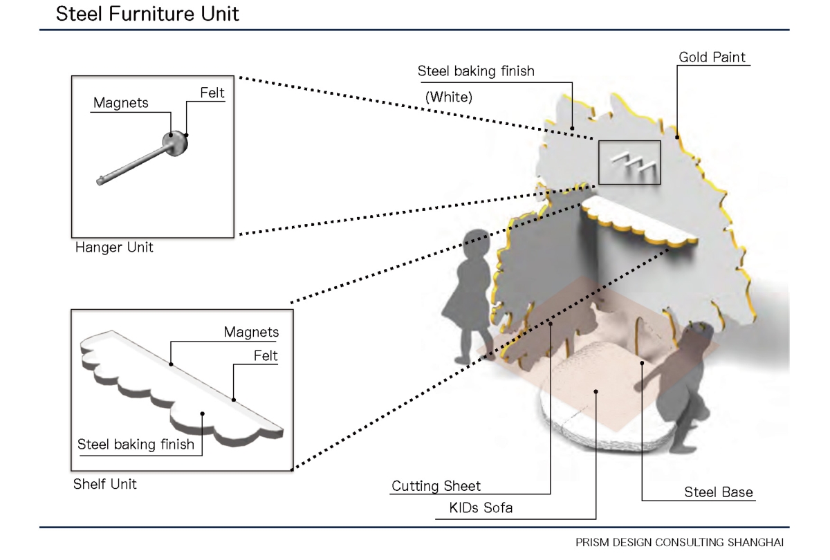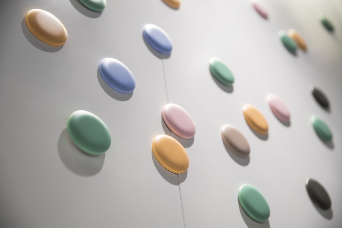 I punti colorati sono in realtà due tipi di punti di sostegno: punti fissi e mobili. Il mix di questi punti mescola la funzione e la fantasia. La parte posteriore dei punti verdi può montare appendini. Altri punti di colore hanno il magnete nel retro e possono essere disposti liberamente. I ripiani potrebbero essere messi in cima a quegli appendini per mostrare le scarpe. Inoltre, gli appendiabiti potrebbero essere utilizzati per mostrare i vestiti. Potrebbero essere organizzati secondo le esigenze.