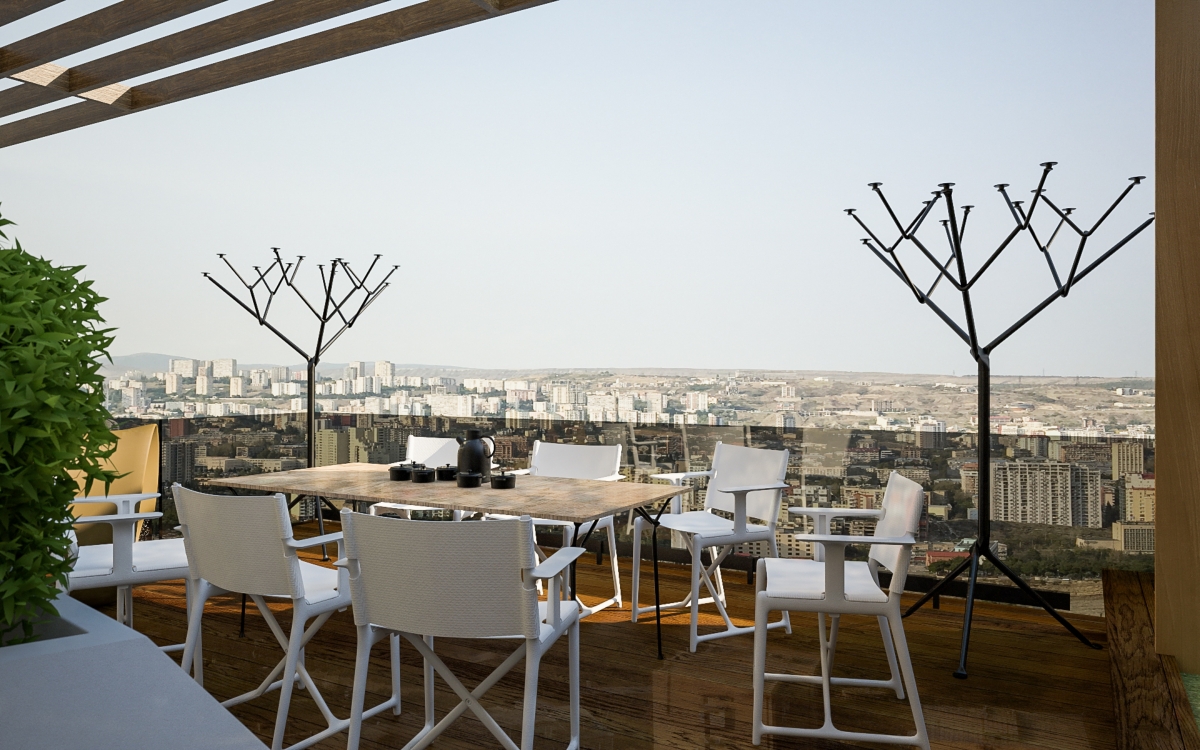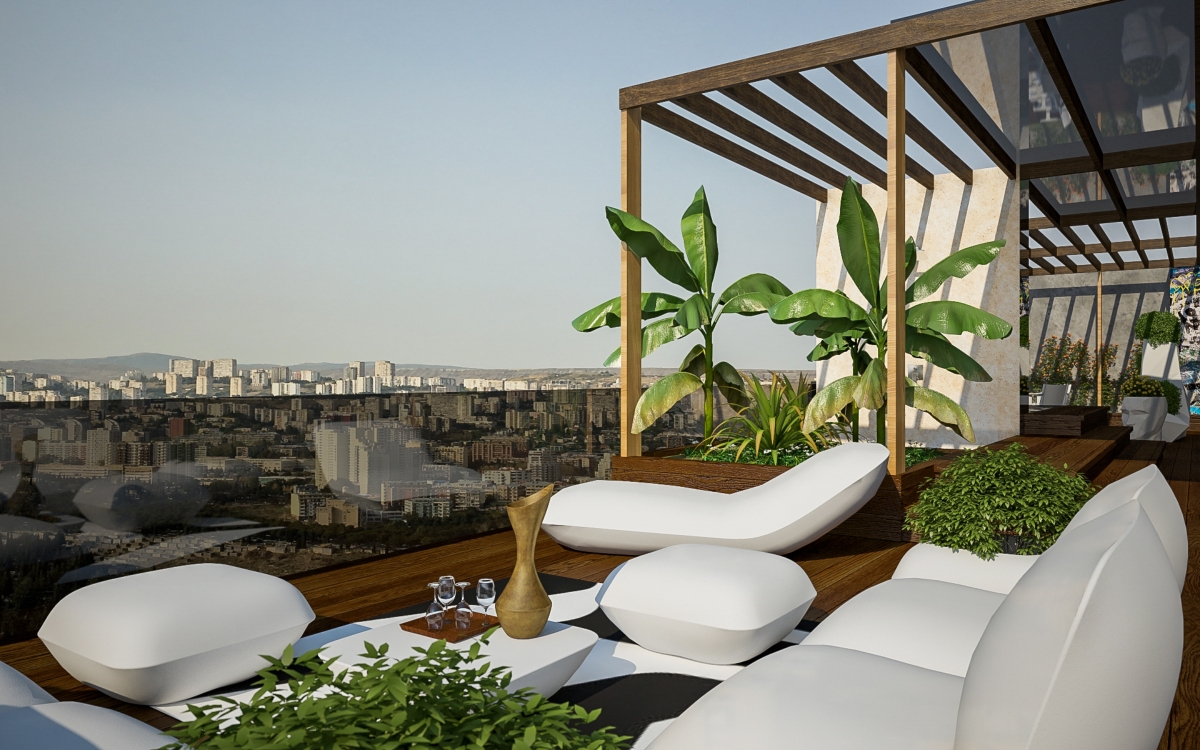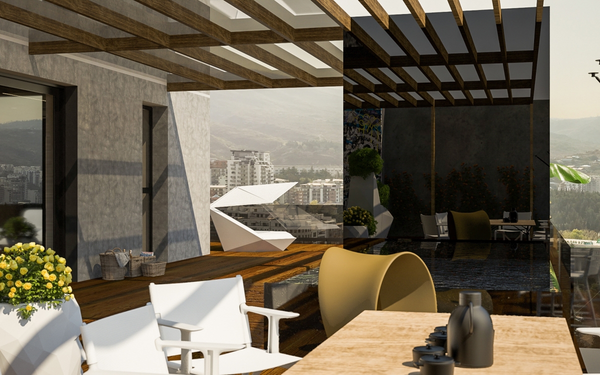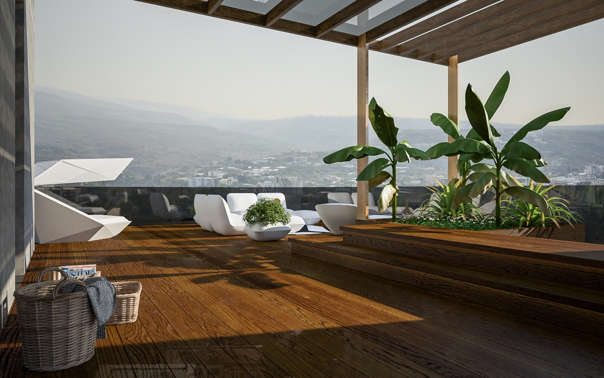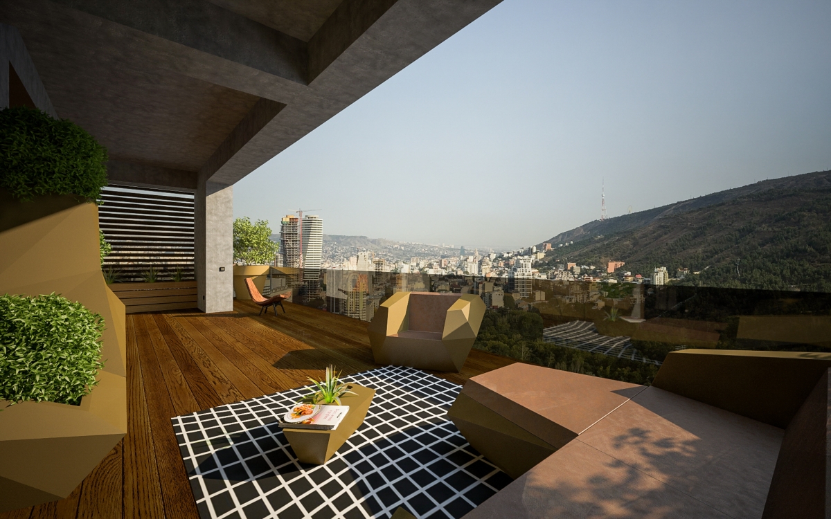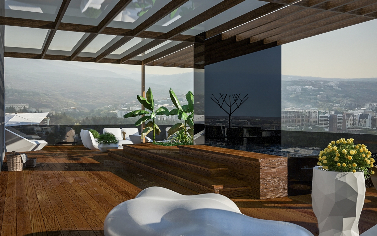Lo spazioso appartamento, 200 mq, ha anche due grandi terrazze dalle quali si gode di una splendida vista panoramica sulla città. L’ingresso si dirama in due sale, dalle quali già si intravede il paesaggio urbano misto a natura. La sala sinistra conduce alla sala da pranzo, che condivide lo spazio con la zona cucina, ci sono ampie finestre che danno sulla terrazza ed è arredata con mobili bassi, in modo che il visitatore possa avere sempre una vista sul panorama circostante. La sala destra porta all’altra terrazza attraverso il bar. La terrazza è principalmente designata ad area di intrattenimento con piscina trasparente, doccia aperta e giardino.