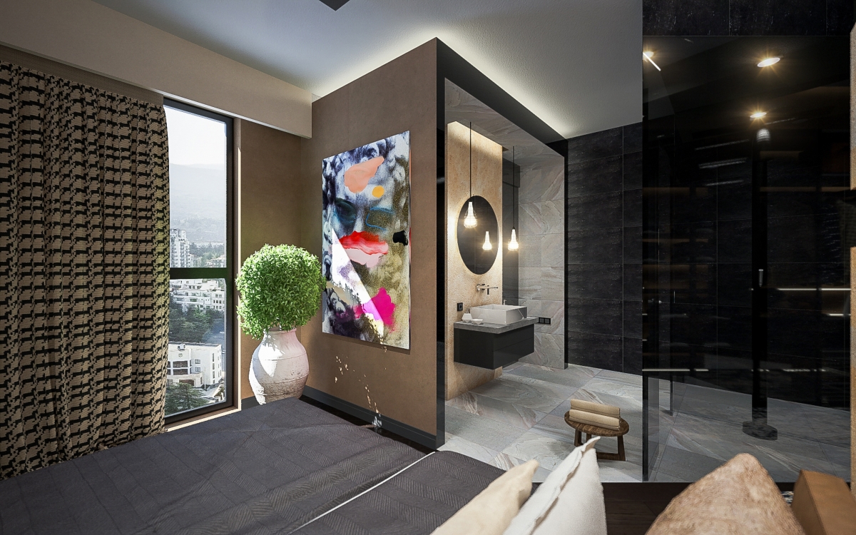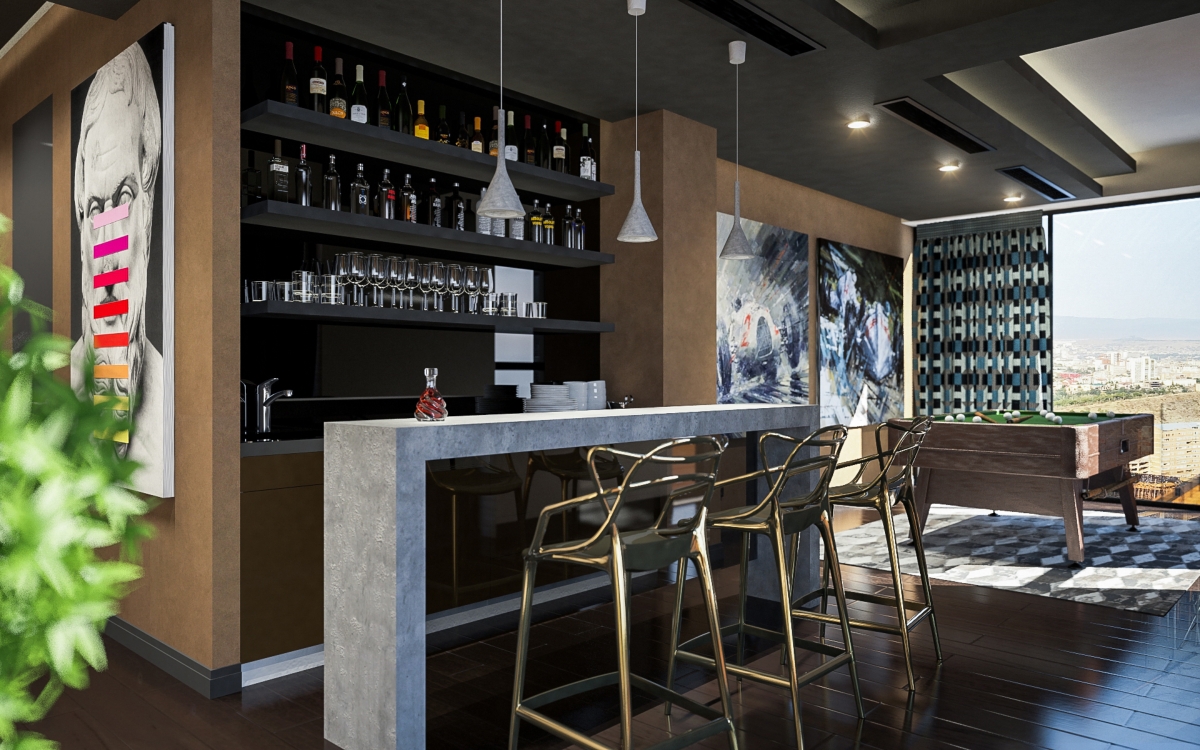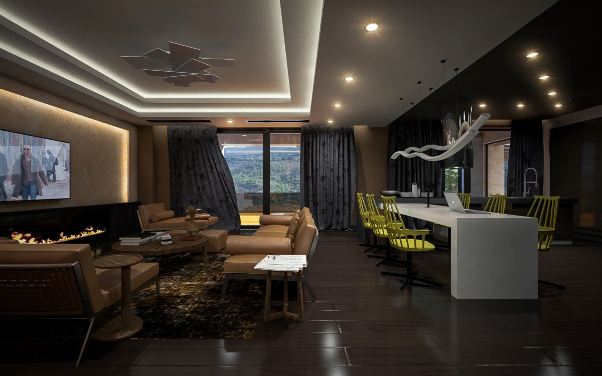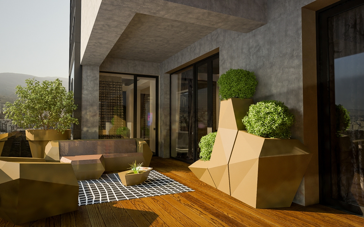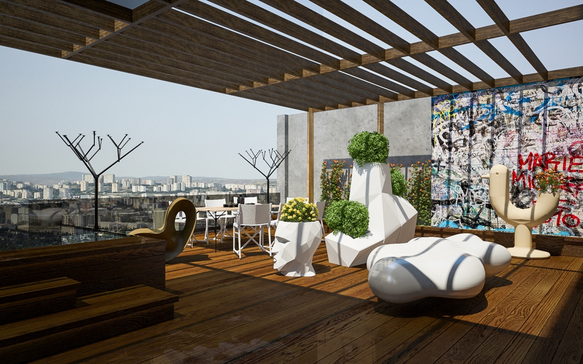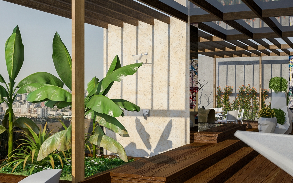 Lo spazioso appartamento, 200 mq, ha anche due grandi terrazze dalle quali si gode di una splendida vista panoramica sulla città. L’ingresso si dirama in due sale, dalle quali già si intravede il paesaggio urbano misto a natura. La sala sinistra conduce alla sala da pranzo, che condivide lo spazio con la zona cucina, ci sono ampie finestre che danno sulla terrazza ed è arredata con mobili bassi, in modo che il visitatore possa avere sempre una vista sul panorama circostante. La sala destra porta all’altra terrazza attraverso il bar. La terrazza è principalmente designata ad area di intrattenimento con piscina trasparente, doccia aperta e giardino.