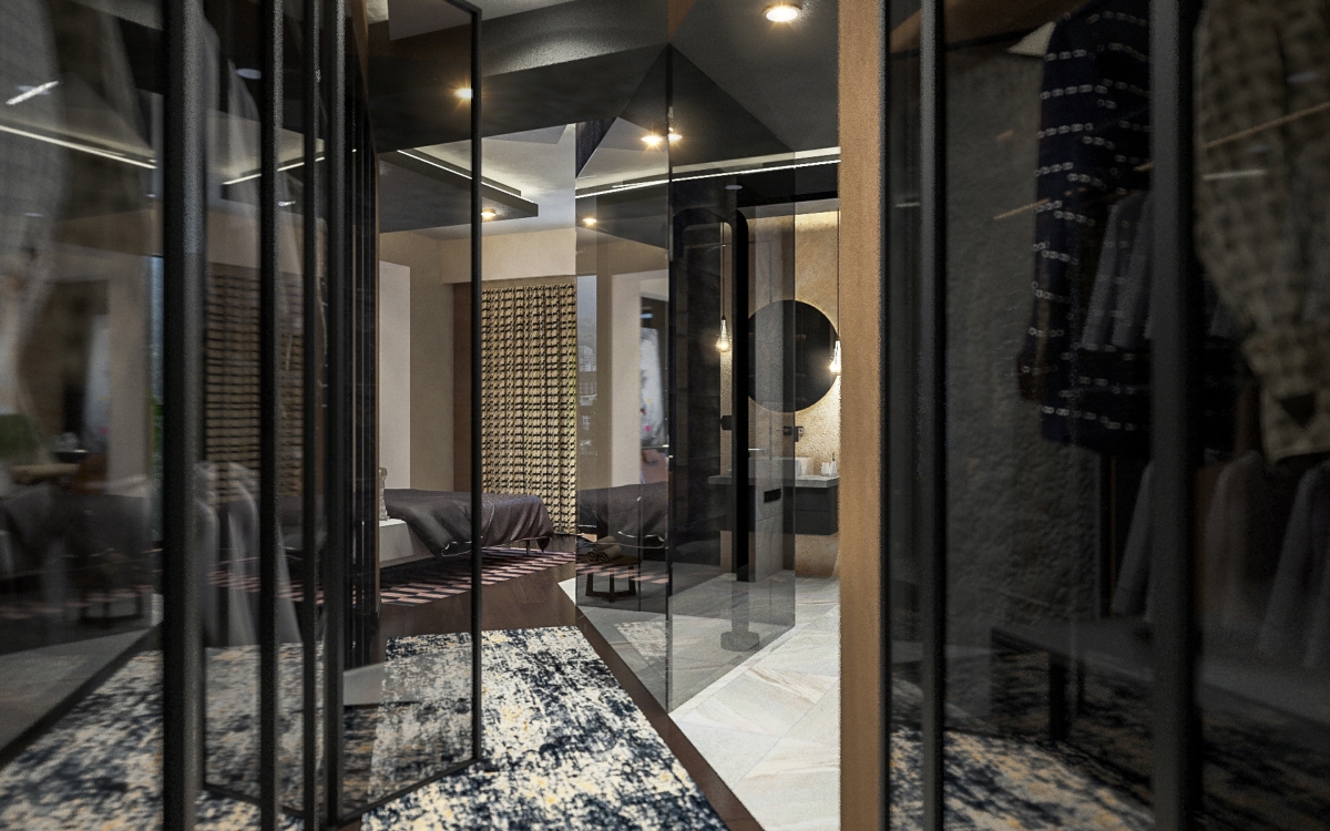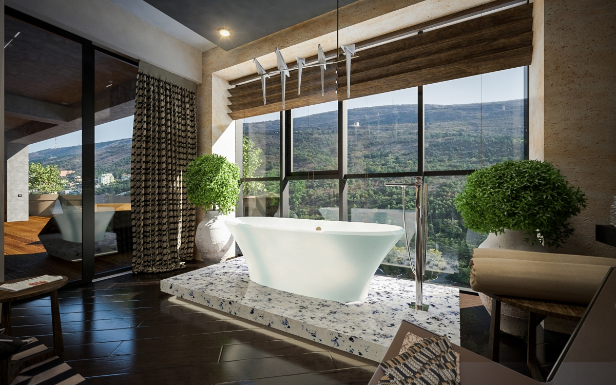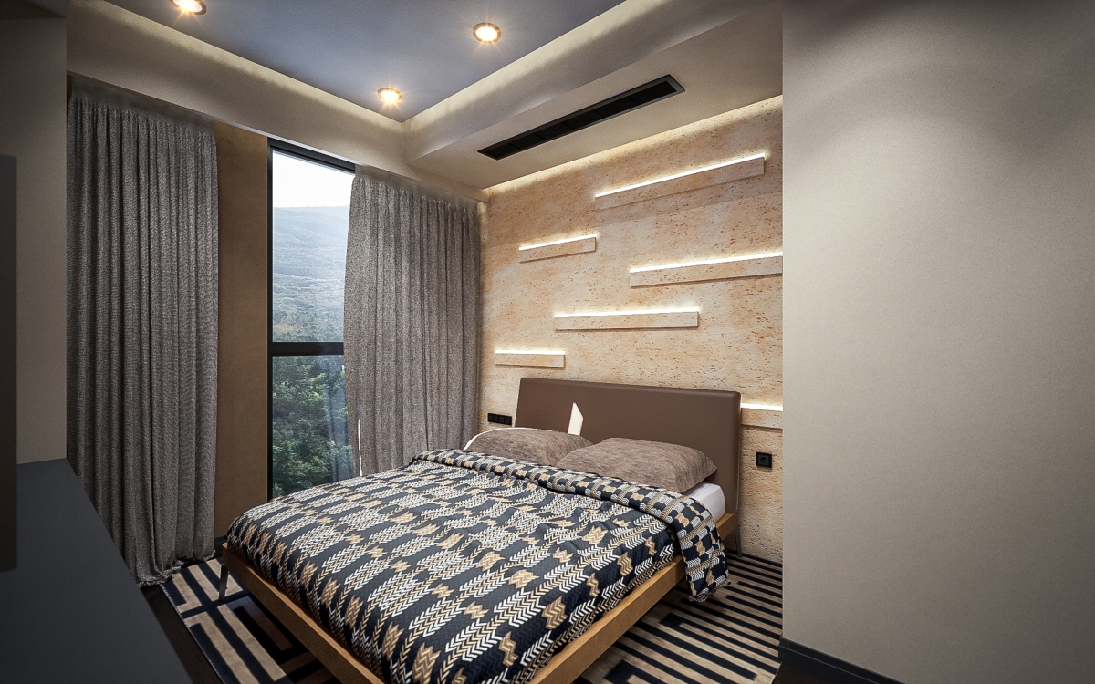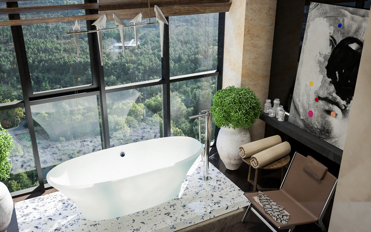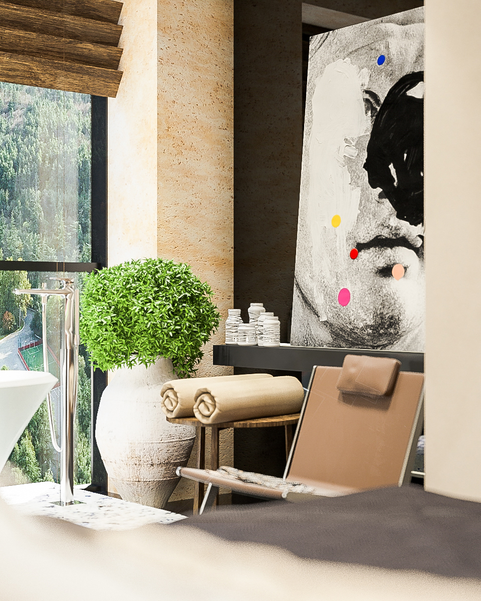 Lo spazioso appartamento, 200 mq, ha anche due grandi terrazze dalle quali si gode di una splendida vista panoramica sulla città. L’ingresso si dirama in due sale, dalle quali già si intravede il paesaggio urbano misto a natura. La sala sinistra conduce alla sala da pranzo, che condivide lo spazio con la zona cucina, ci sono ampie finestre che danno sulla terrazza ed è arredata con mobili bassi, in modo che il visitatore possa avere sempre una vista sul panorama circostante. La sala destra porta all’altra terrazza attraverso il bar. La terrazza è principalmente designata ad area di intrattenimento con piscina trasparente, doccia aperta e giardino.