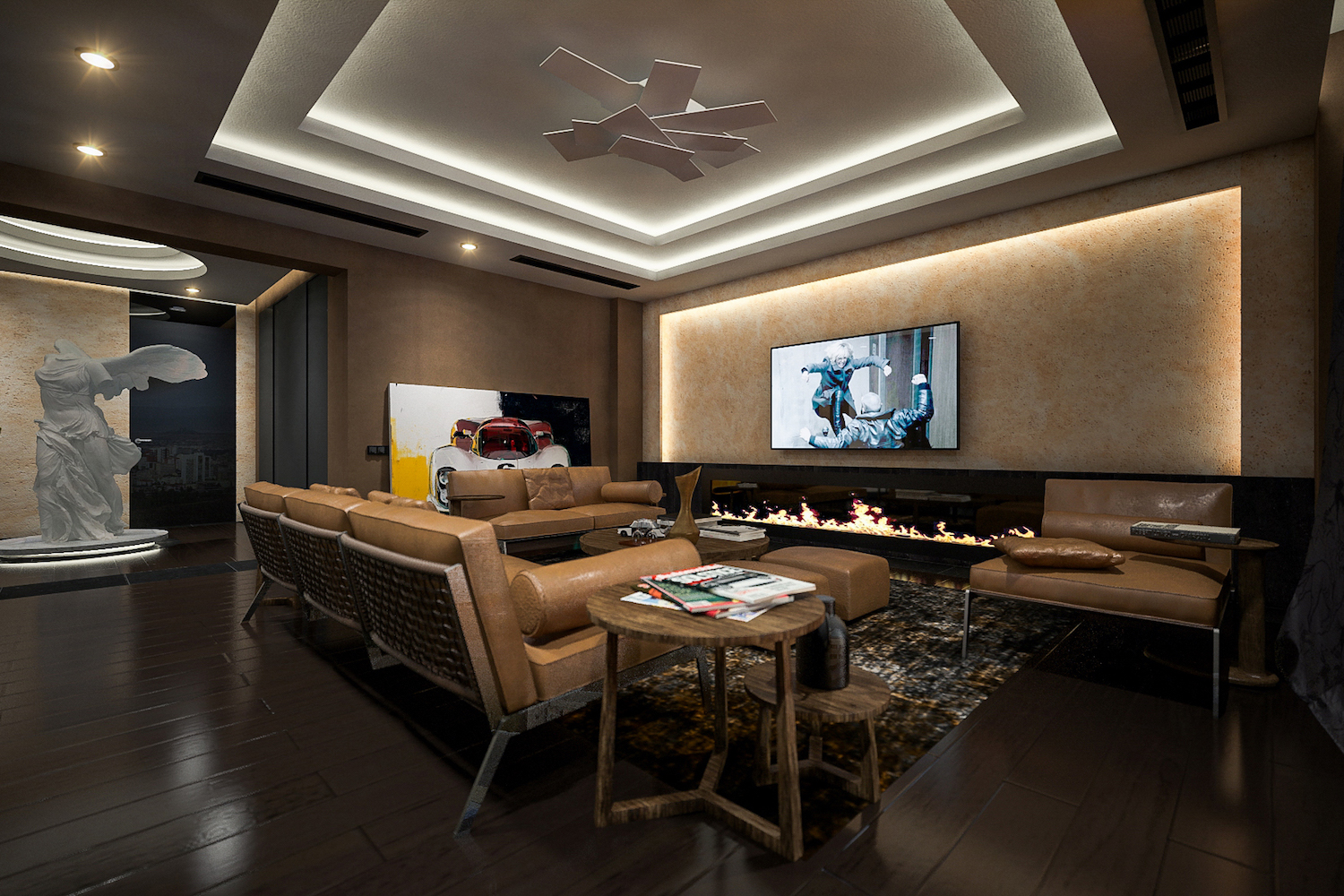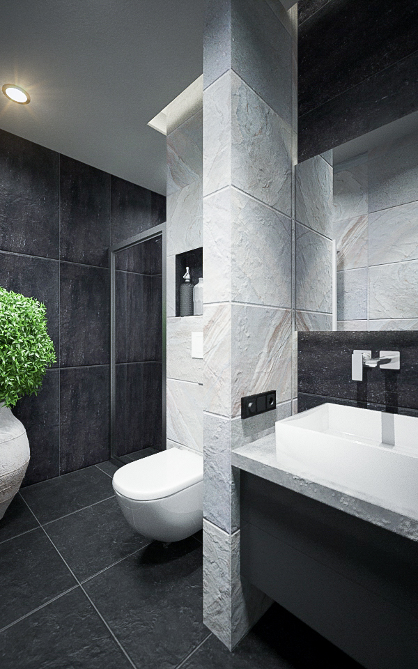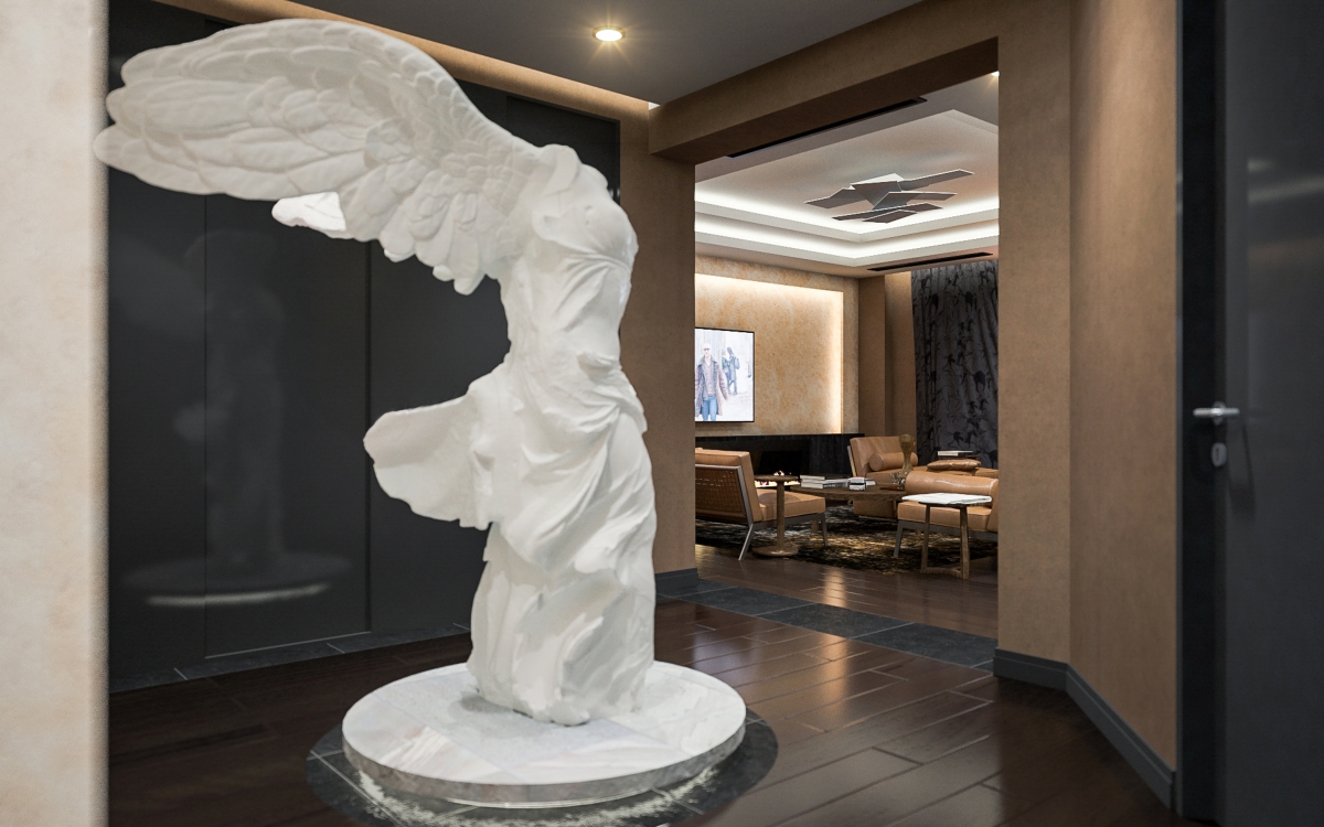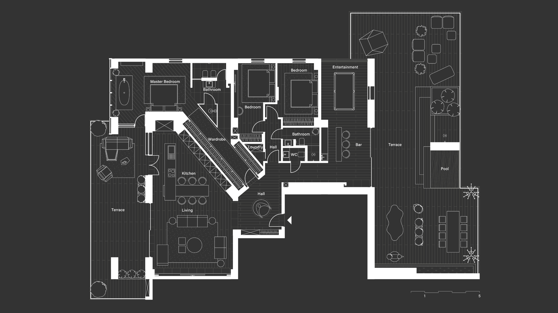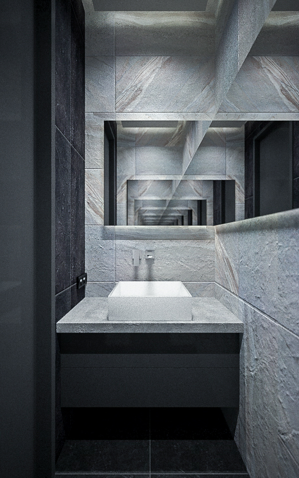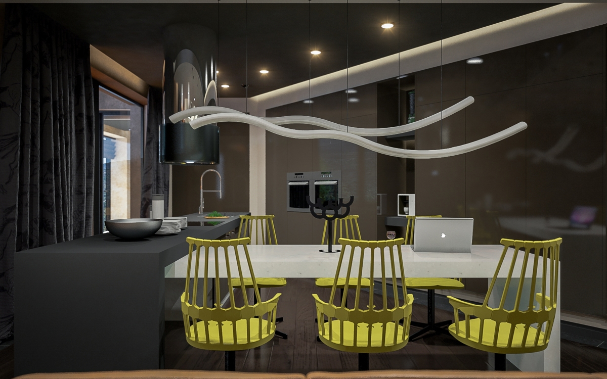 Lo spazioso appartamento, 200 mq, ha anche due grandi terrazze dalle quali si gode di una splendida vista panoramica sulla città. L’ingresso si dirama in due sale, dalle quali già si intravede il paesaggio urbano misto a natura. La sala sinistra conduce alla sala da pranzo, che condivide lo spazio con la zona cucina, ci sono ampie finestre che danno sulla terrazza ed è arredata con mobili bassi, in modo che il visitatore possa avere sempre una vista sul panorama circostante. La sala destra porta all’altra terrazza attraverso il bar. La terrazza è principalmente designata ad area di intrattenimento con piscina trasparente, doccia aperta e giardino.