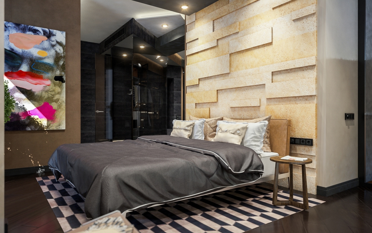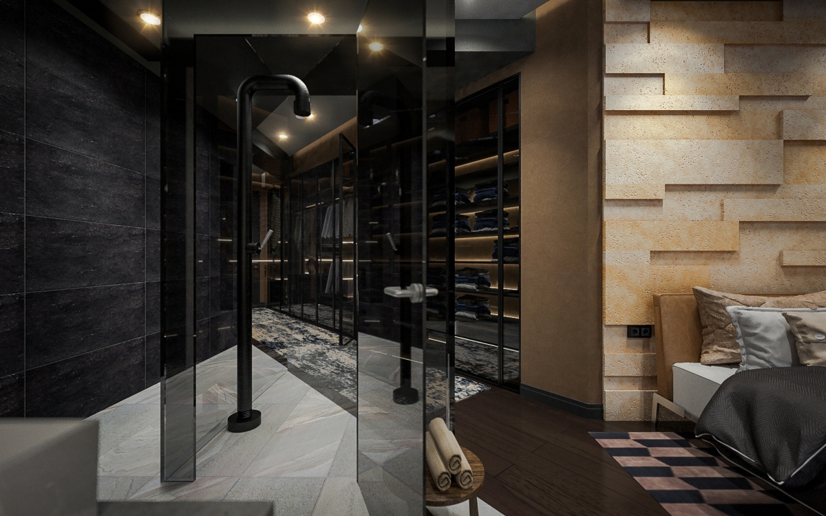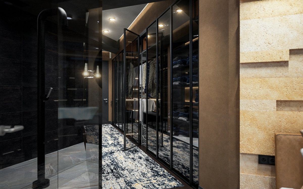 Una porta nella zona d’ingresso entra nella camera da letto principale attraverso il lungo corridoio e il guardaroba. Un bagno è dietro una parete vetrata e una vasca si trova in uno spazio aperto, diventando una parte della camera da letto. Due camere da letto per gli ospiti e un bagno si trovano vicino al bar.