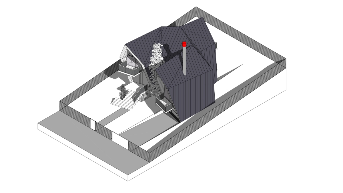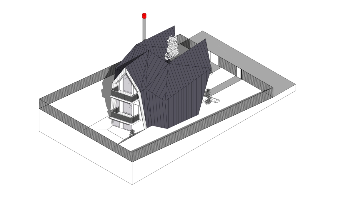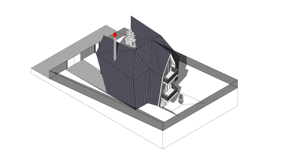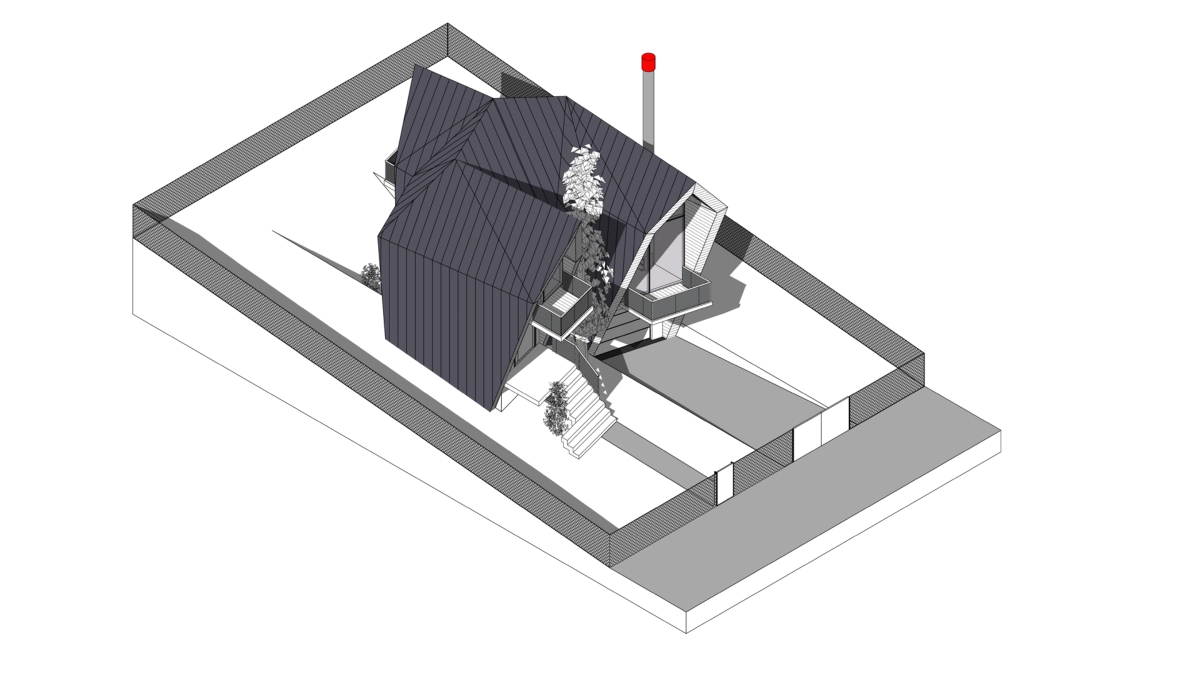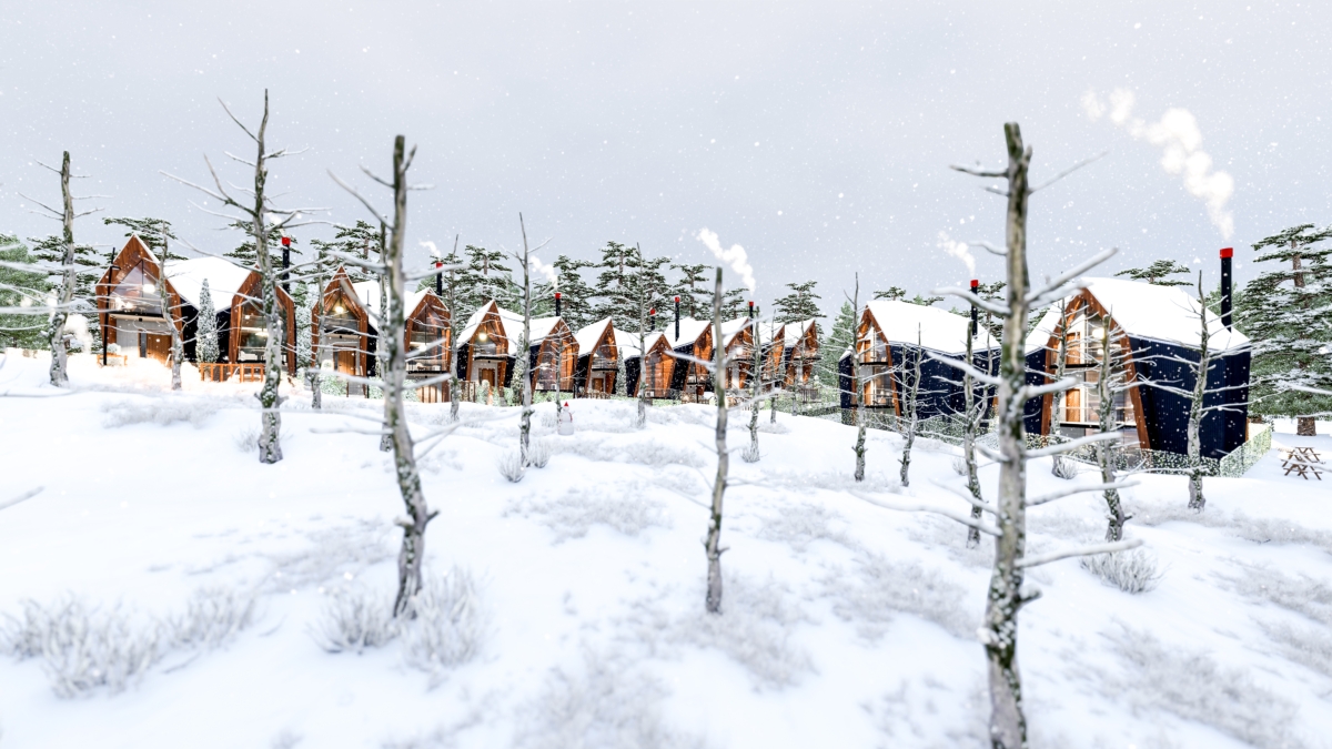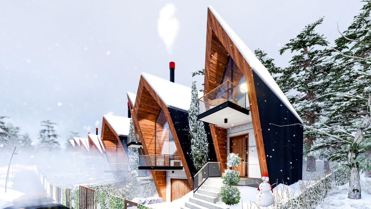 Pannelli metallici ripiegati attorno a sette cabine a forma angolare. Sebbene siano strutturate in modo simile, la loro disposizione su un terreno inclinato crea un’immagine di un singolo organismo che si muove a zigzag sulla superficie. Le unità rivestite in legno sono divise in due sezioni: una è divisa in due livelli ed ospita due camere da letto, l’altra è interamente dedicata ad una spaziosa zona giorno. Una recinzione trasparente in metallo perforato forma le ringhiere del balcone. Un garage e una sauna, che si affaccia verso un cortile, si trovano al piano terra. C’è un parco giochi per i bambini nelle vicinanze delle cabine.