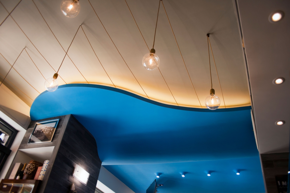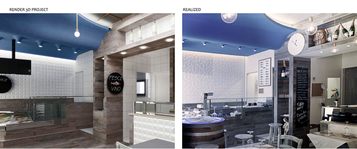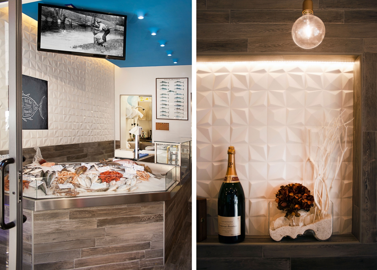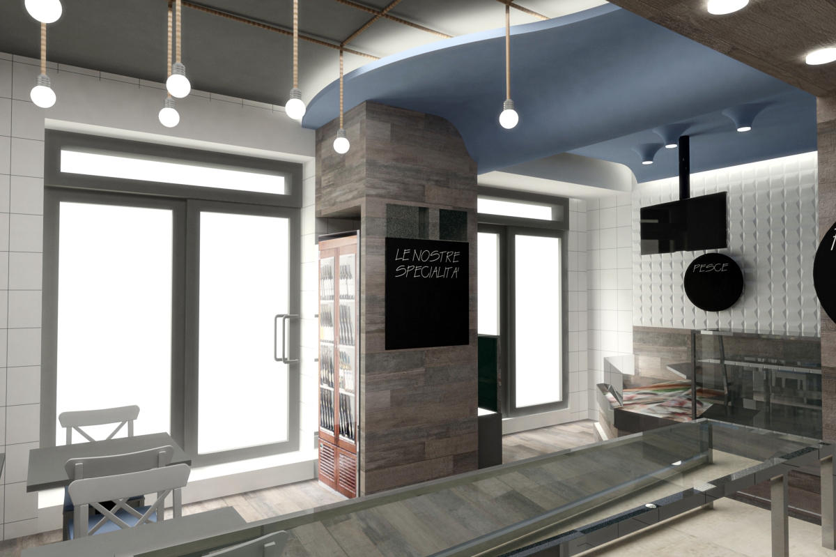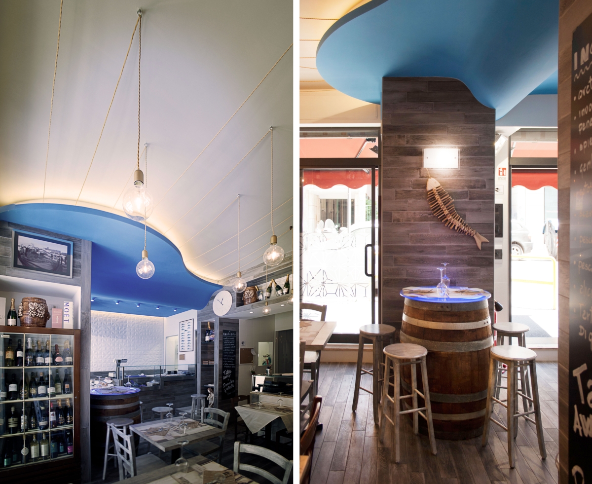 Gli elementi tridimensionali fanno riflettere la luce e brillano come le squame dei pesci. L’elemento che lega gli ambienti è a soffitto. Una grande onda blu che parte dalla zona espositiva del pesce fresco “inondando” il resto dello spazio terminado con una sinuosa curva e delle corde che terminano in ampolle luminose. Una visione poetica come dei pescatori che ritirano le reti dal mare, qui declinata in modo scultoreo, riassuntivo e nello stesso tempo funzionale.