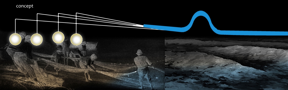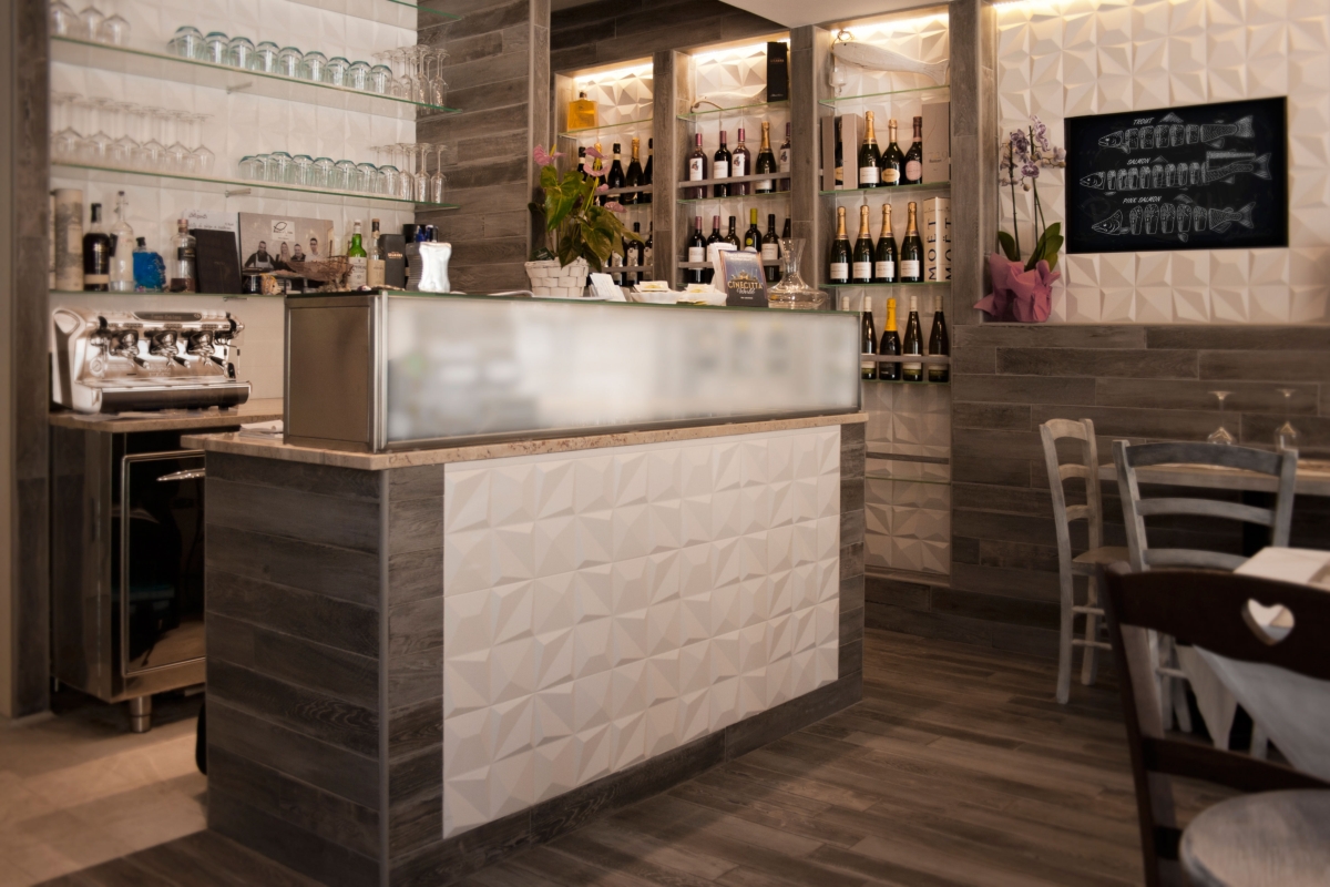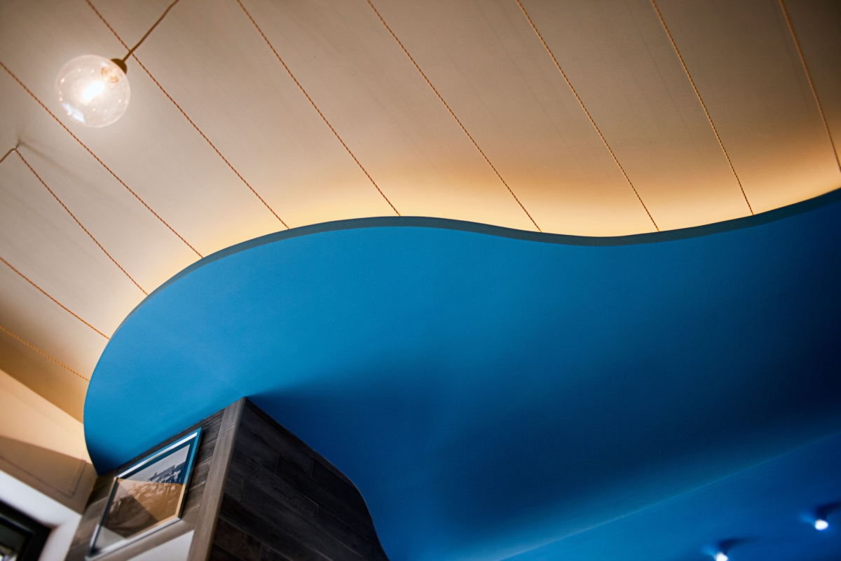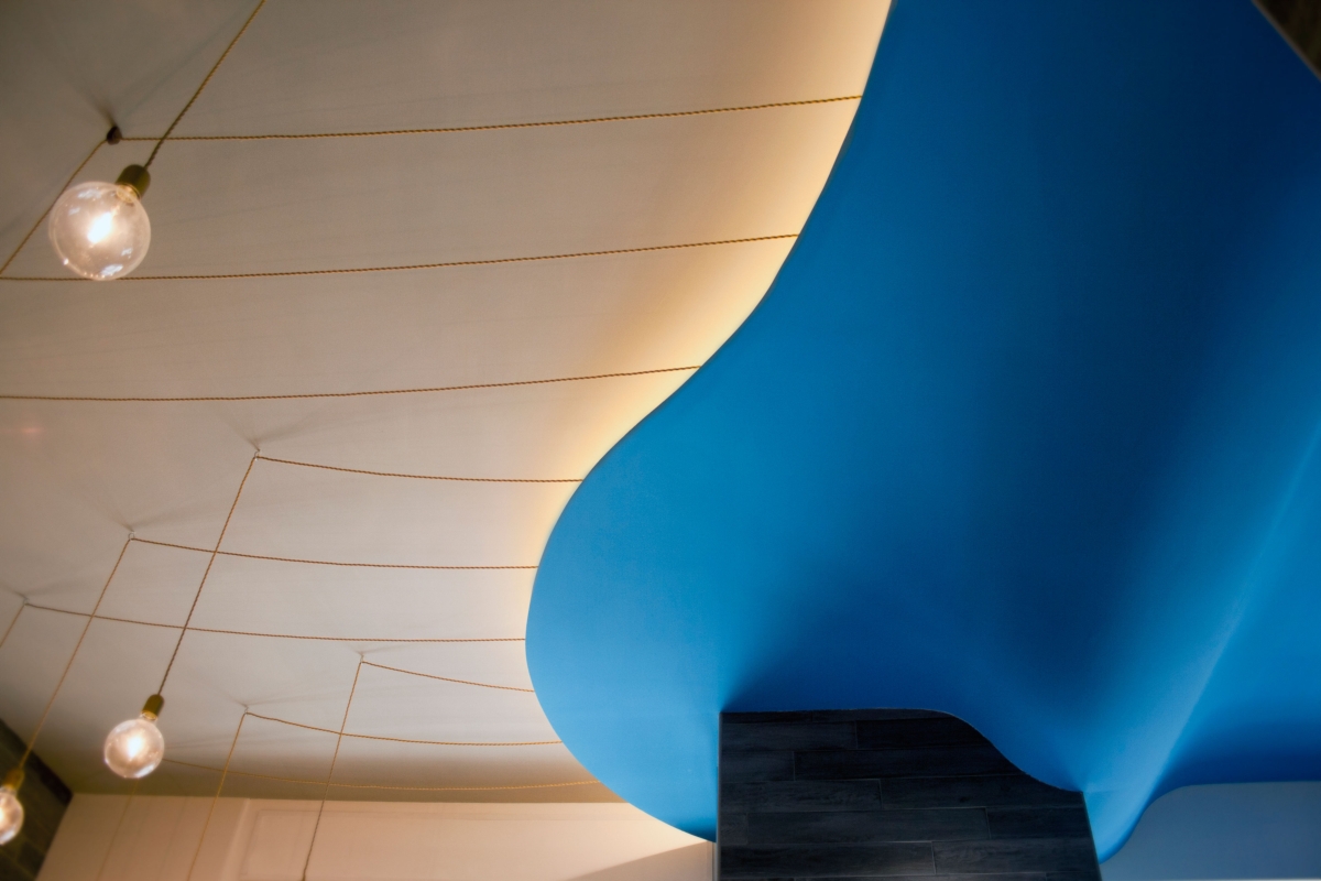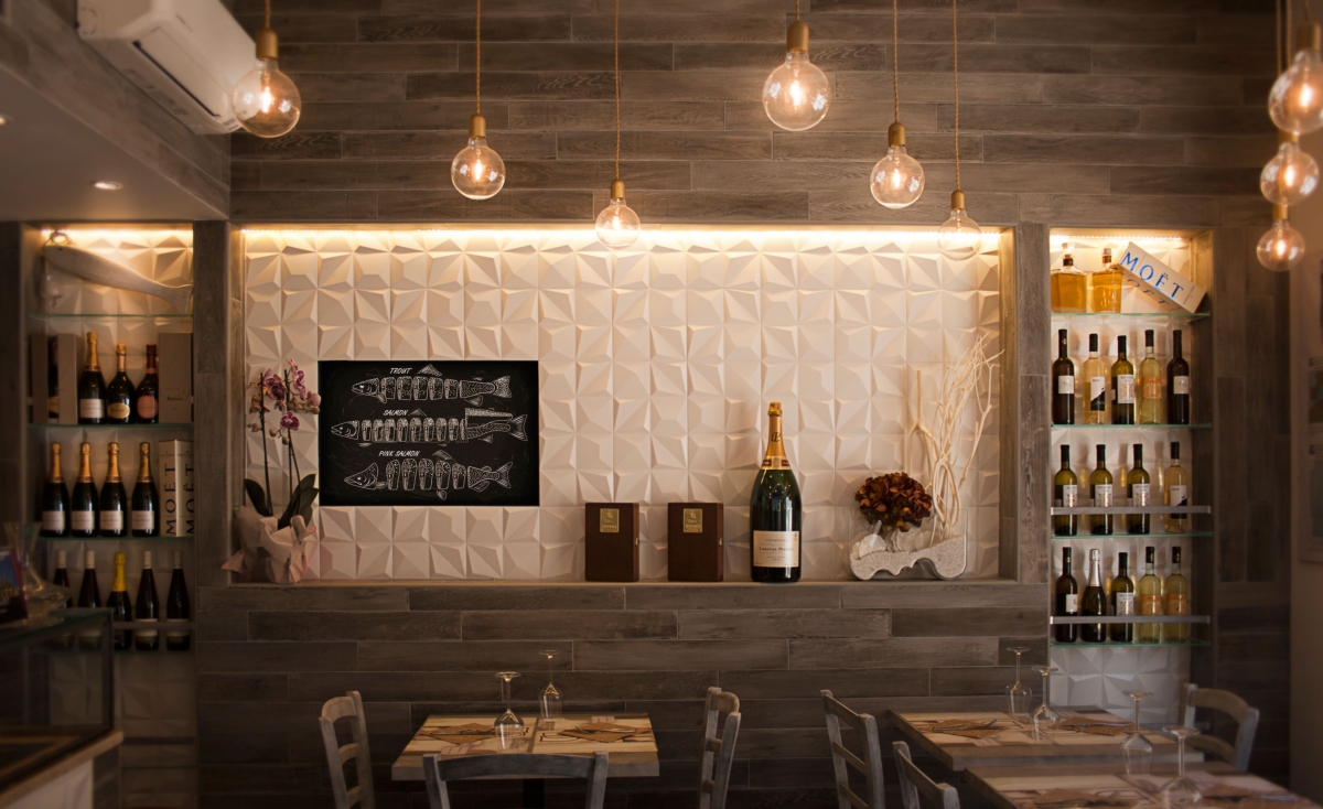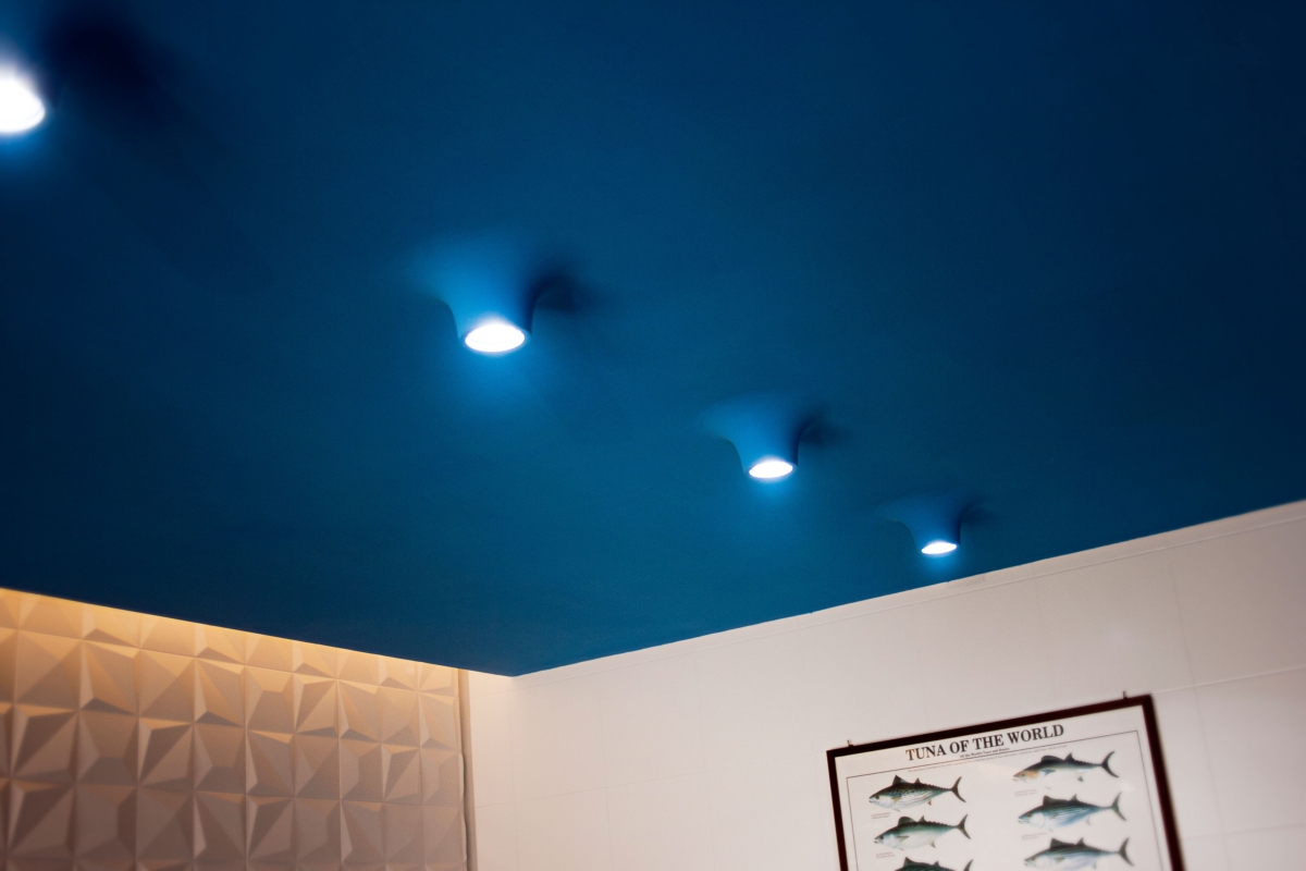Gli elementi tridimensionali fanno riflettere la luce e brillano come le squame dei pesci. L’elemento che lega gli ambienti è a soffitto. Una grande onda blu che parte dalla zona espositiva del pesce fresco “inondando” il resto dello spazio terminado con una sinuosa curva e delle corde che terminano in ampolle luminose. Una visione poetica come dei pescatori che ritirano le reti dal mare, qui declinata in modo scultoreo, riassuntivo e nello stesso tempo funzionale.