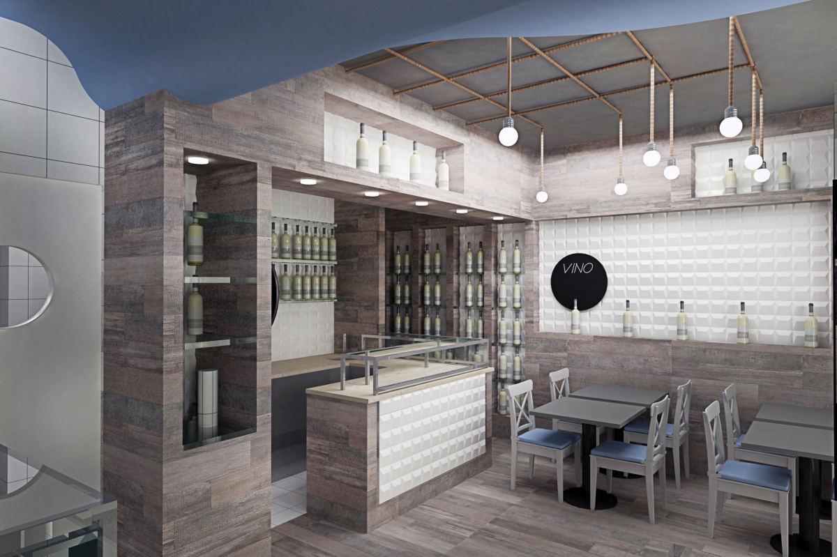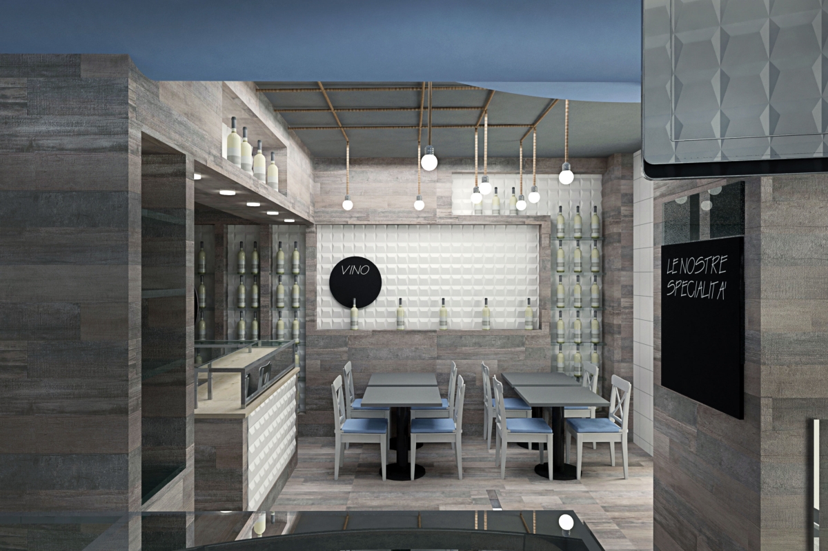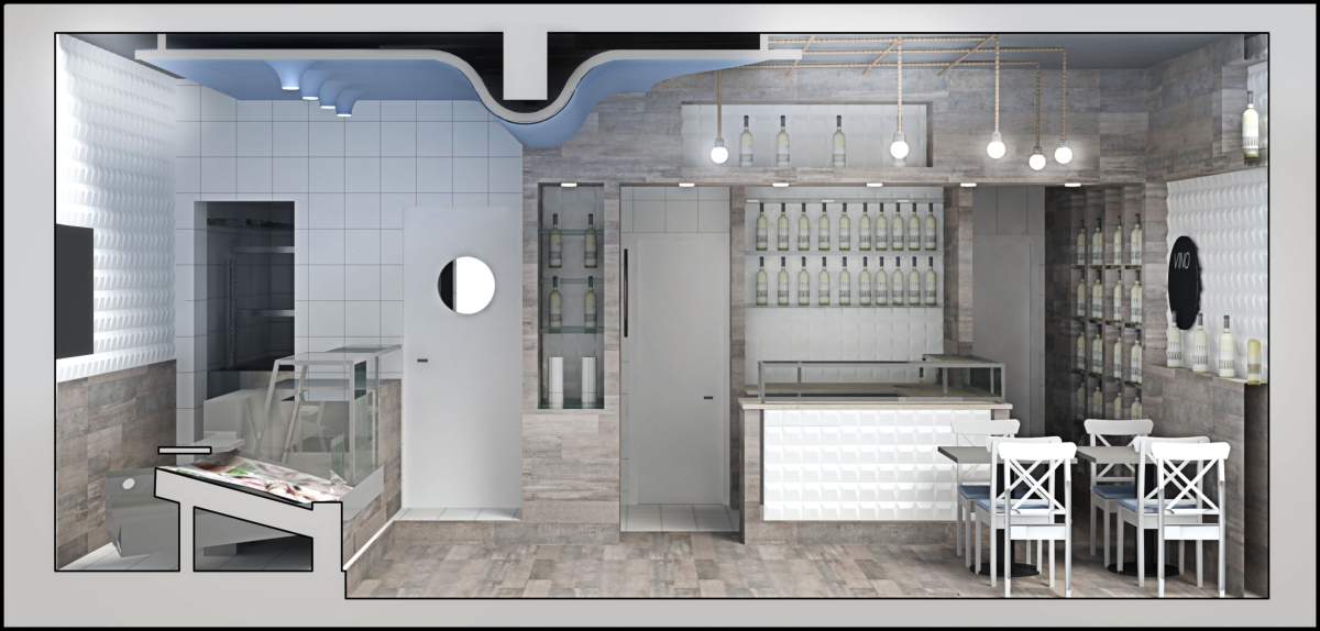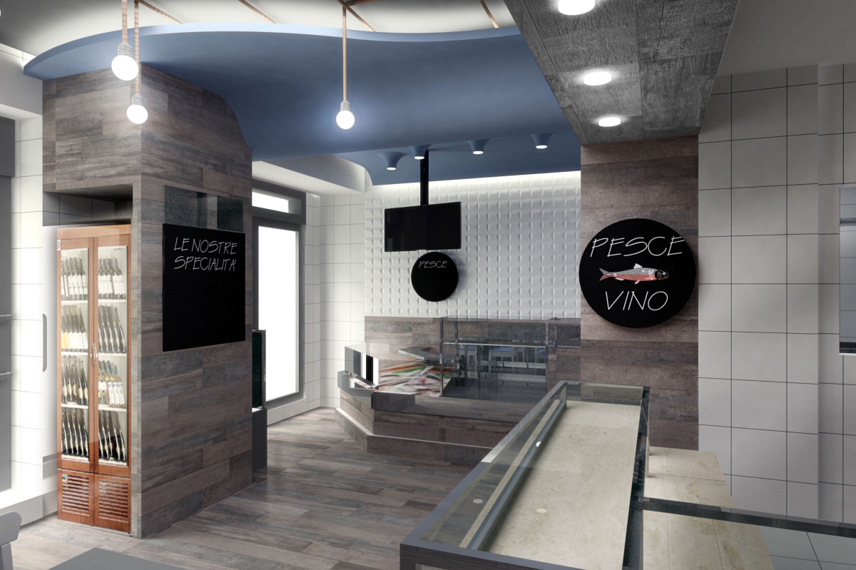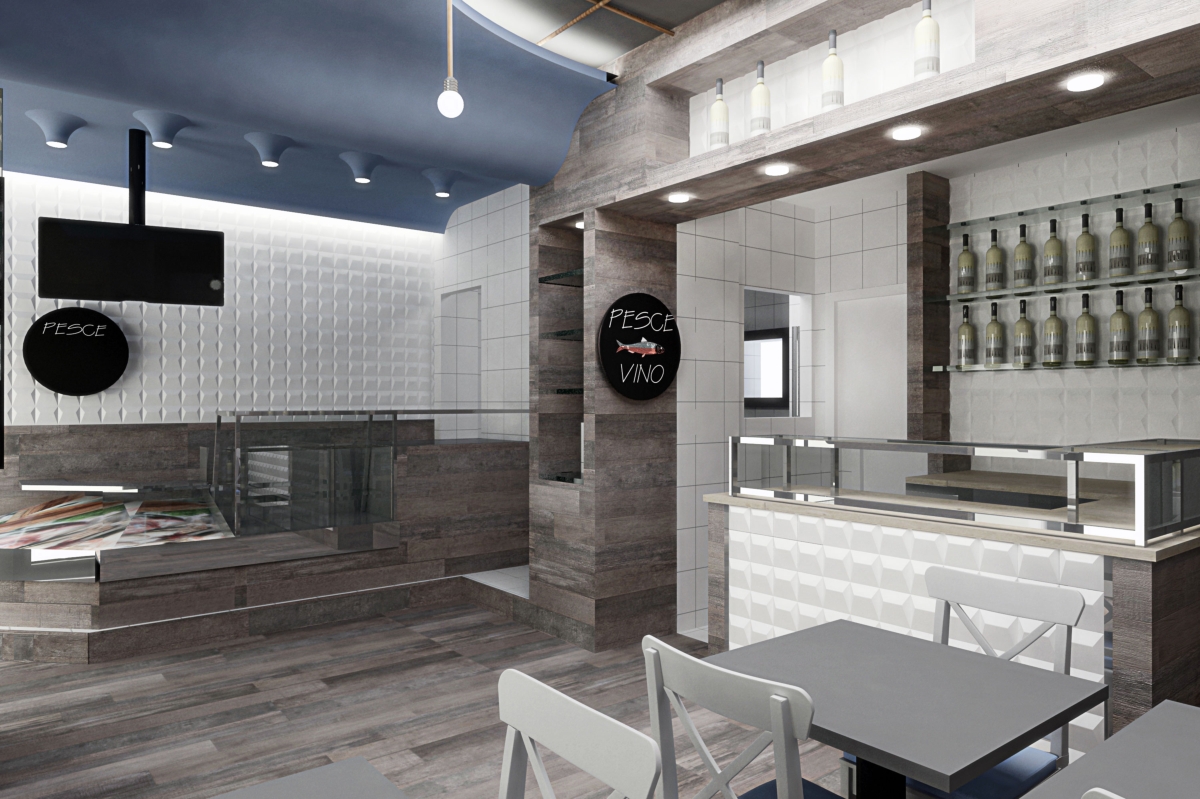 Pesci e Uva è il progetto di Davide Coluzzi per un locale nel quale sono ospitate due funzioni, quella di pescheria, quindi la vendita al dettaglio di prodotti ittici freschi e quella di ristorazione. L’intento è stato quello di dare la sensazione, nella somministrazione di cibi e bevande, di mangiare il pesce fresco come se fosse appena pescato, all’interno di un peschereccio.