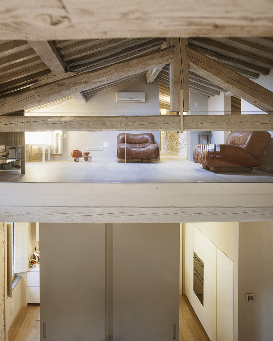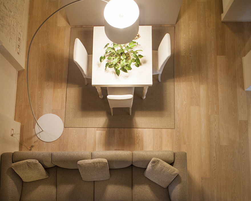 La zona living si distingue per l’altezza elevata con un doppio volume da cui si affacciano le zone più riservate dell’appartamento accessibili attraverso una scala a chiocciola metallica. Le pareti chiare con pietra a vista e la pavimentazione in rovere chiaro, conferiscono maggiore luminosità, creando un’atmosfera calda e accogliente. L’ambiente è completato da elementi di arredo bianchi e dal pavimento in legno rovere chiaro. Il livello superiore accoglie la zona notte, incorniciata dalla copertura con travi di legno a vista.