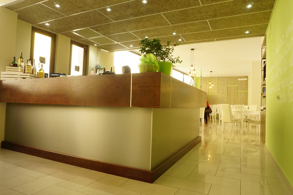 Una ristrutturazione low cost per fornire comfort ed un ambiente piacevole ai clienti ed, allo stesso tempo, un luogo di lavoro che fornisse le comodità richieste dall’alta cucina. Il corpo dei bagni centrali è stato trasformato nel banco bar che connette due sale, la cucina a vista e le piante aromatiche mettono in contatto la preparazione dei piatti con la loro degustazione, i pannelli fonoassorbenti definiscono una texture che da carattere ed intimità alle sale.