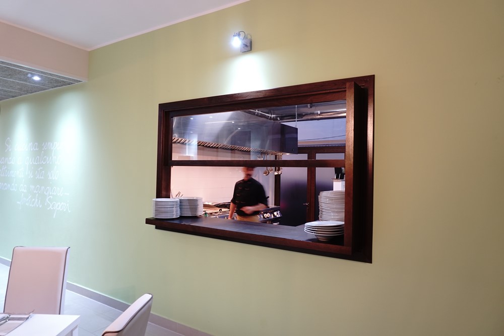 Il lavoro ha riguardato anche la progettazione degli arredi in legno, pass, panadora e banco bar, e l’assistenza nella scelta dei materiali e sistemi di illuminazione.