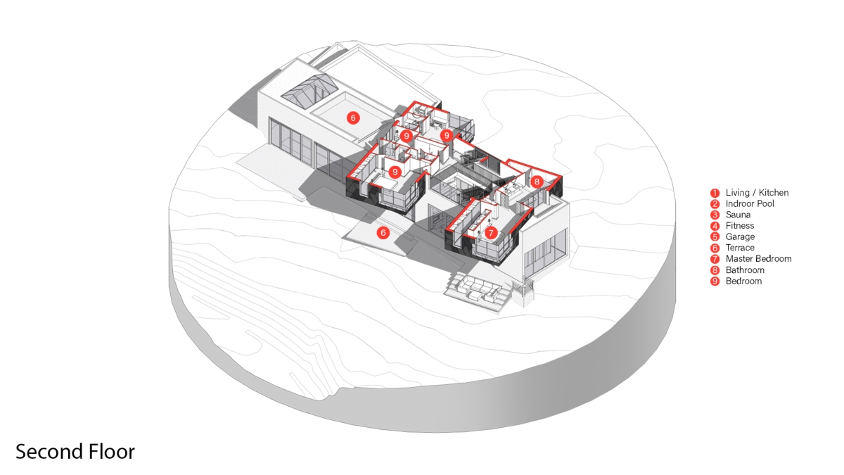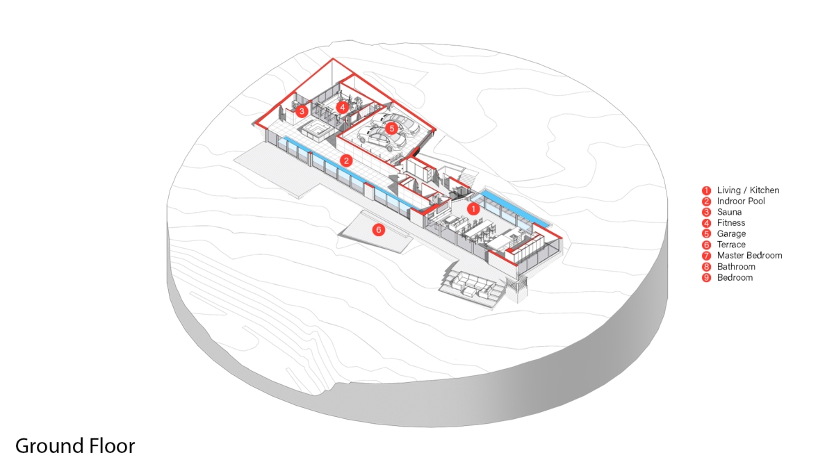 La grande sezione centrale del primo piano è trasparente fino all’estremità opposta dell’ingresso. L’idea alla base era quella di ridurre al minimo il confine tra interno ed esterno. La stanza aperta e stretta si trova nel retro della zona. Questo è uno ‘spazio di pensiero’, dove si può ‘fare una passeggiata sull’acqua’. La presenza di acqua è significativa per i residenti, in quanto diffonde una sensazione rinfrescante e organica nello spazio. La lunga piscina coperta, allungata accanto alle finestre che si affacciano sul cortile anteriore, conduce alla palestra.