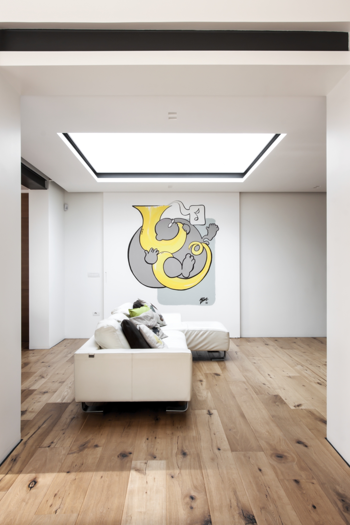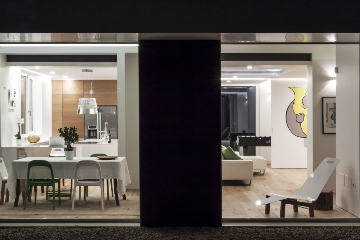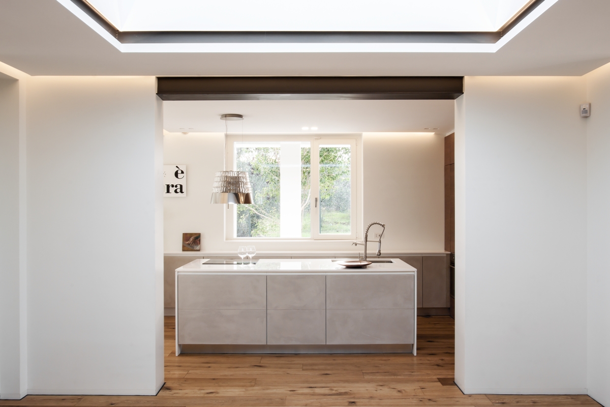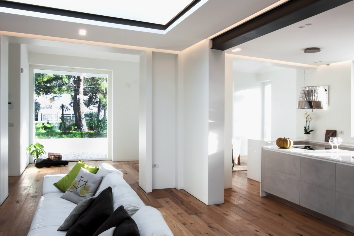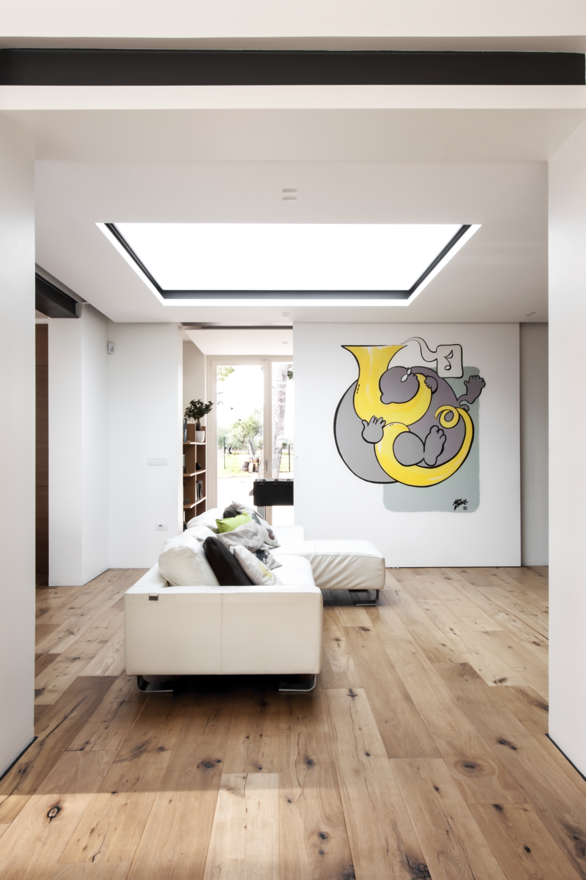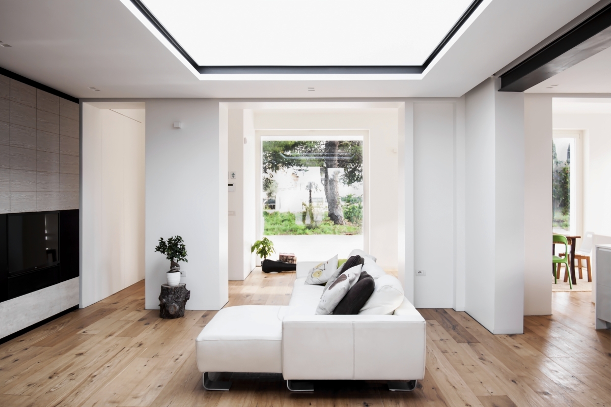 Tutta la villa è progettata come un grande open space, uno spazio fluido, ambienti quasi liquidi che confluiscono in una grande stanza centrale, illuminata da un grande lucernario, il vero e proprio cuore della casa.