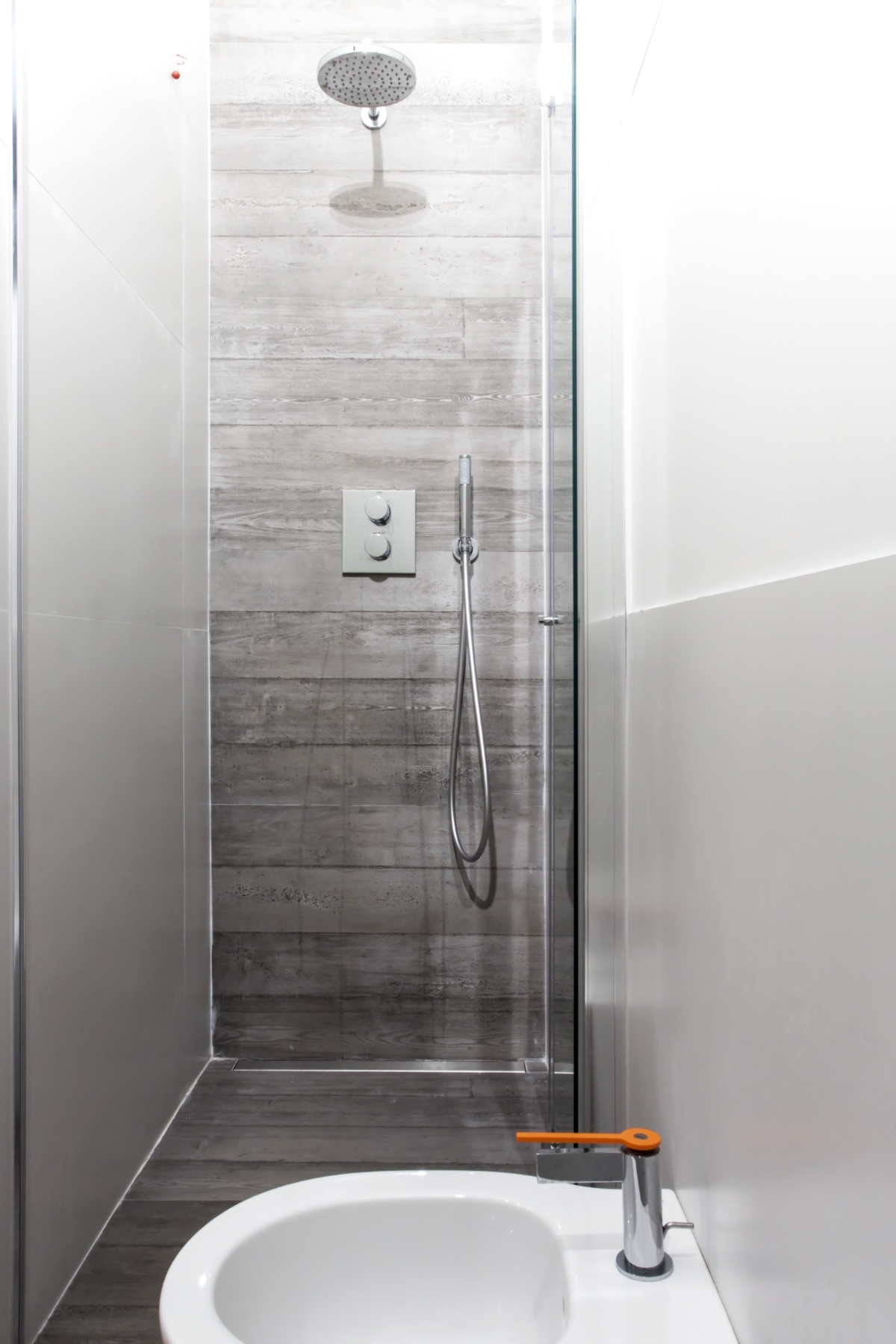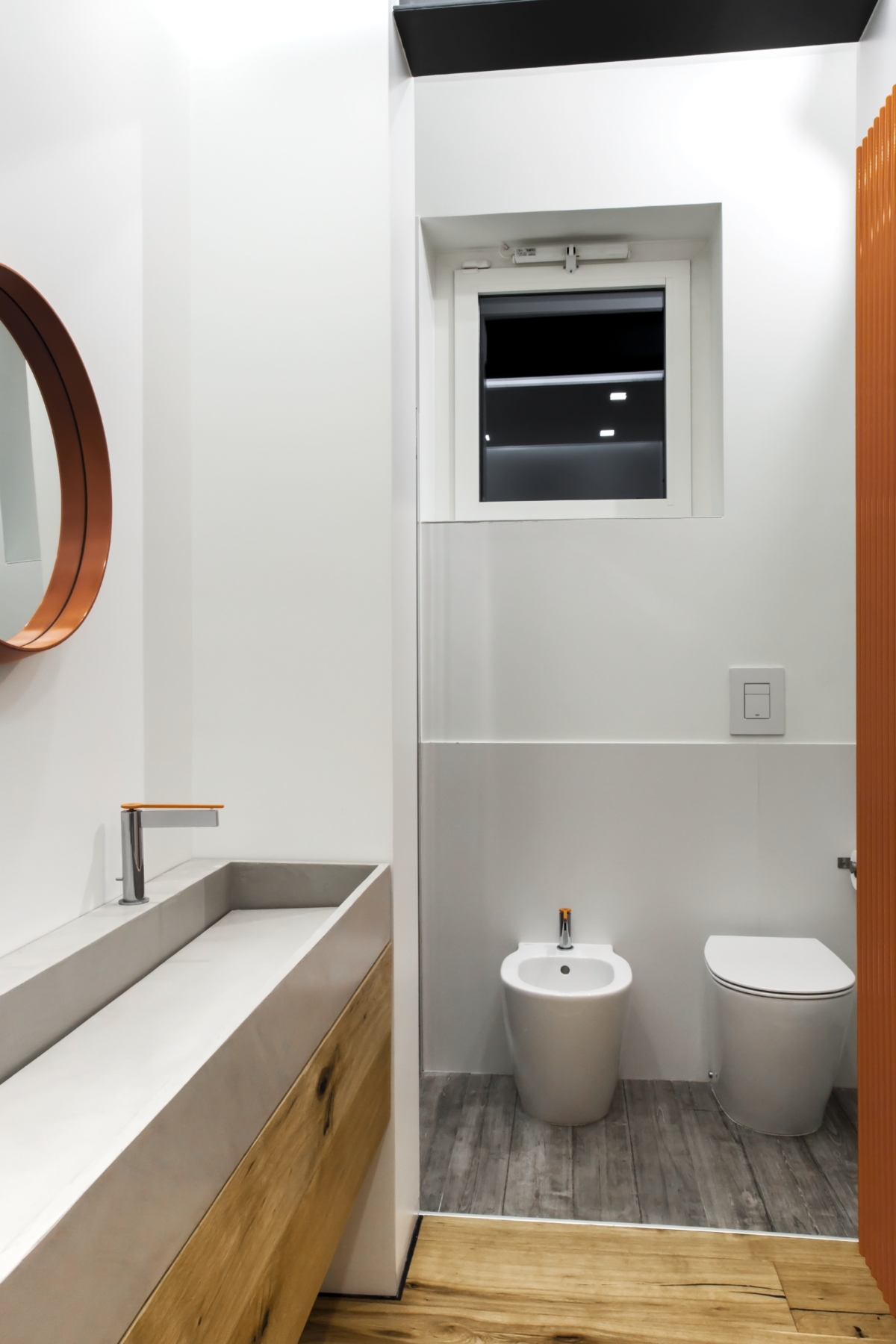Lavabo in compensato marino con finitura resinata e rubinetteria “Treemme”, per il bagno destinato ai ragazzi.