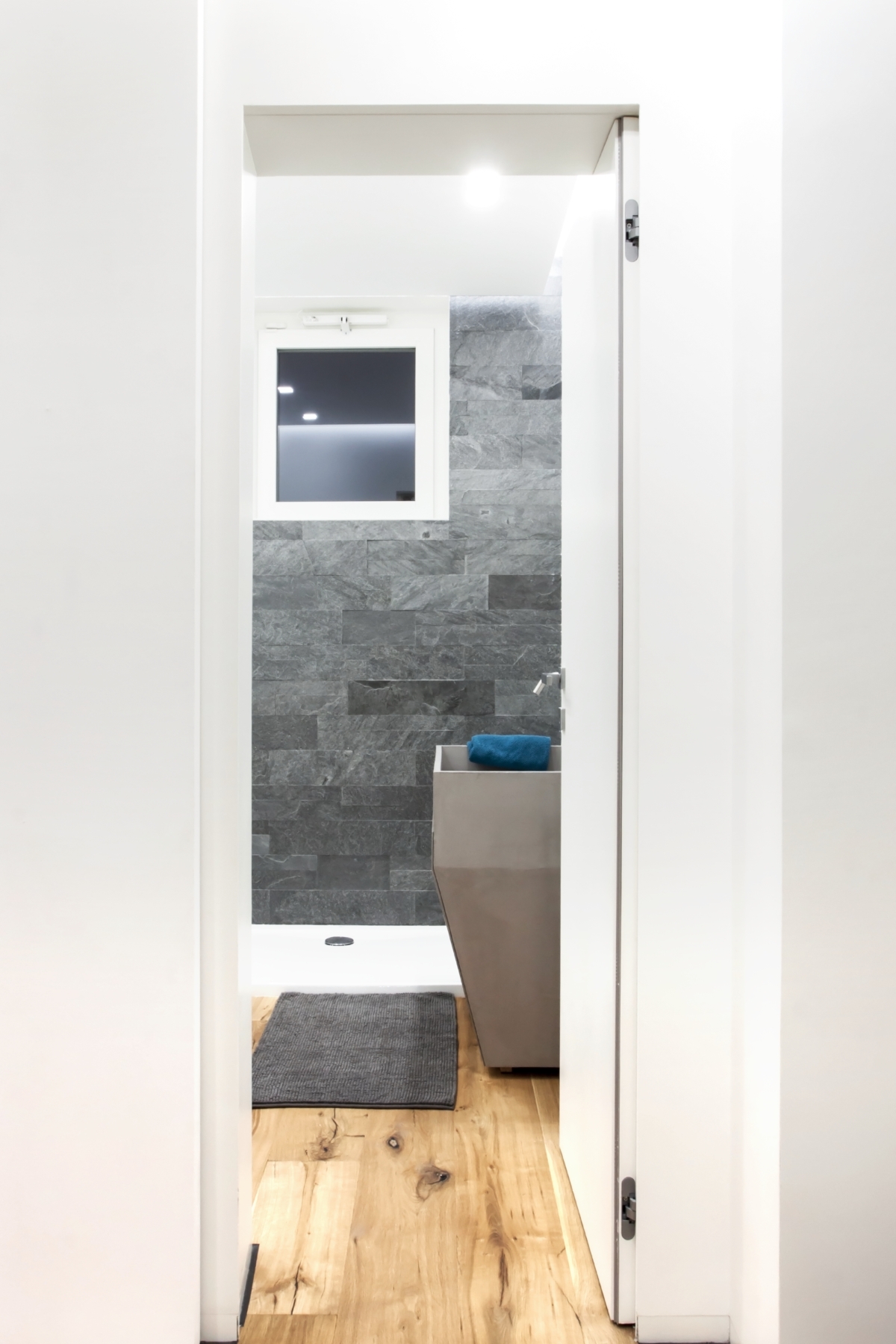 Anche l’interior design ha rispettato le regole dell’approccio ambientalmente e socialmente sostenibile: lo studio m12 AD infatti, ha realizzato la cucina, le armadiature e l’arredo bagno, con l’ausilio di legno rivestito in resina naturale da artigiani locali.