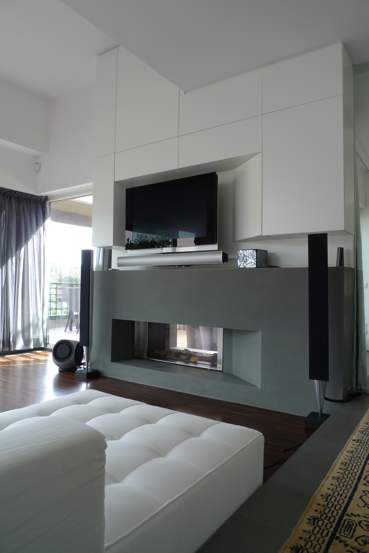 Ad accentuare questa percezione è stata realizzata in soggiorno una parete vetrata di circa 6,5 metri a “L” che gravita sul camino con apertura bifacciale che, con la sua funzione baricentrica, apre visivamente all’esterno e dilata lo spazio.