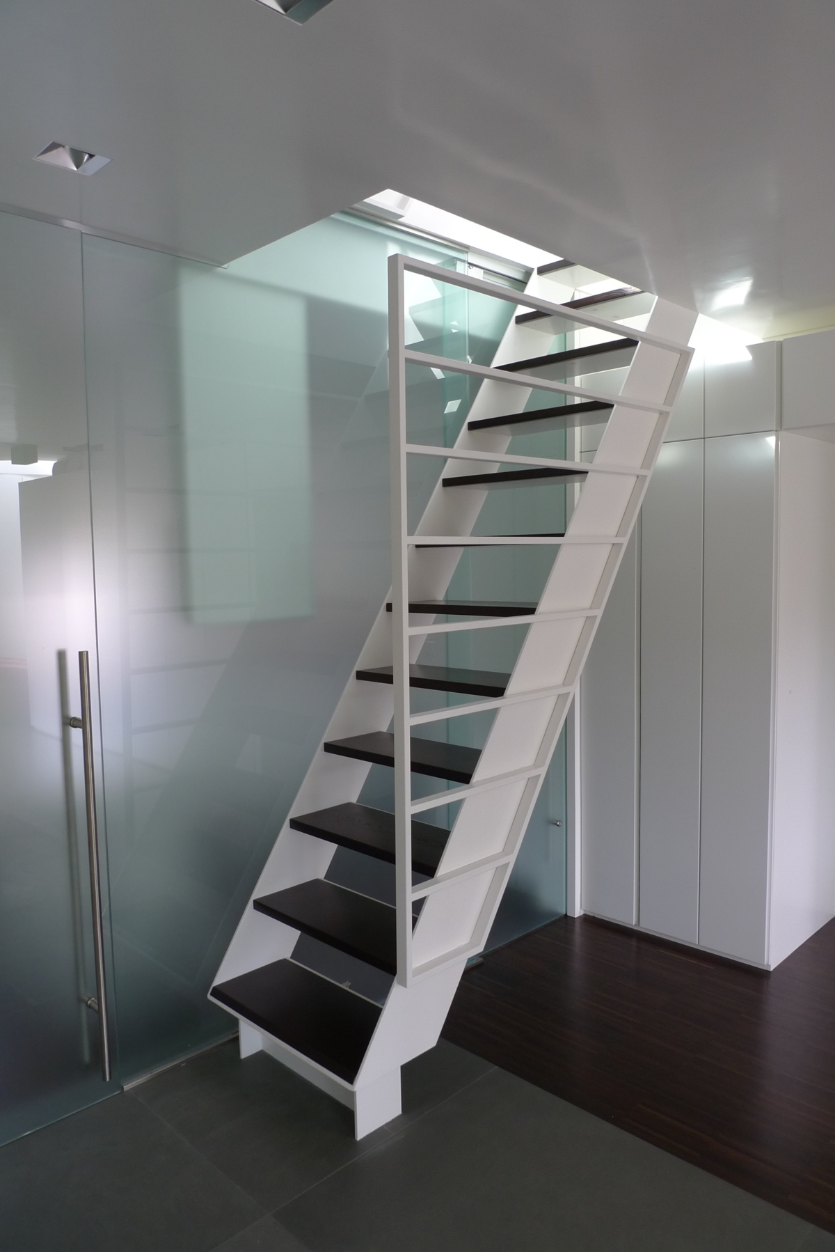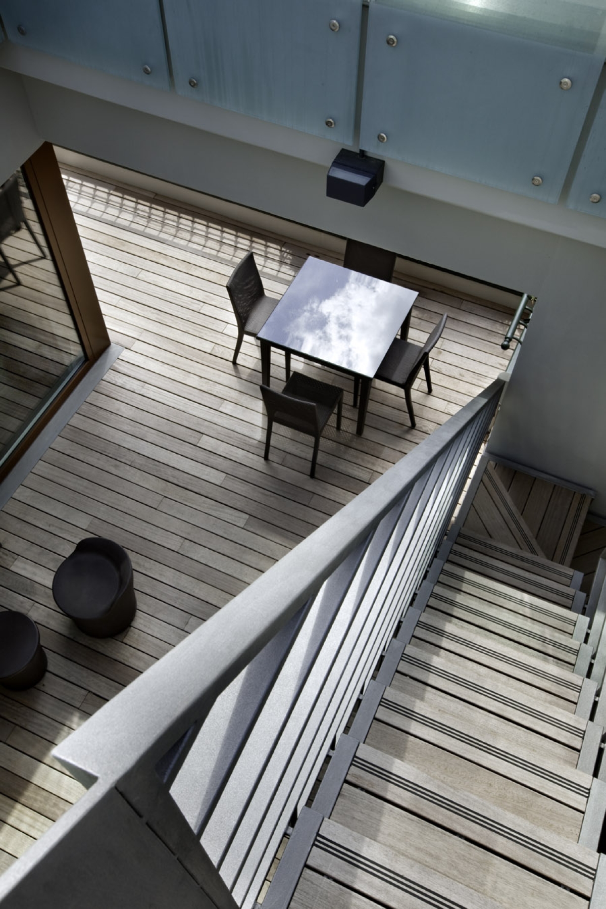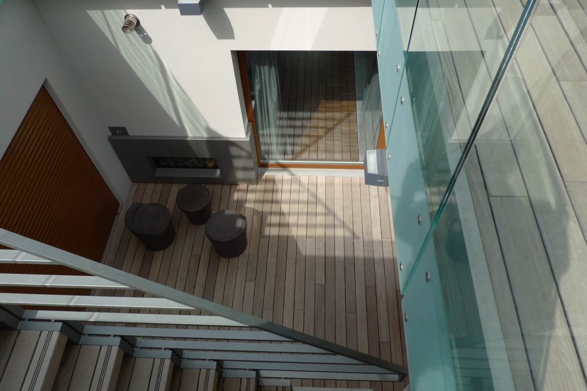 La scala esterna, in acciaio verniciato e con gradini in legno da outdoor, conduce alla terrazza superiore su cui si affaccia con un pianerottolo a sbalzo che non interferisce con il disegno dei gradoni che raccordano due quote della terrazza. La scala si svolge all’interno di un foro quadrato che connette visivamente i due livelli, segnato sul perimetro da una serie di lastre di vetro stratificato.
