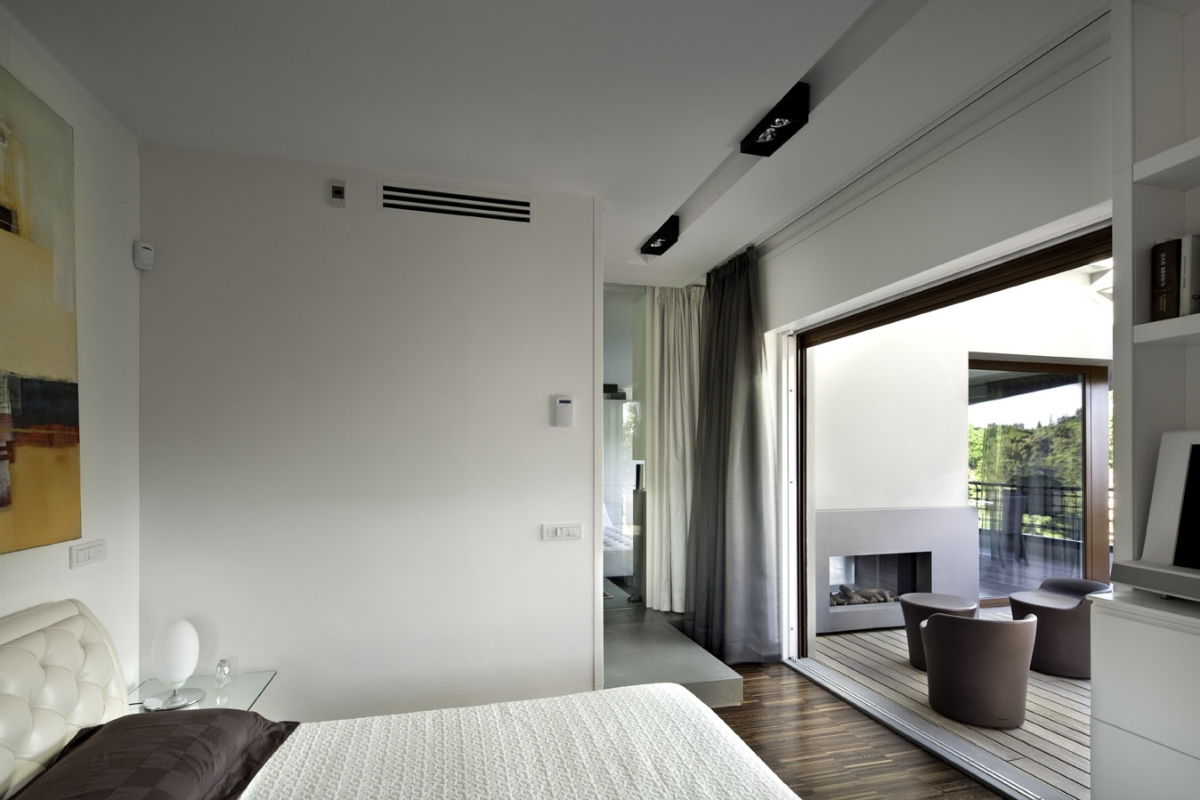 La dilatazione degli spazi attraverso le partizioni vetrate filtrate con tende si compie anche tra la camera da letto matrimoniale e il soggiorno in collegamento visivo per mezzo di un vetro trasparente a tutt’altezza, schermato quando serve da tendaggi oscuranti, garantendo viste incrociate che rendono la casa quasi totalmente permeabile e fruibile sia all’interno sia all’esterno.