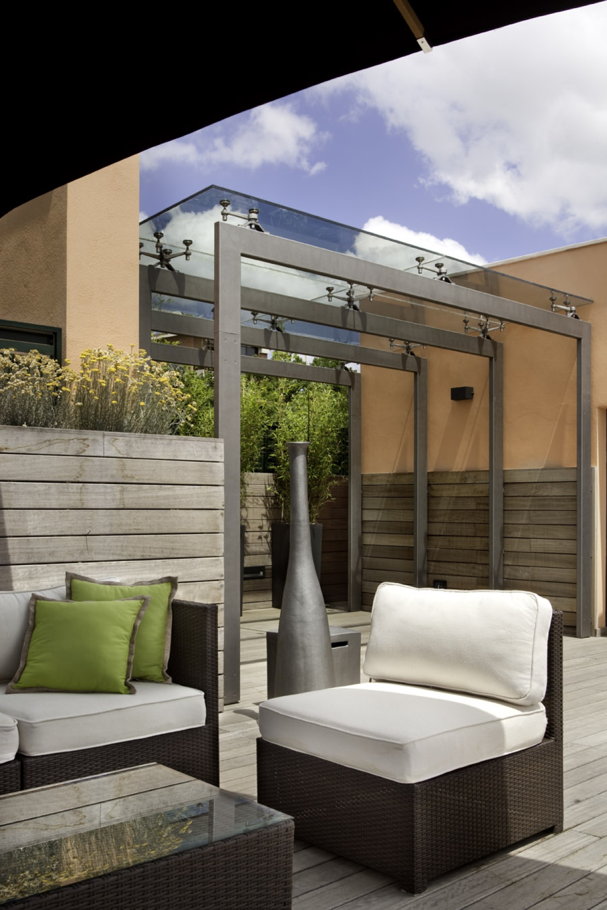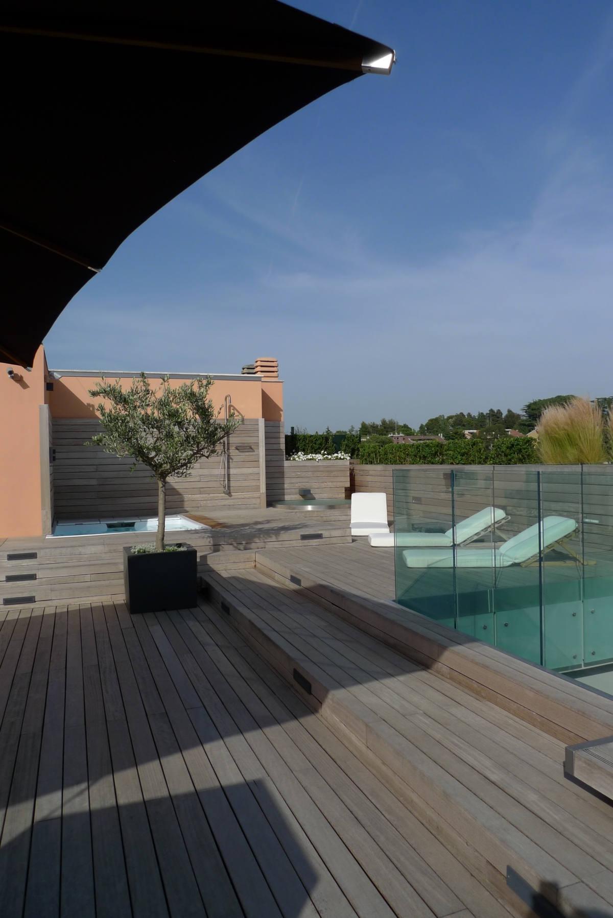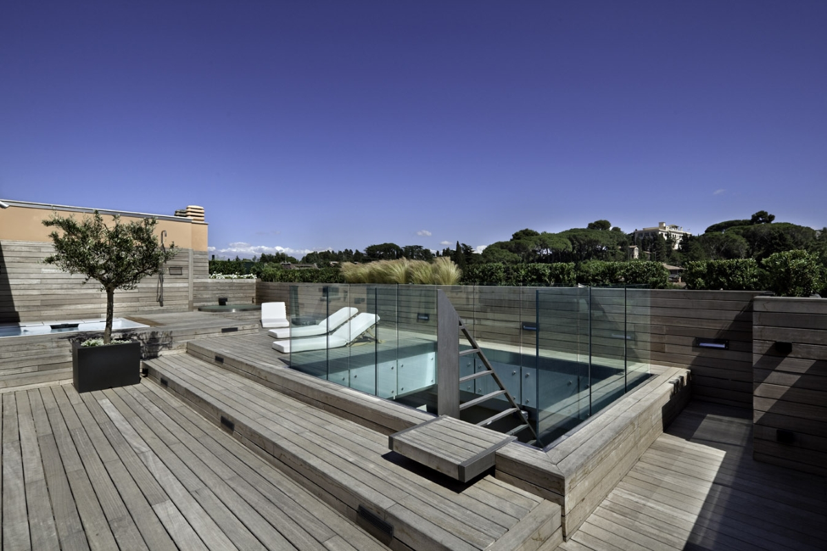 Nella parte alta della terrazza si trova una minipiscina incassata, una doccia con il piatto posato a scomparsa sotto il decking e un solarium. Nella parte bassa della terrazza, oltre a un grande bancone cucina con barbecue e lavello, si trova lo spazio living con divani e ombrellone. Il tutto è completato da una tettoia coperta con lastre di vetro, sostenute da crociere in acciaio inox e fissate a un sistema di telai in acciaio verniciato.
