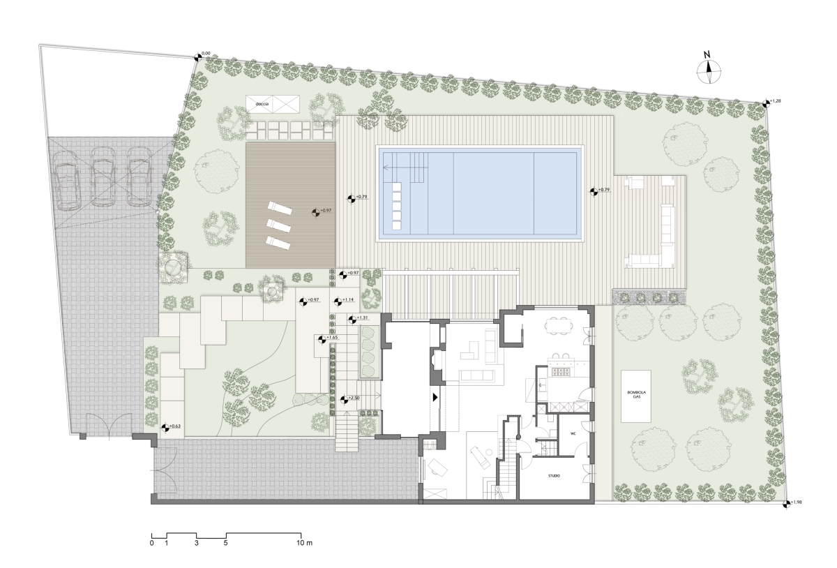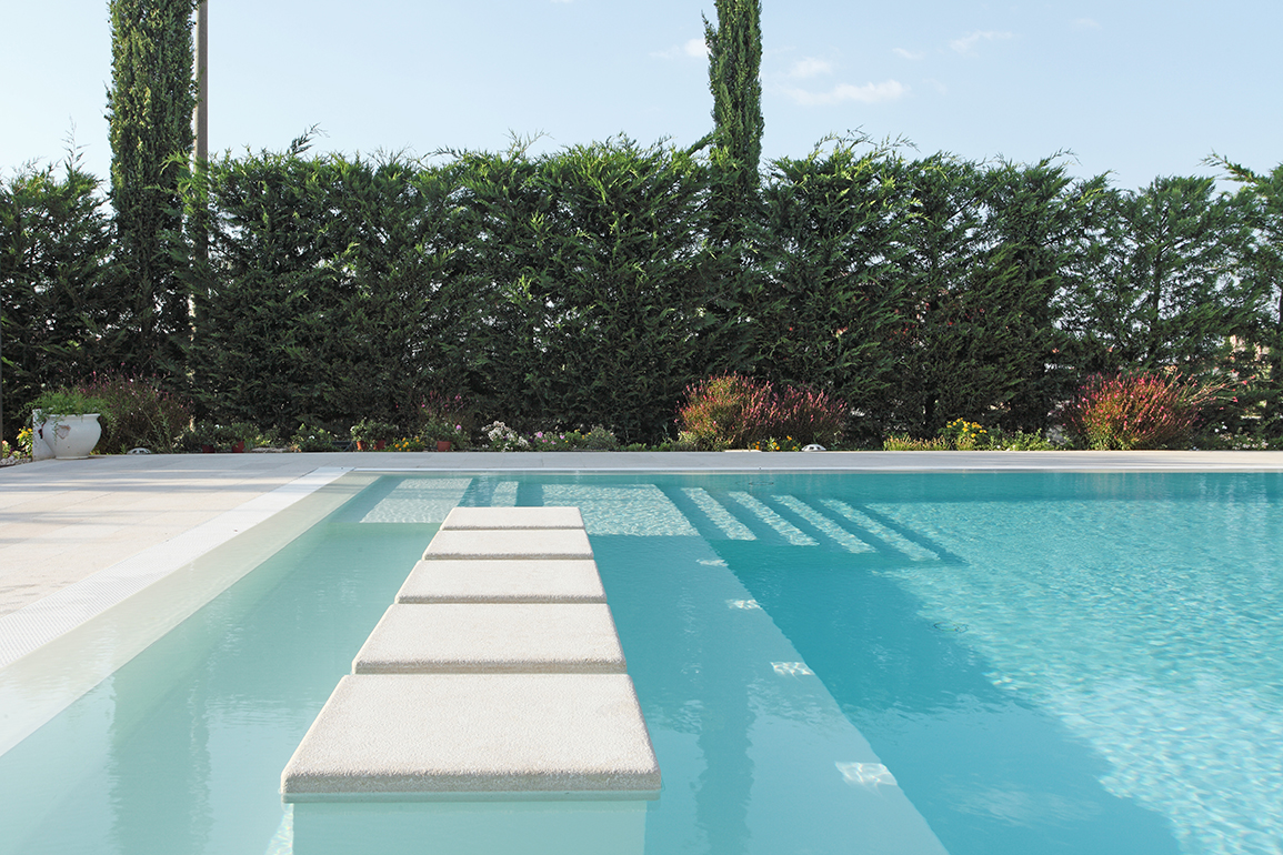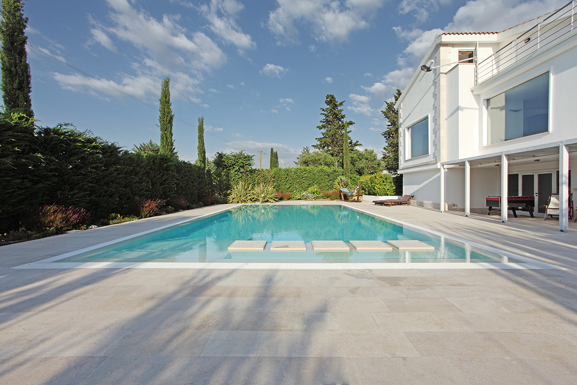Particolare cura è stata inoltre dedicata nell’adattare il progetto al paesaggio circostante, fatto di ulivi, pini, cipressi e alberi da frutto, attraverso l’inserimento di piante autoctone tipiche della macchia mediterranea. Il progetto ha avuto come tema la convivialità e il relax in tutte le stagioni, ed è stato incentrato sull’elemento giardino, che si sviluppa intorno a una scenografica piscina rettangolare, a sfioro. La continuità della superficie dell’acqua è interrotta da quattro blocchi in pietra affioranti, che, in prossimità dell’area di accesso alla piscina, definiscono una zona “conversazione”, ideata per permettere di prendere il sole in acqua, magari bevendo un fresco drink.