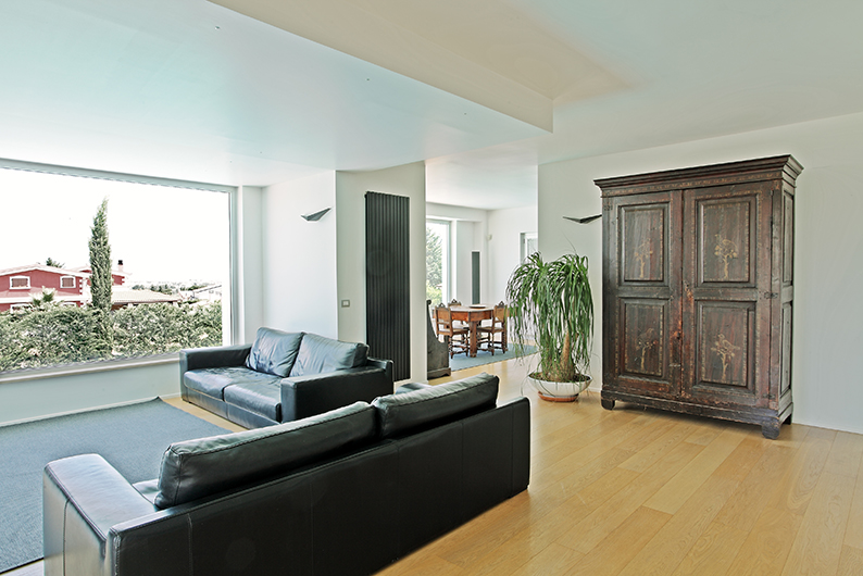 L’ambiente interno infatti, è progettato come uno spazio aperto, fluido e dinamico, delimitato da ampie vetrate, in cui convivono sala da pranzo e cucina, dallo stile intimo, con pareti bianche che si mescolano dolcemente al calore del pavimento in legno di rovere. Uno spazio invaso dalla luminosità mediterranea, vivacizzato da elementi a contrasto, come il divano in sala da pranzo e l’arredo cucina dai colori scuri, e l’antico armadio di famiglia in noce.
