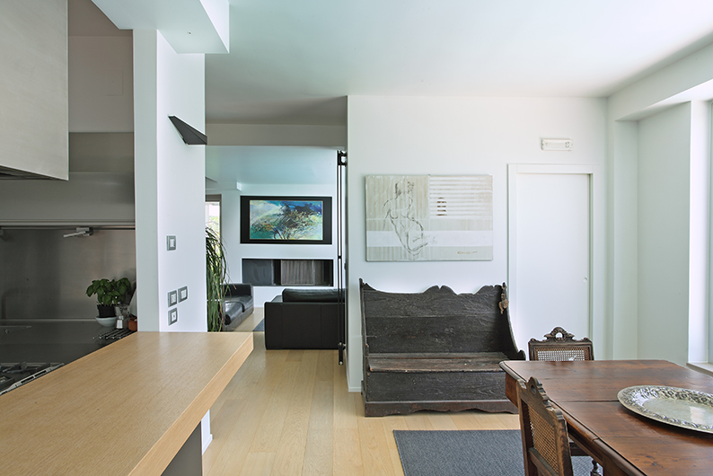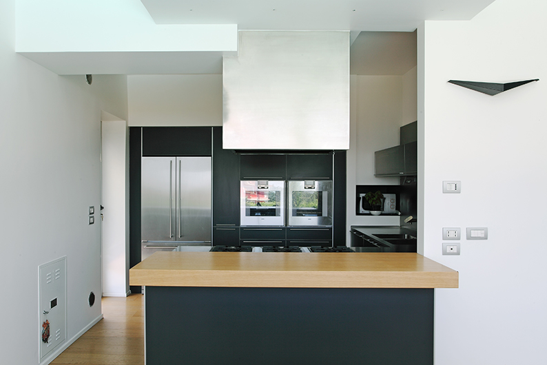 Grande attenzione è stata posta nella fase di progettazione della cucina, ampia e altamente tecnologica, che fronteggia, in una commistione tra antico e moderno, il tavolo di famiglia, degli inizi del ‘900.