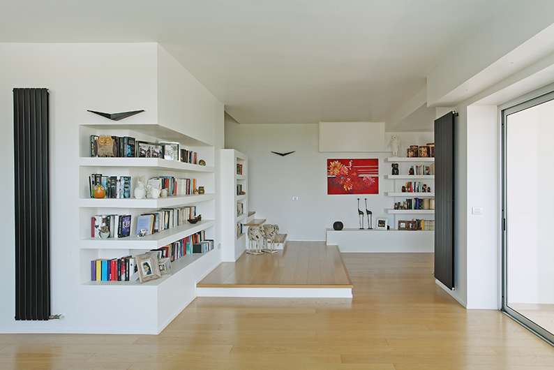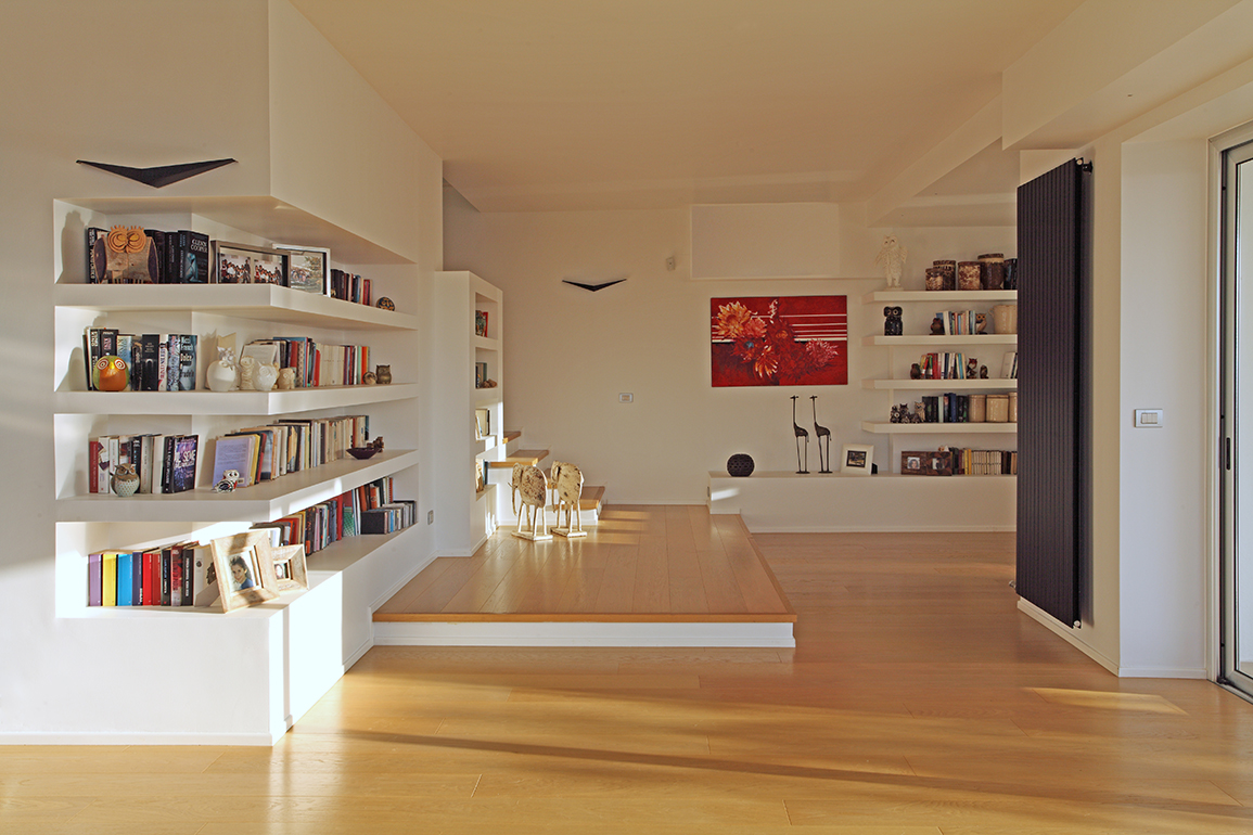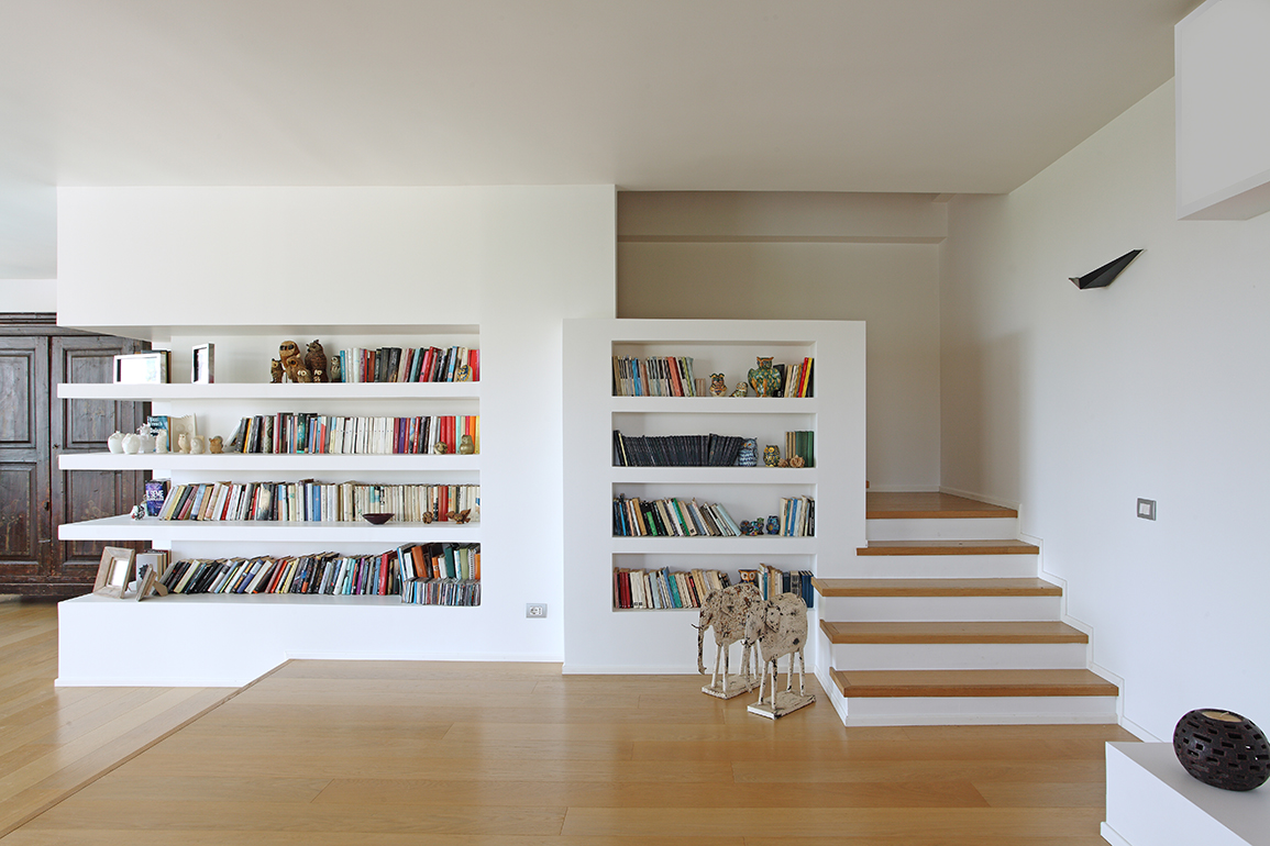 Lo spazio è arricchito da un sistema di librerie in muratura che ospitano i numerosi libri e i gufi collezionati dai padroni di casa nel corso di numerosi viaggi. Dalla zona living inoltre si accede tramite una scala alla zona notte al piano superiore. Tutti gli spazi, sono stati concepiti come racchiusi in una grande bolla di vetro, in modo da avere la visuale calda e rassicurante dell’ampio giardino, dell’azzurro del mare e del blu della piscina sottostante.