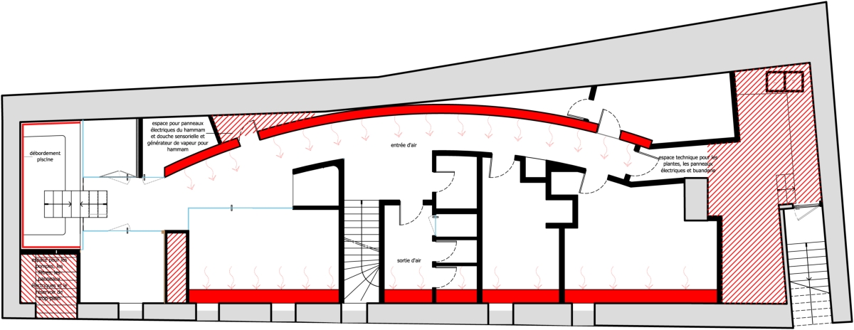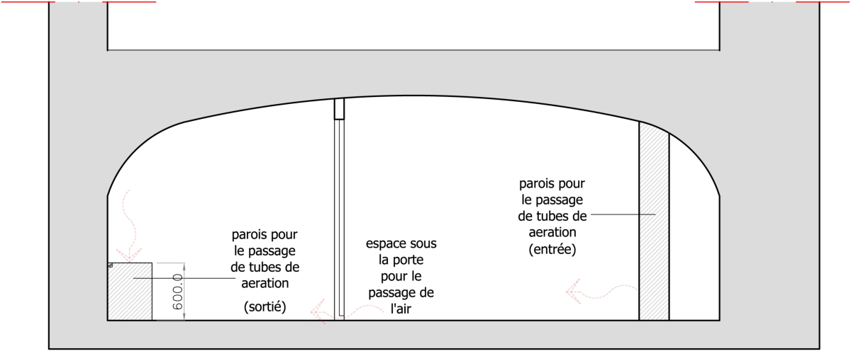 Esteticamente ricorda un’antica cripta ed è plausibile pensare che in passato abbia ricoperto proprio tale funzione, data la vicinanza della chiesa di St. Pierre. L’altezza del volume è particolarmente limitata, fino ad arrivare a circa un metro e venti centimetri nel punto più basso. Considerata la mancanza di aperture significative, l’ambiente poneva grandi difficoltà tecniche e richiedeva particolari soluzioni progettuali per l’installazione dei necessari impianti di trattamento dell’aria; il tutto senza rovinare un’estetica così caratteristica.