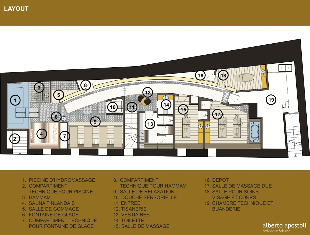 La Proprietà ha quindi deciso di varcare i confini nazionali e di rivolgersi allo Studio Apostoli, società specializzata nella progettazione di SPA e centri benessere a livello internazionale. L’incontro è avvenuto a Parigi, in occasione di Equip’hotel, dove Apostoli era presente in veste di ambasciatore per l’Italia.