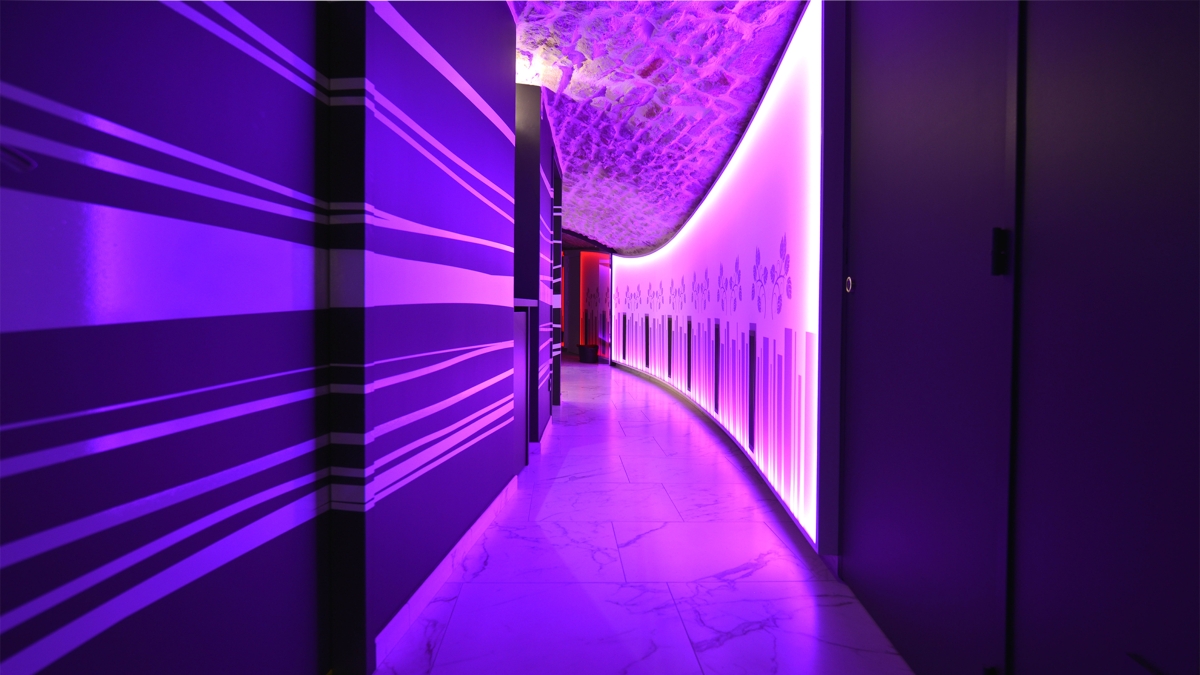 Mettere in risalto l’”esistente” dando forza espressiva al progetto. L’idea progettuale proposta da Alberto Apostoli ha subito soddisfatto le aspettative della Committenza, riuscendo a combinare esigenze tecniche ed estetiche, grazie all’intuizione di amalgamare elementi impiantistici a elementi scenografici. Il progetto è infatti caratterizzato da un lungo corridoio curvo che conduce verso la zona umida, da un lato, e verso le cabine trattamenti, dall’altro. Nel corridoio è stata ricavata una struttura che accoglie tutte le canalizzazioni e le nasconde dietro ad un telo-teso retroilluminato e contenente le bocchette di aerazione. Grazie ad un piccolo accorgimento grafico, le bocchette si fondono nel telo stesso fino a scomparire nel decoro che ricorda le vigne tipiche della città di Macon, famosa per il suo Chardonnay. In tal modo si è evitato l’abituale posizionamento a soffitto delle bocchette che avrebbe ulteriormente ridotto l’altezza disponibile.