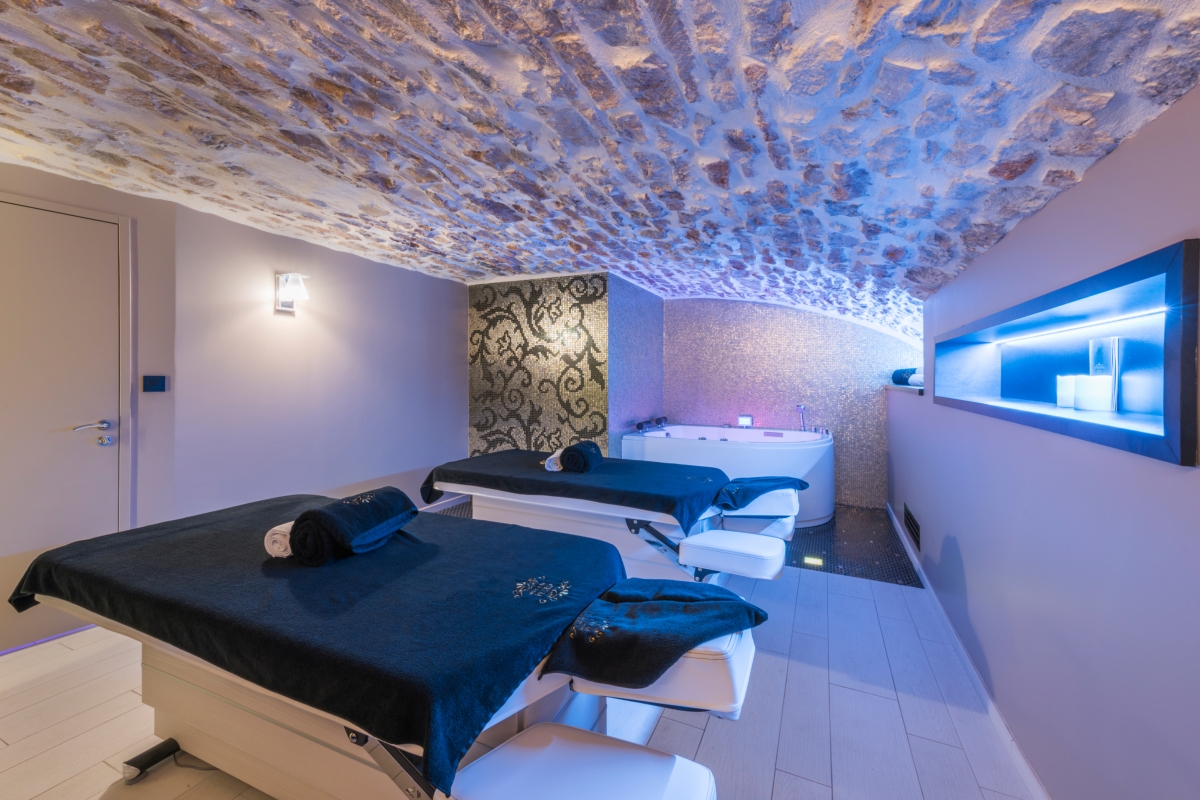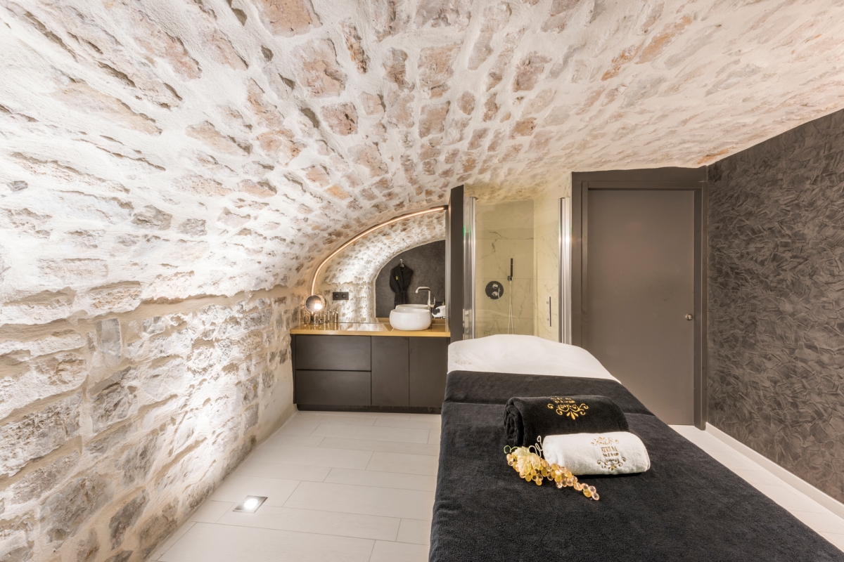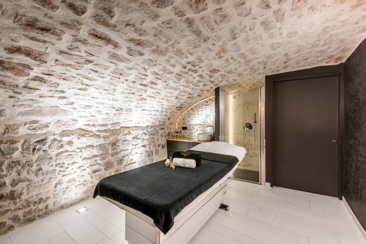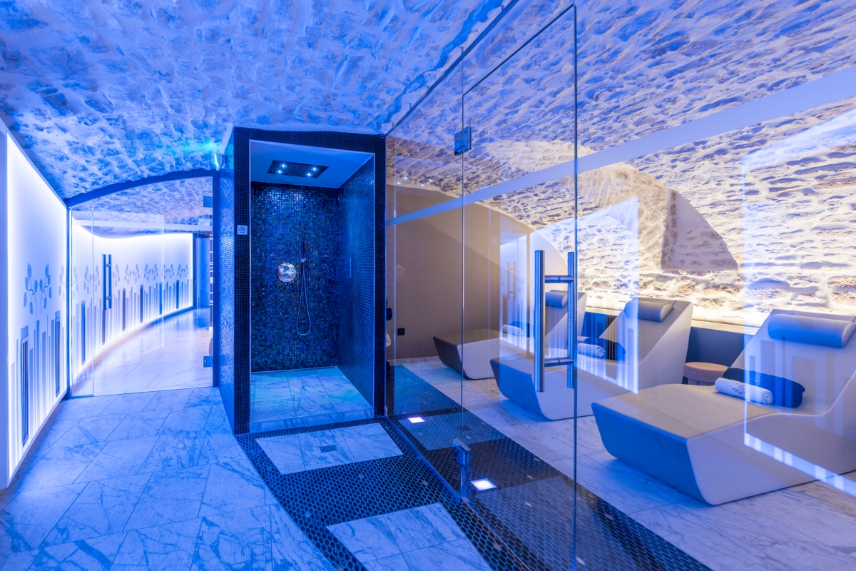 Nell’interrato la Proprietà ha voluto realizzare la zona più pregiata del centro benessere, nonostante le difficoltà tecniche e costruttive che lo spazio presentava. L’interrato si contraddistingue infatti per la sua copertura a volta ed è completamente realizzato in pietra.