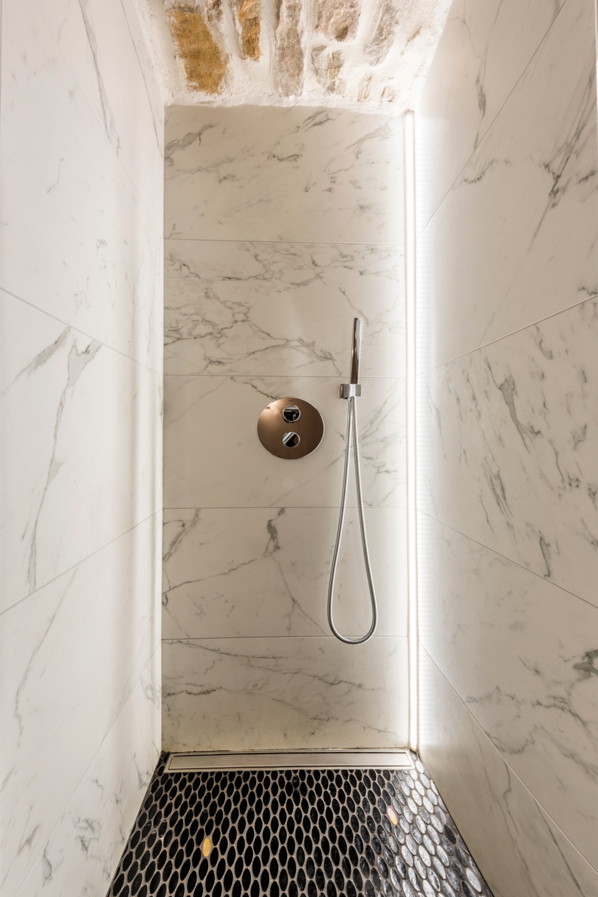 Per bilanciare il peso della pietra a vista e rendere l’ambiente più raffinato, Alberto Apostoli ha lavorato sui colori bianco, nero e inserendo alcuni dettagli oro.