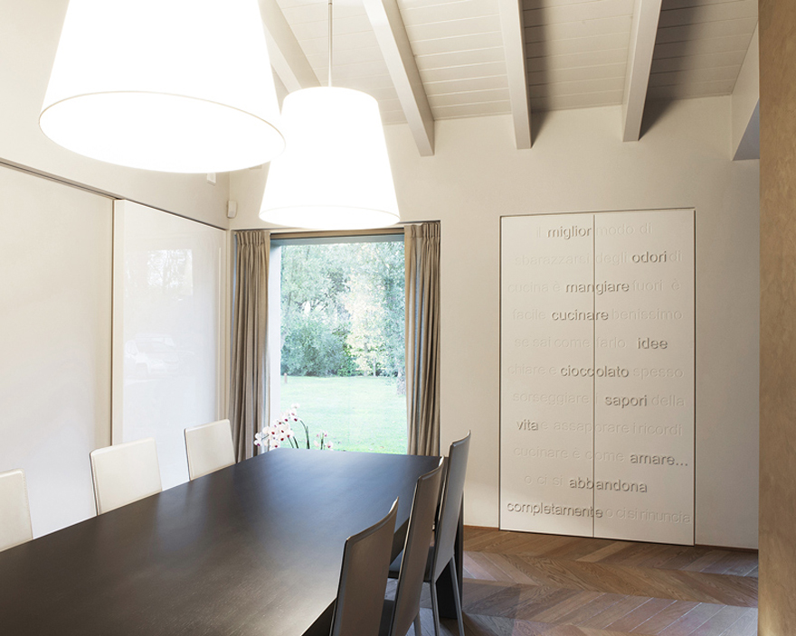 La zona cucina può essere messa in comunicazione con la zona pranzo ed il resto del living tramite l’apertura di ampi pannelli scorrevoli.
