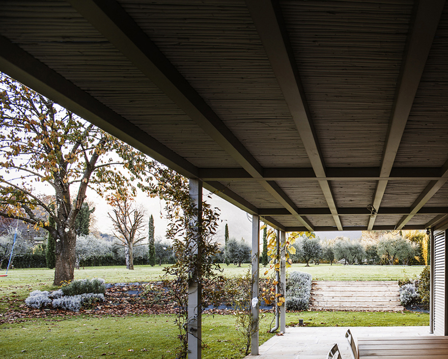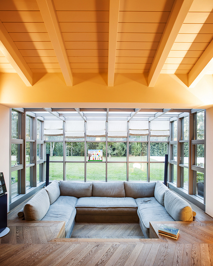 L’atmosfera di apertura è accentuata dal volume trasparente che sporge dal profilo principale e si immerge nella natura, eclissando totalmente la sensazione di qualsiasi confine. Non si tratta della “classica casa con giardino”, ciò che gliarchitettiassociati hanno sapientemente tradotto in forma è il concetto del “vivere”, completo di ogni sua accezione.