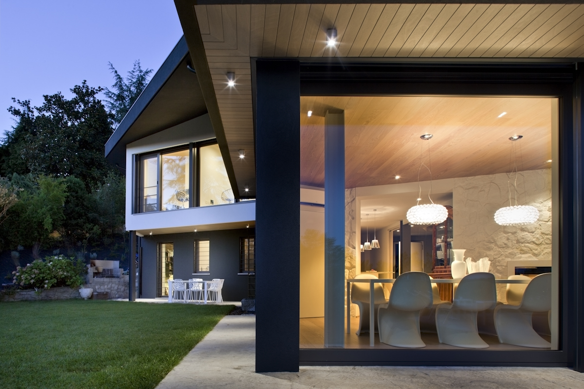 Per amplificare la luminosità degli spazi interni, oltre all’ingrandimento delle finestre esistenti, iarchitects è intervenuto sulla geometria esagonale dell’involucro, con l’aggiunta di un volume che ospita la sala da pranzo e il soggiorno, oltre ad una terrazza coperta al primo piano : un nuovo corpo, progettato con un sistema portante in acciaio e finestrature scorrevoli, per sottolineare la relazione continua con lo spazio esterno, con la piscina e il grande parco che circonda la casa.