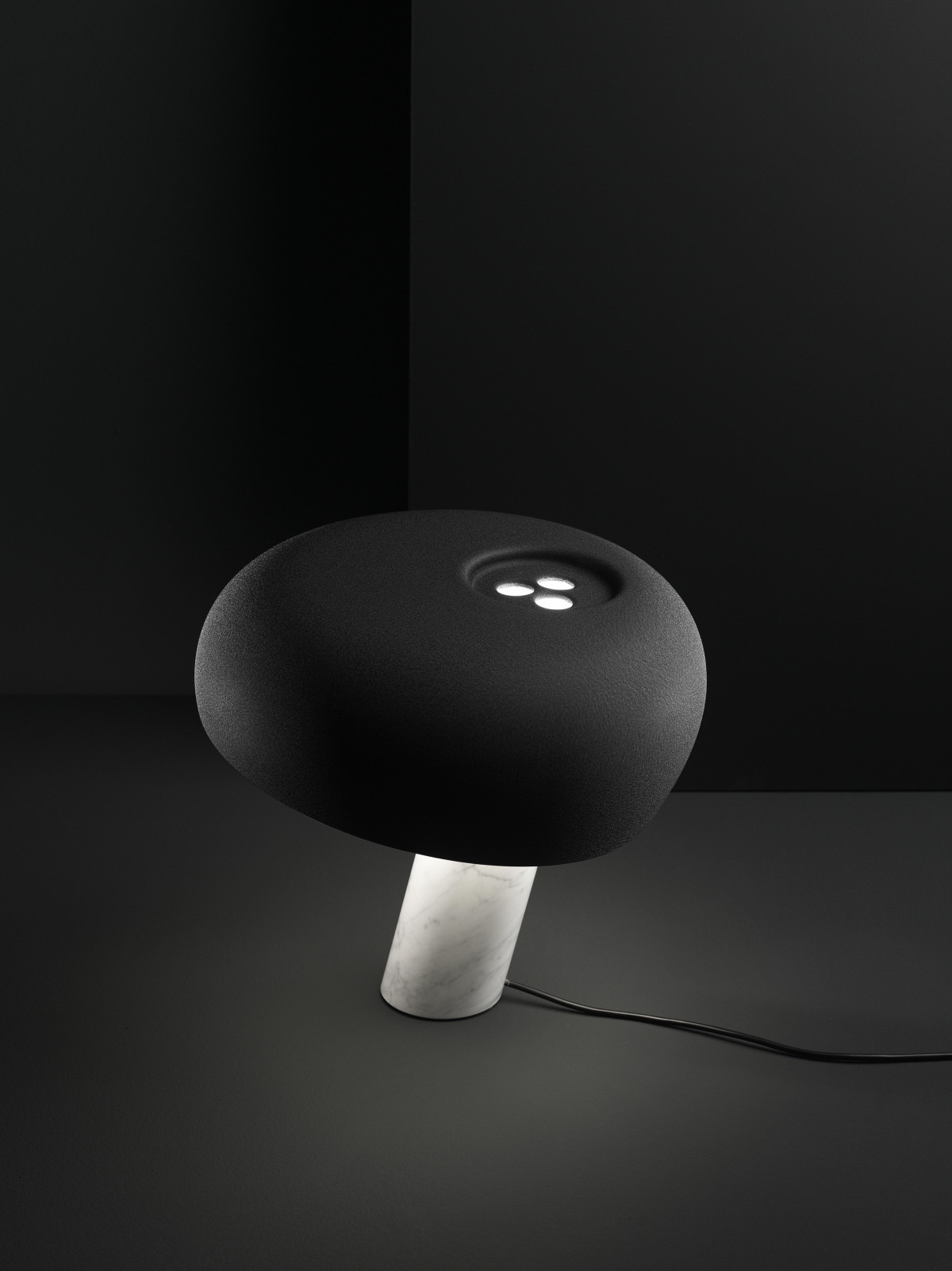 Restano invece identici tutti gli altri dettagli, come la base cilindrica in prezioso marmo bianco venato, obliqua rispetto al piano d’appoggio, su cui è fissato uno spesso disco di cristallo, e i tre fori di raffreddamento del riflettore che ricordano la presa di una palla da bowling.