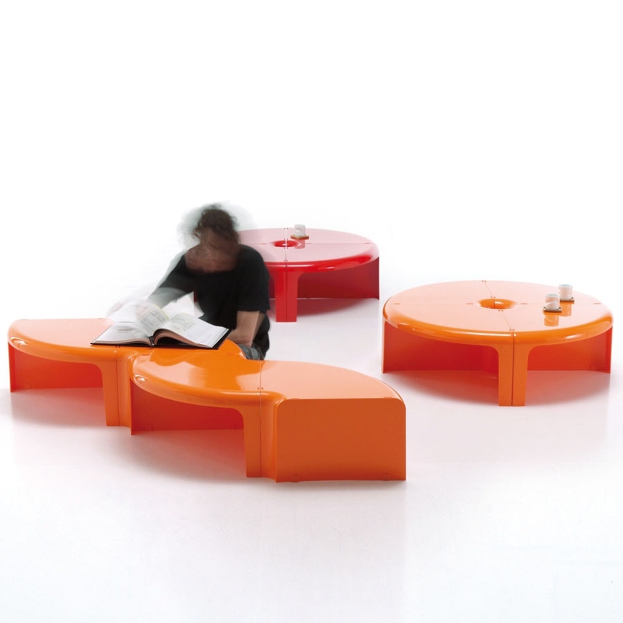 I moduli del tavolino trasformabile 4/4 possono essere uniti a formare un cerchio perfetto oppure secondo una linea serpeggiante.