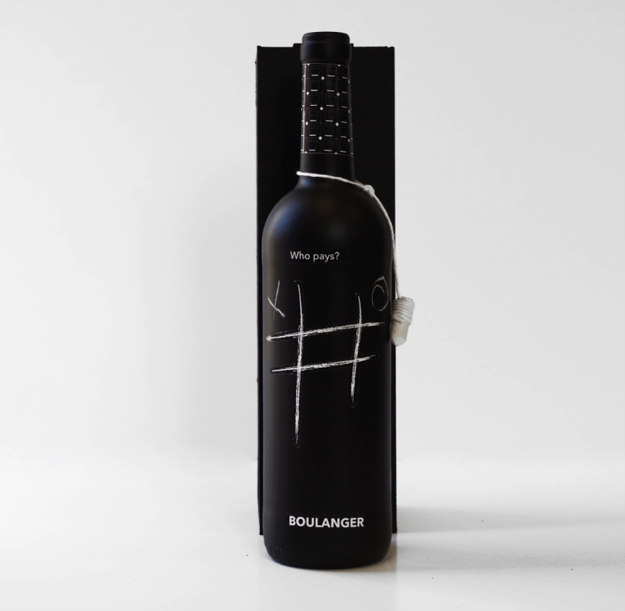 Boulanger di Santiago Arraz, studente di Valencia che risolve in maniera univoca e simpatica il quesito notturno più importante: a chi tocca pagare da bere? Il packaging di questa bottiglia di vino, infatti, fa proprio questo: tramite il gioco del tris, che si gioca scrivendo con il gessetto annodato al collo della bottiglia direttamente su di essa, si può vincere o perdere e, quindi, pagare o non pagare. Certo, dipende da quanto si è bravi a giocare a tris, ma anche dalla quantità di vino bevuto. Non ne avete idea?