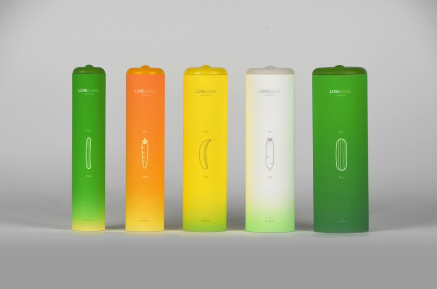 Love Guide Condoms di Guan Hao Pan, del Taiwan. Se non state pensando di diventare genitori la sicurezza durante i rapporti sessuali è fondamentale. Non solo per evitare gravidanze inaspettate, ma anche per proteggersi dalle malattie sessualmente trasmissibili. La scelta errata dei condom porta spesso alla rottura degli stessi e a conseguenze facilmente immaginabili. Ecco quindi che Love Guide Condoms vi potrebbe aiutare: cinque differenti packaging per cinque differenti misure, ognuna delle quali è ispirata ad un frutto o a una verdura. Sei una zucchina, un rafano, una banana, un cetriolo o una carota?