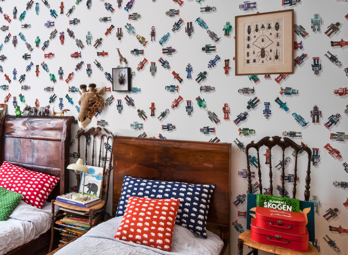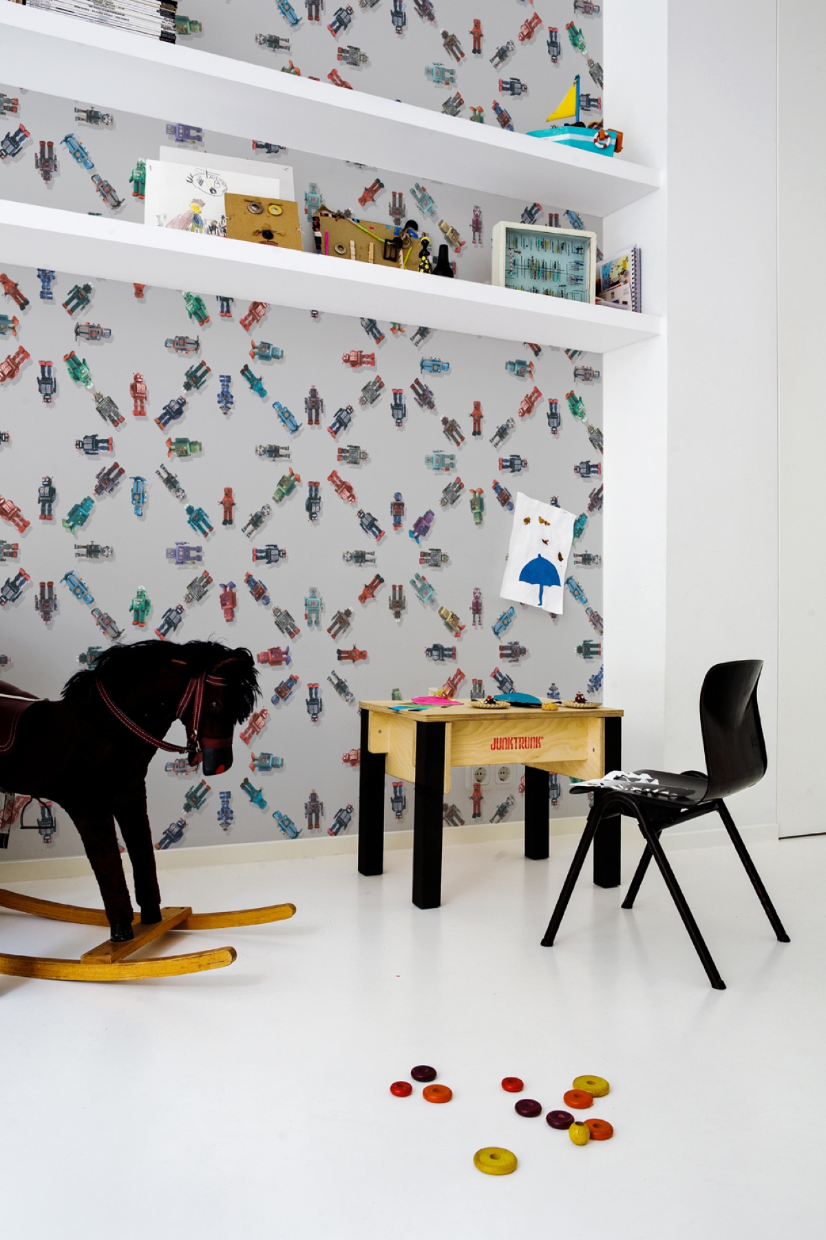 Potremmo denominarle le carte della memoria; è così che la memoria dei luoghi dell’abitare fa ripercorrere al designer i passi della Pop Art applicandone i suoi principi agli oggetti dell’uso quotidiano nell’ambito della funzione dello spazio domestico (carta con i piatti in cucina, rossetti in bagno; robots nella camera dei ragazzi).