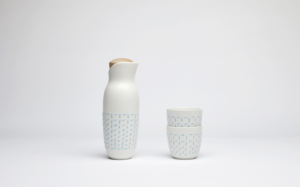 La collezione interpreta accessori di uso comune – caraffe, servizi da tavola, o la tipica tazza per il thè da portare con sé – innestando su forme e funzioni convenzionali citazioni e rimandi ai manifesti del design italiano degli anni ‘80, dove l’elemento pittorico e decorativo diviene un frammento di un quadro in movimento.