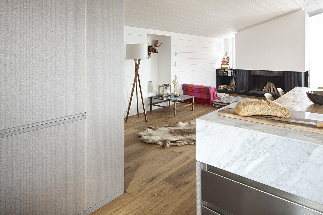 È il caso di questa baita a La Thuile, nota località sciistica sul confine francese della Val D’Aosta, dove l’arch. Francesco Tirimbelli ha ri-progettato in chiave contemporanea un vero e proprio manifesto del costume montanaro, pur conservandone la parte più calda e caratteristica. Il risultato è un ambiente in parte spogliato del calore accentuato della struttura originaria, in favore di colori più tenui, neutri e luminosi, ma dove numerosi restano comunque i richiami al territorio e al familiare gusto alpino. Ne sono un esempio le lampade, i tavoli e gli altri elementi d’arredo in legno grezzo, o la pelliccia riversa sull’assito a pavimento, o ancora decorazioni con la simbologia tipica della montagna.