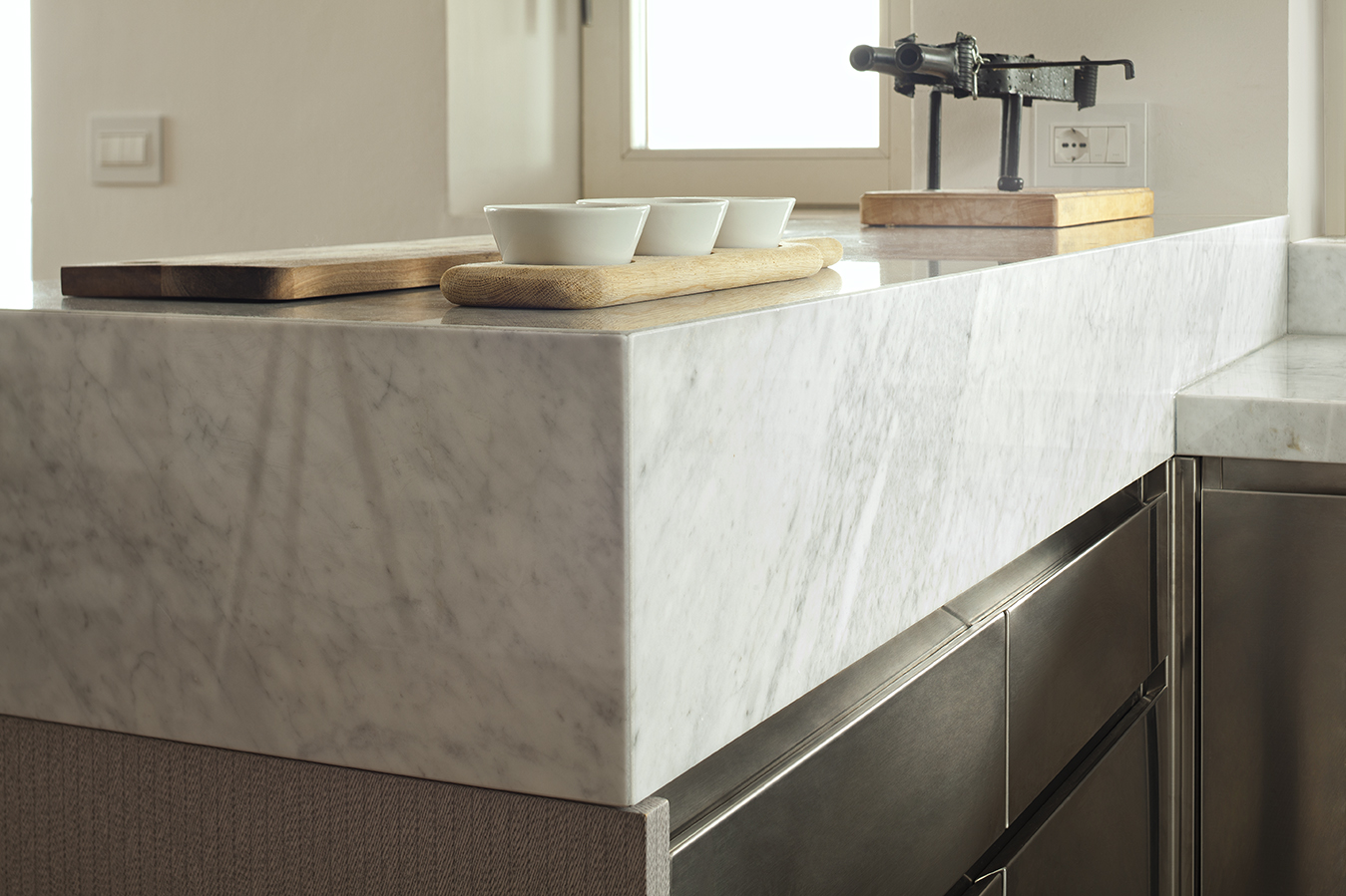 A rendere unico il progetto, il sapiente accostamento dei diversi materiali: la cucina Abimis è infatti qui declinata in un’imponente versione con top in Marmo Bianco di Carrara, che raggiunge nella penisola l’incredibile spessore di 200 mm. A conferire calore al blocco cucina, un rivestimento ligneo reso unico da una micro-texture intrecciata ispirata al mondo tessile. La cucina da elemento funzionale diventa motivo d’arredo, in un tutt’uno con la zona living della quale richiama colori e stile.