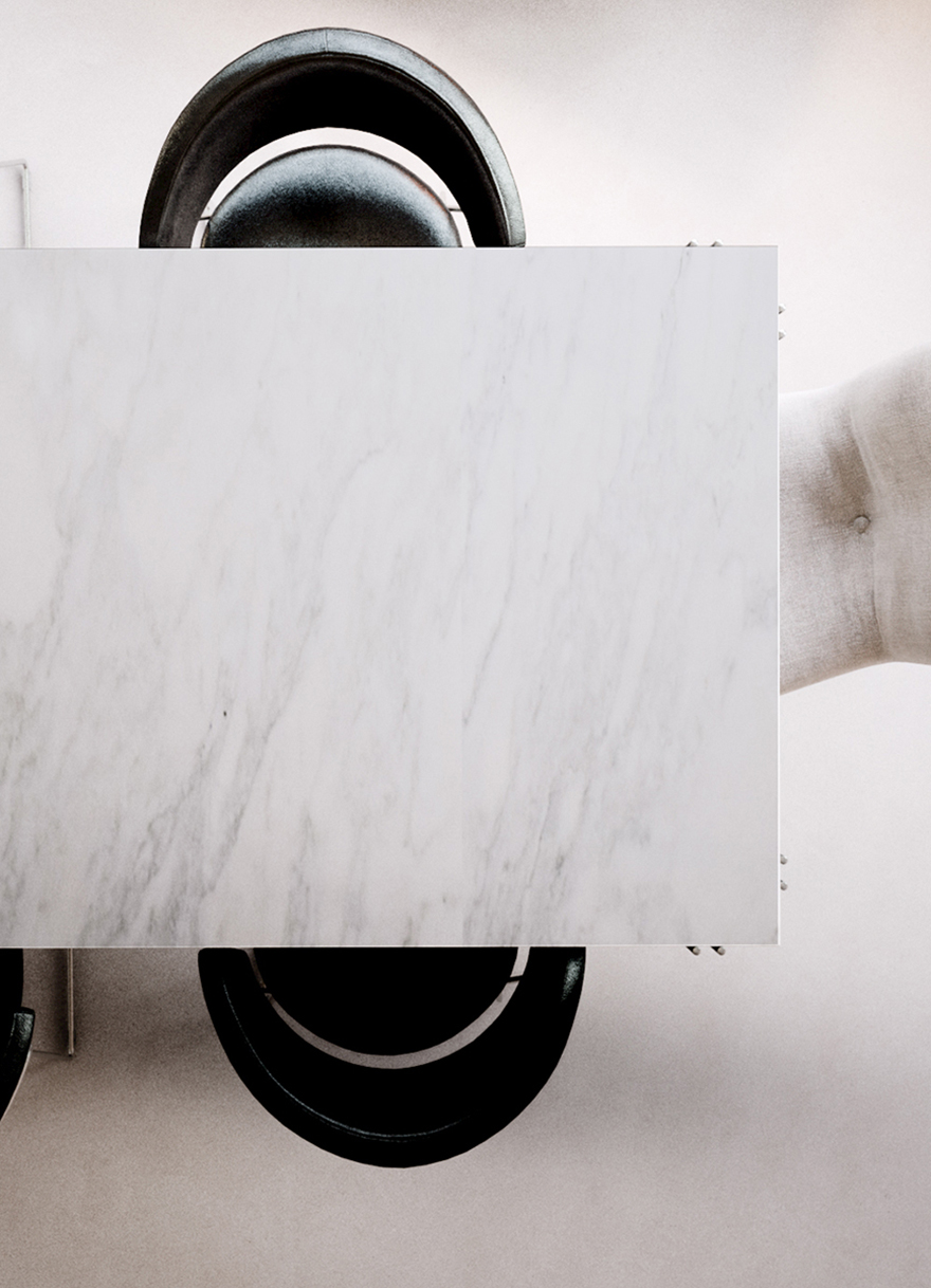 La struttura particolarmente leggera e solida è perfettamente adatta all’uso esterno. Il piano è realizzato in tre diversi materiali, Legno di Quercia, Marmo Calacatta e Cristallo Temperato Ultra Chiaro, tutti i piani hanno uno spessore di 25mm.